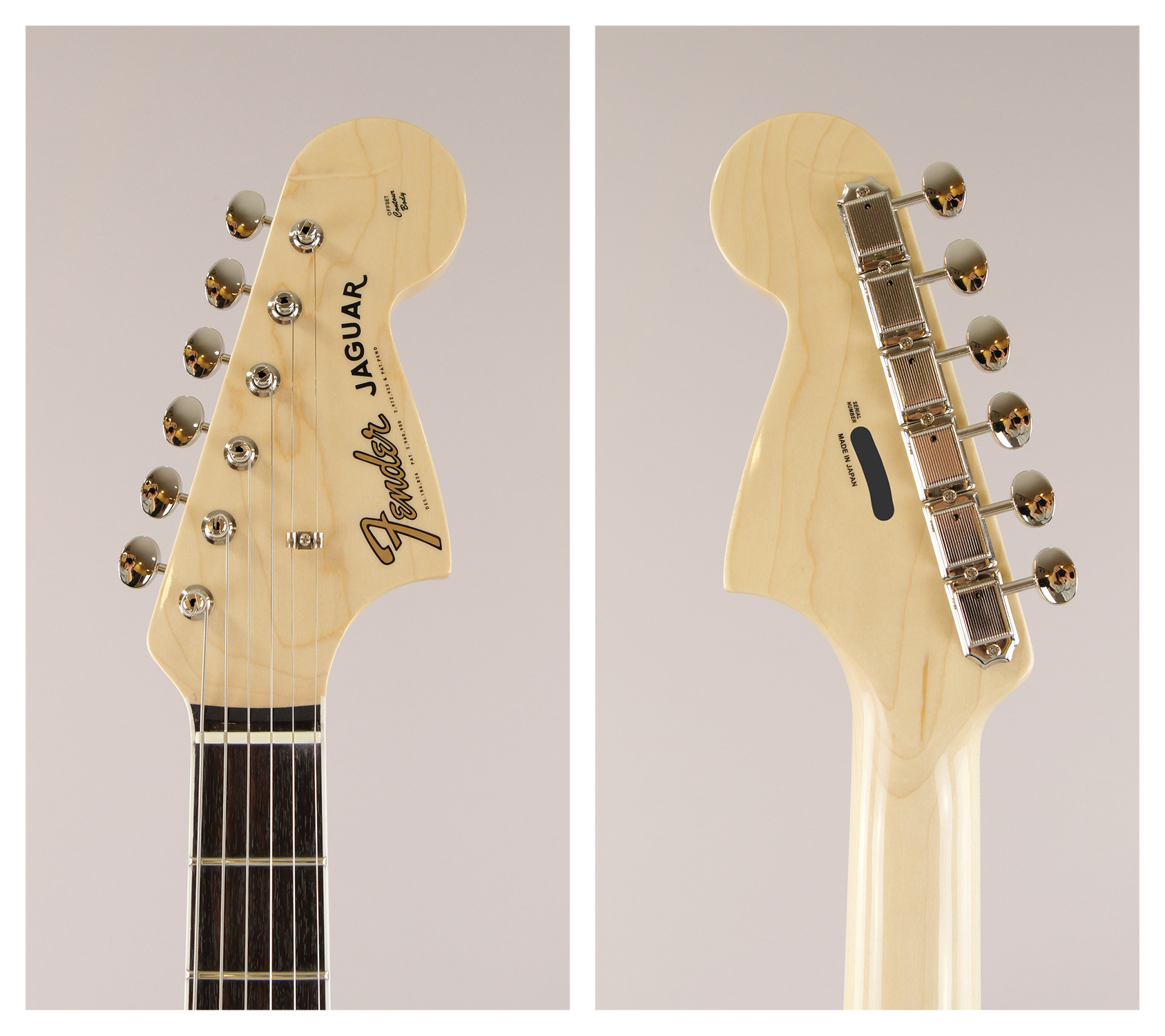 Made in Japan Traditional 60s Jaguar を基に、ボディ材をアルダーに、ピックアップをPure Vintage '65 Single-Coil Jaguarにアップグレード、ネックシェイプをMid '60s "C"、指板Rをヴィンテージ同様に7.25Radius、フレットをミディアム・ジャンボ・サイズ変更、ブリッジ・サドルを弦ズレの少ないムスタング・タイプに変更。