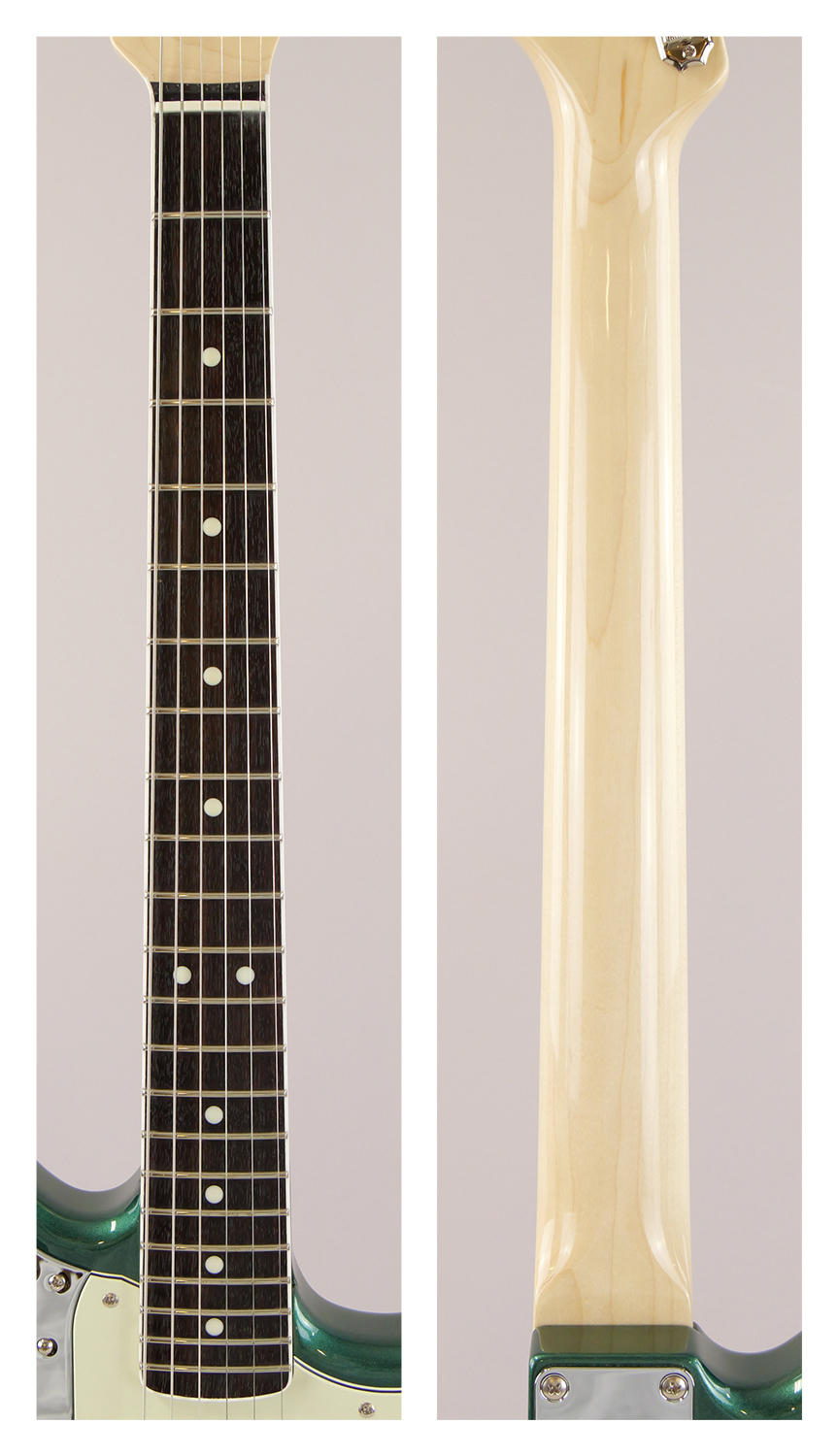 シャーウッド・グリーン・メタリック、1964-1965の過渡期に使用されていたドット・ポジション・マーク、ネック・バインディングを再現。