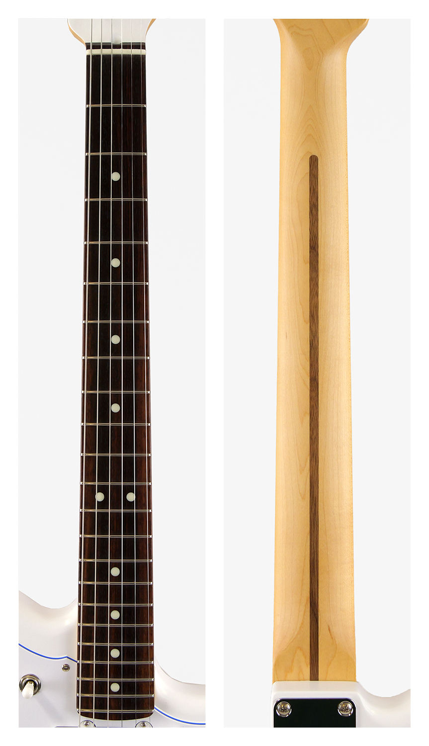 サテン仕様のホワイトなボディに、目を引くブルーのセンターレイヤーを纏った3-Plyホワイトピックガードを搭載しており、ボディとマッチングさせたヘッドに輝くブルーメタルロゴと相まって軽快な雰囲気を醸し出します。 プラスチックパーツも全てホワイトで統一することで、より純白さを際立たせます。