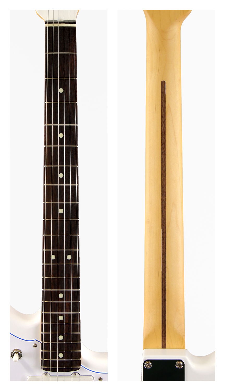 サテン仕様のホワイトなボディに、目を引くブルーのセンターレイヤーを纏った3-Plyホワイトピックガードを搭載しており、ボディとマッチングさせたヘッドに輝くブルーメタルロゴと相まって軽快な雰囲気を醸し出します。 プラスチックパーツも全てホワイトで統一することで、より純白さを際立たせます。