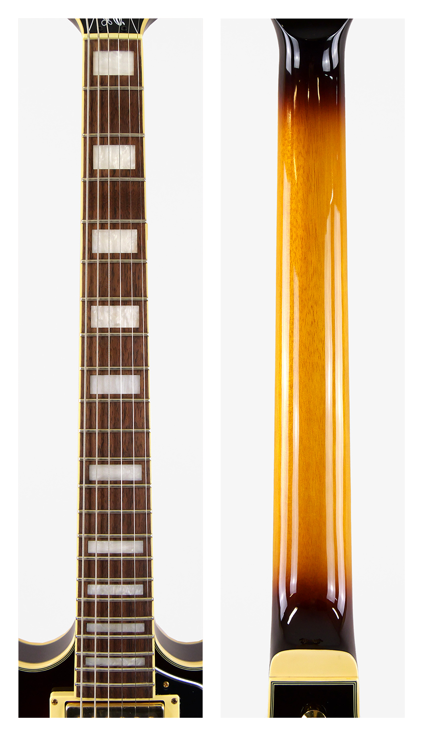トップには美しいフレイム・メイプル材を使用。ステージで存在感を放つ、深みのあるツートン・バーストカラーも魅力です。