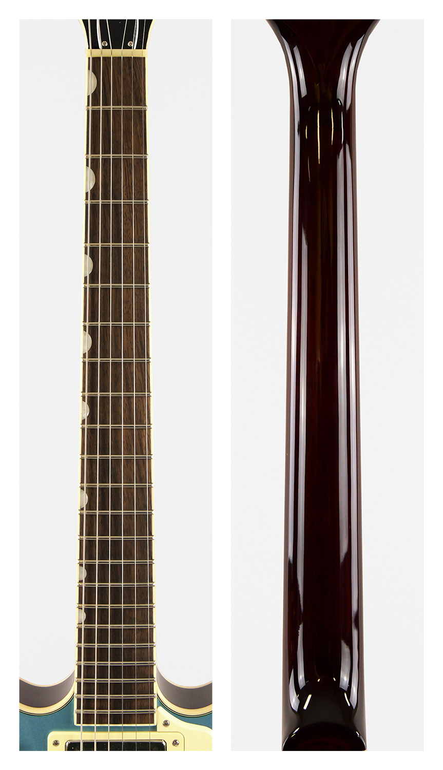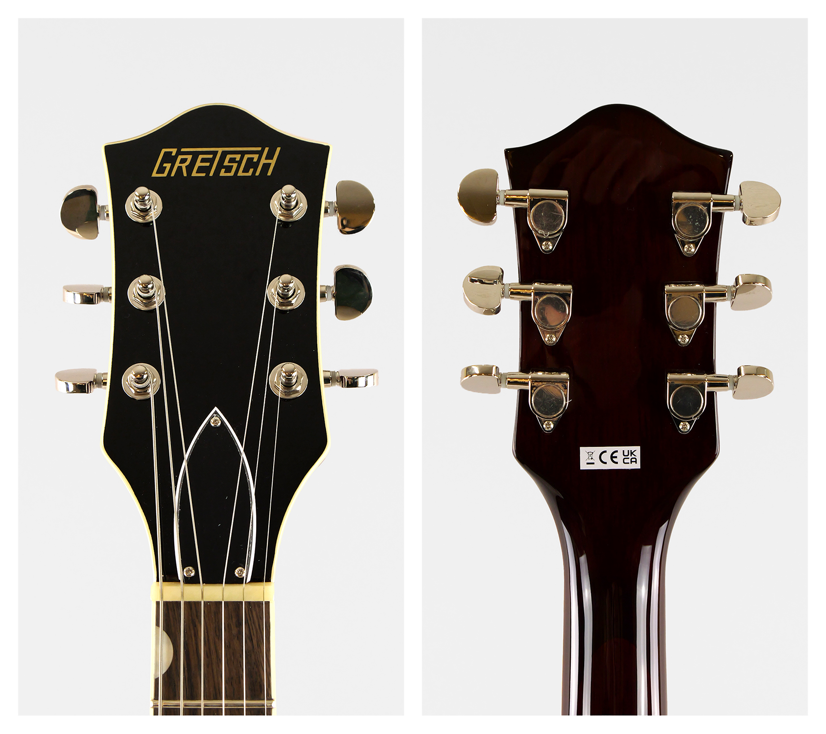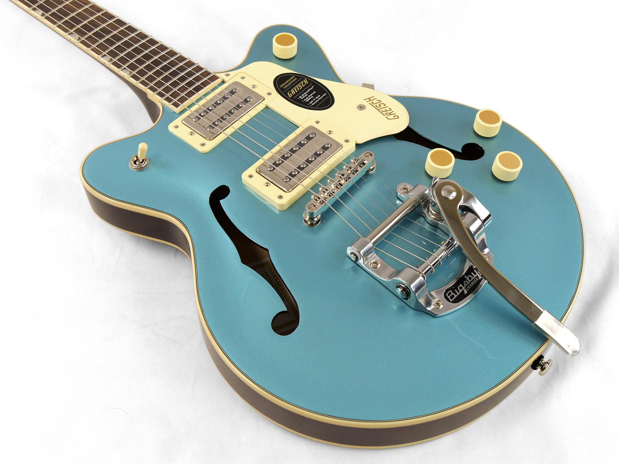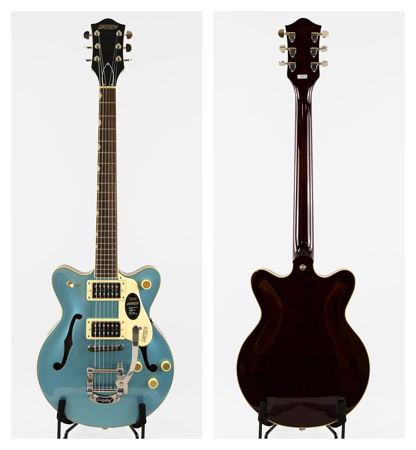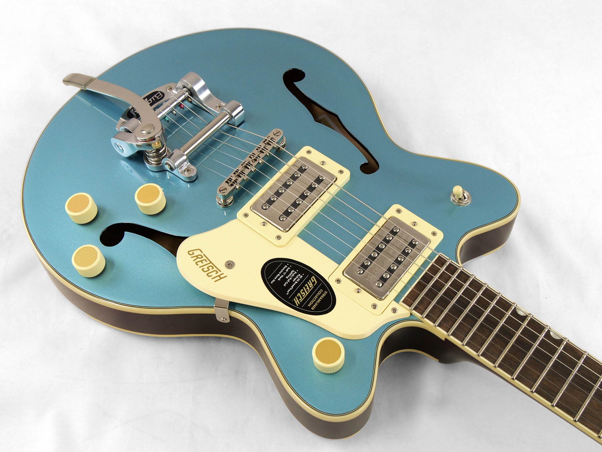 新しいセンターブロックデザインのメイプルボディ G2655T Center Block Jr.は、小さめのアーチドメイプルボディに、新しいセンターブロックデザインを採用しています。この新しいセンターブロックは、軽量で快適な演奏性と存在感のあるフルでリッチなサウンドを両立するように設計されており、アタックとサスティンを向上させ、優れたフィードバック抑制効果を、重さを感じさせない快適なギターにまとめ上げています。