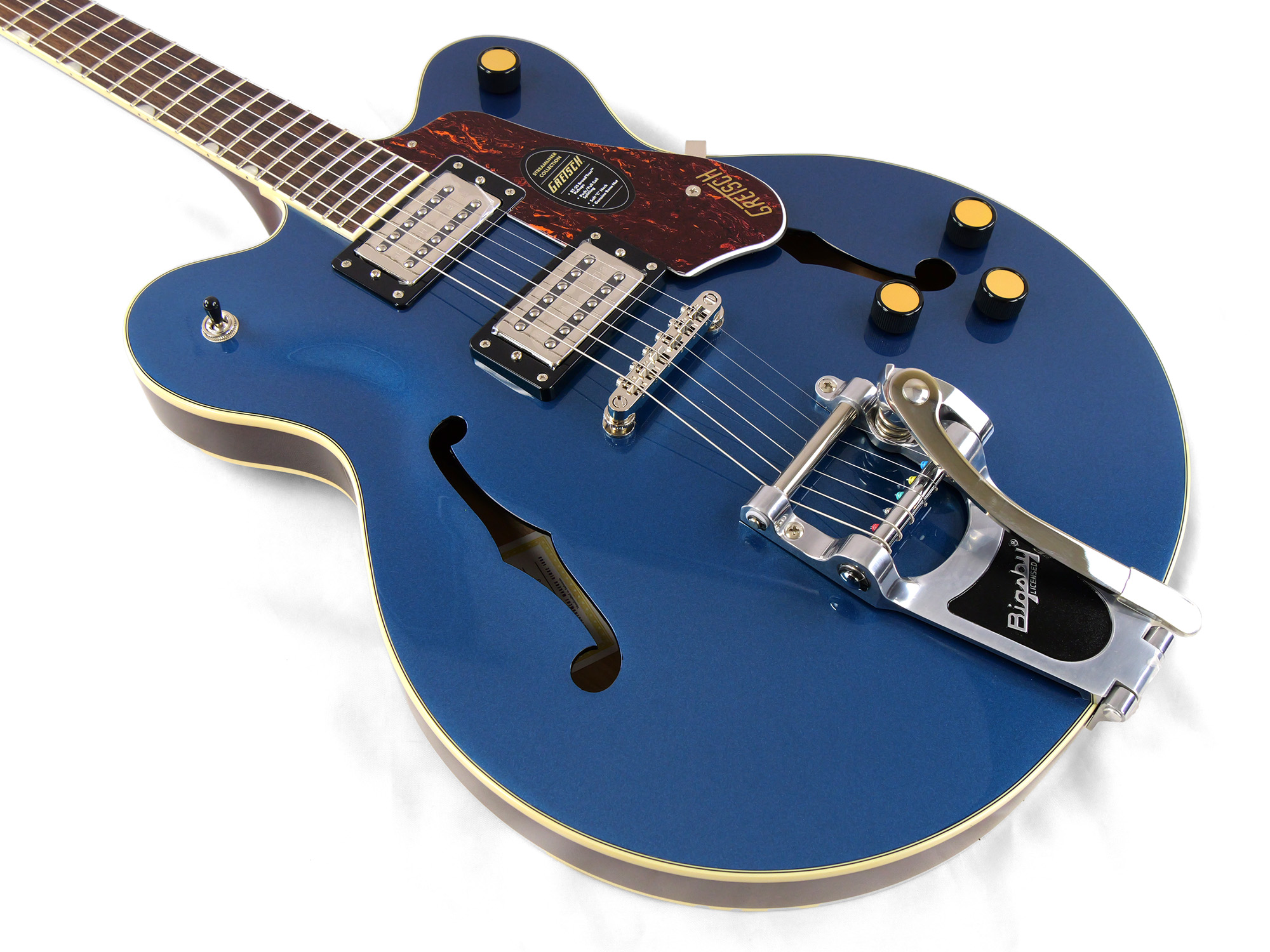 Streamlinerのパワフルなサウンドは、ネックとブリッジピックアップのボリュームコントロール、マスタートーンコントロール、マスターボリュームコントロール、3ウェイピックアップスイッチングという伝統的なコントロールレイアウトによって引き出されます。