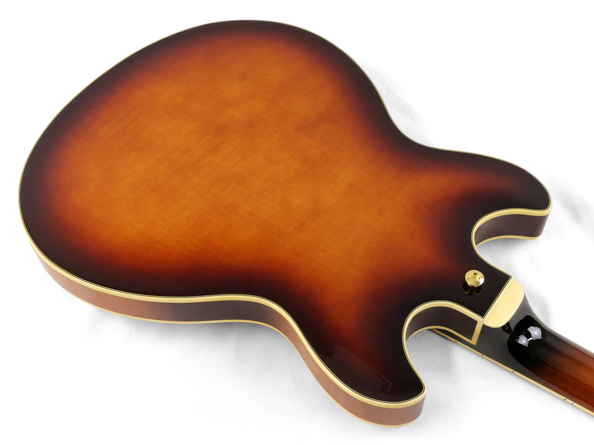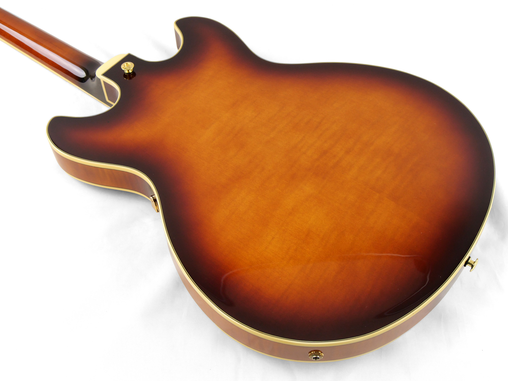 ボディ全体を覆うフレイム・メイプルの豪華な木目が特徴です。深みのあるヴァイオリン・サンバーストと、ゴールドパーツの組み合わせが、ステージで際立つ存在感を演出します。