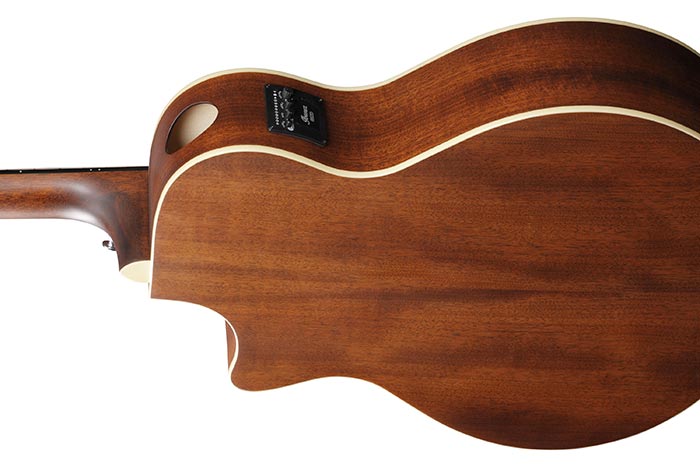 本モデルでは、最深部で通常のAEボディ(約120mm)よりもおおよそ5mmほど薄く、胴鳴りを確保しながら小柄なプレイヤーにも抱えやすい設計を採用しています。
