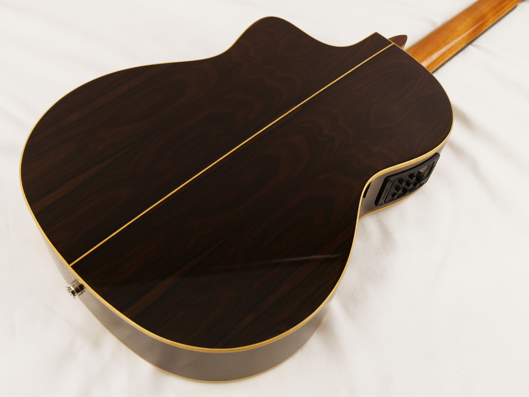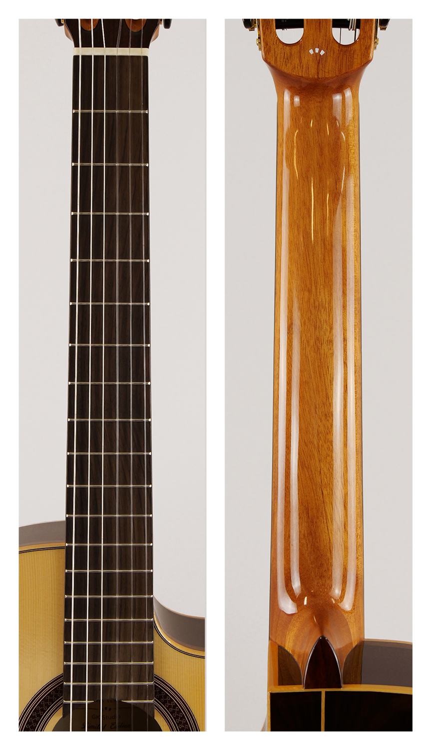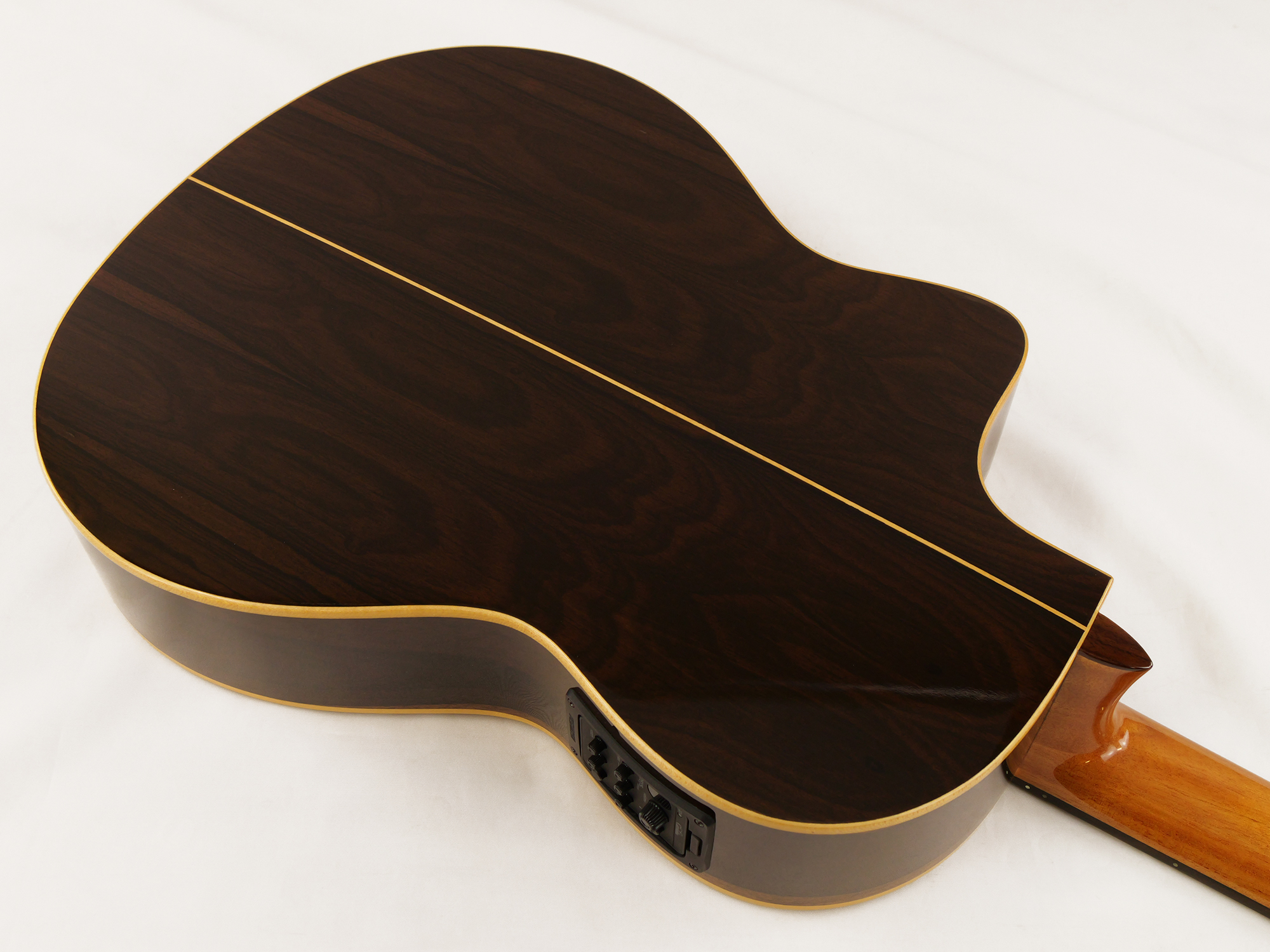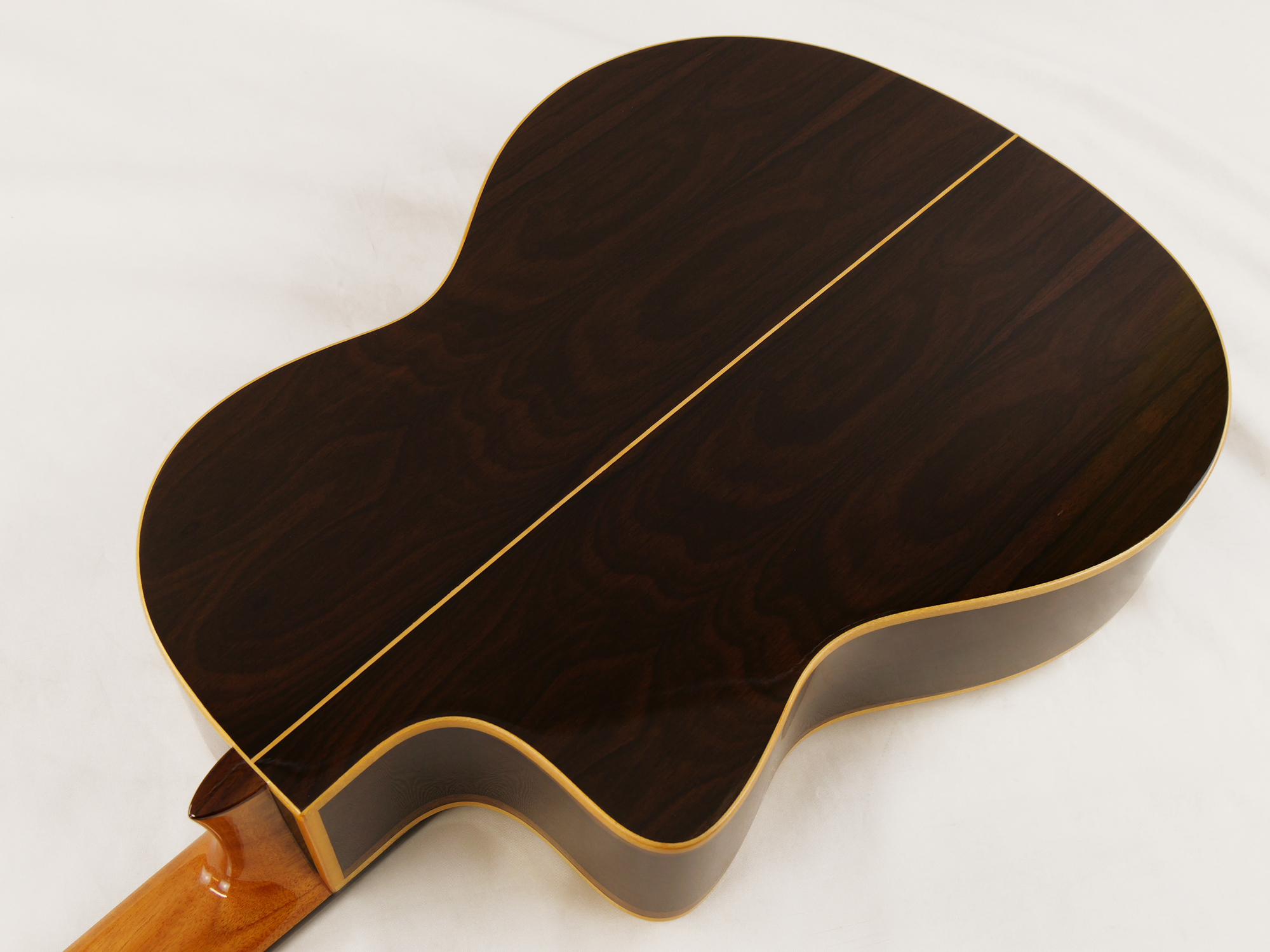 ソリッド・ヨーロピアン・スプルースをトップに、印象的な模様を持つジリコテをバック&サイドに使用した、実にステージ映えのするフラメンコギターです。ジリコテは温かみのある豊かでなめらかなサウンドを提供します。