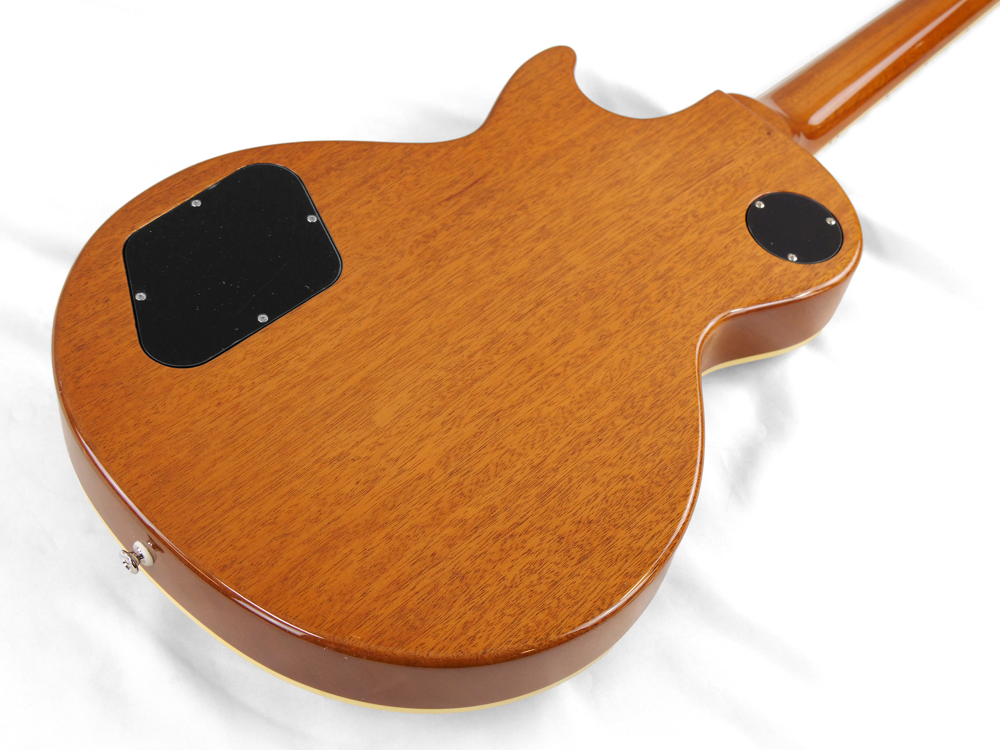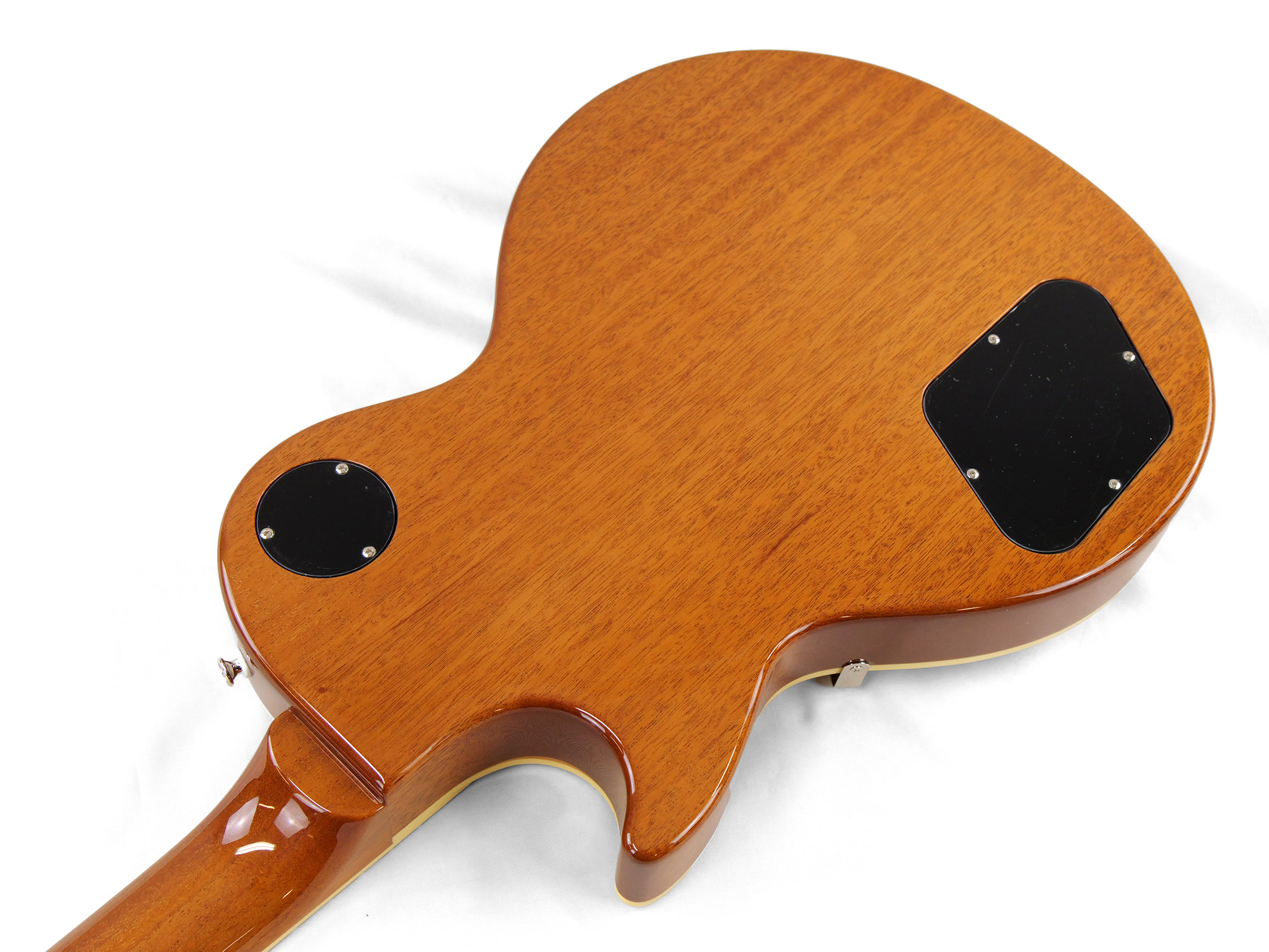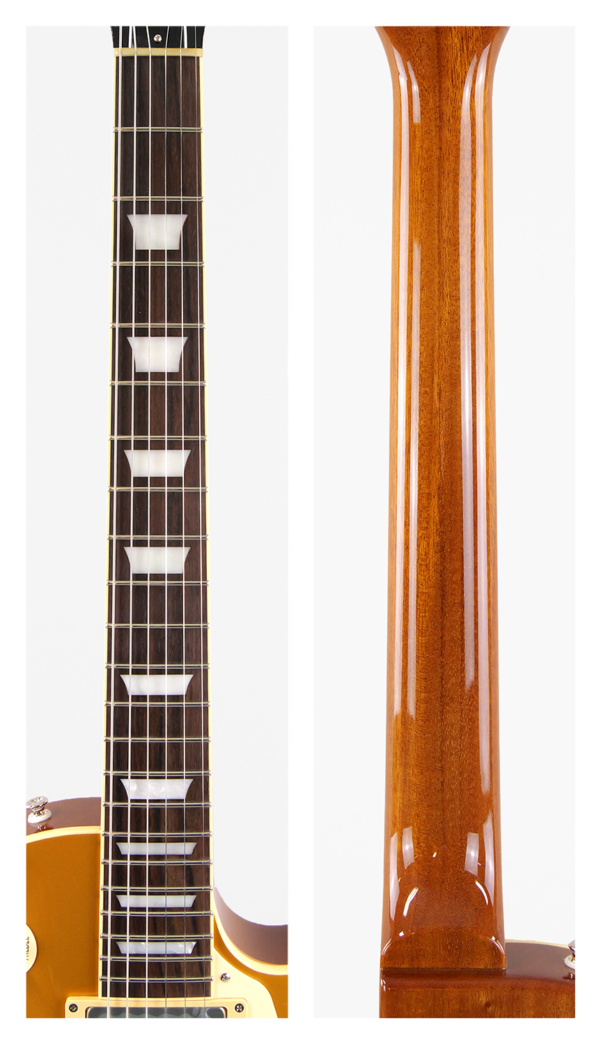 メイプルをトップにラミネートした王道のレスポール・スタンダード・スタイル。ネックとボディの接合には伝統的なニカワ接着が採用されており、セットネックならではの響きの一体感がしっかりと感じられます。