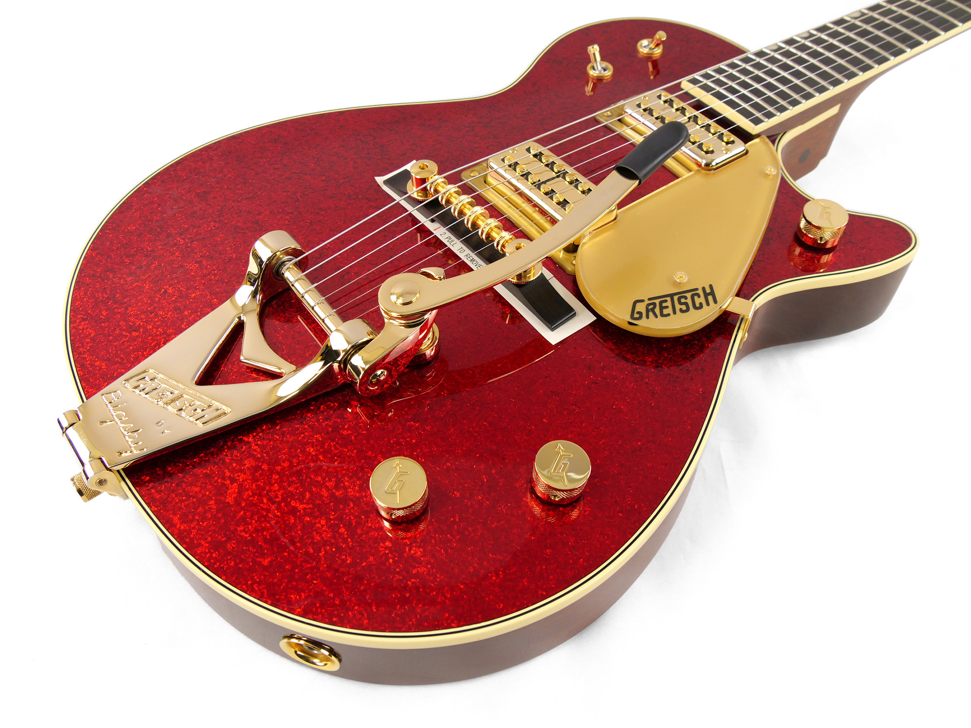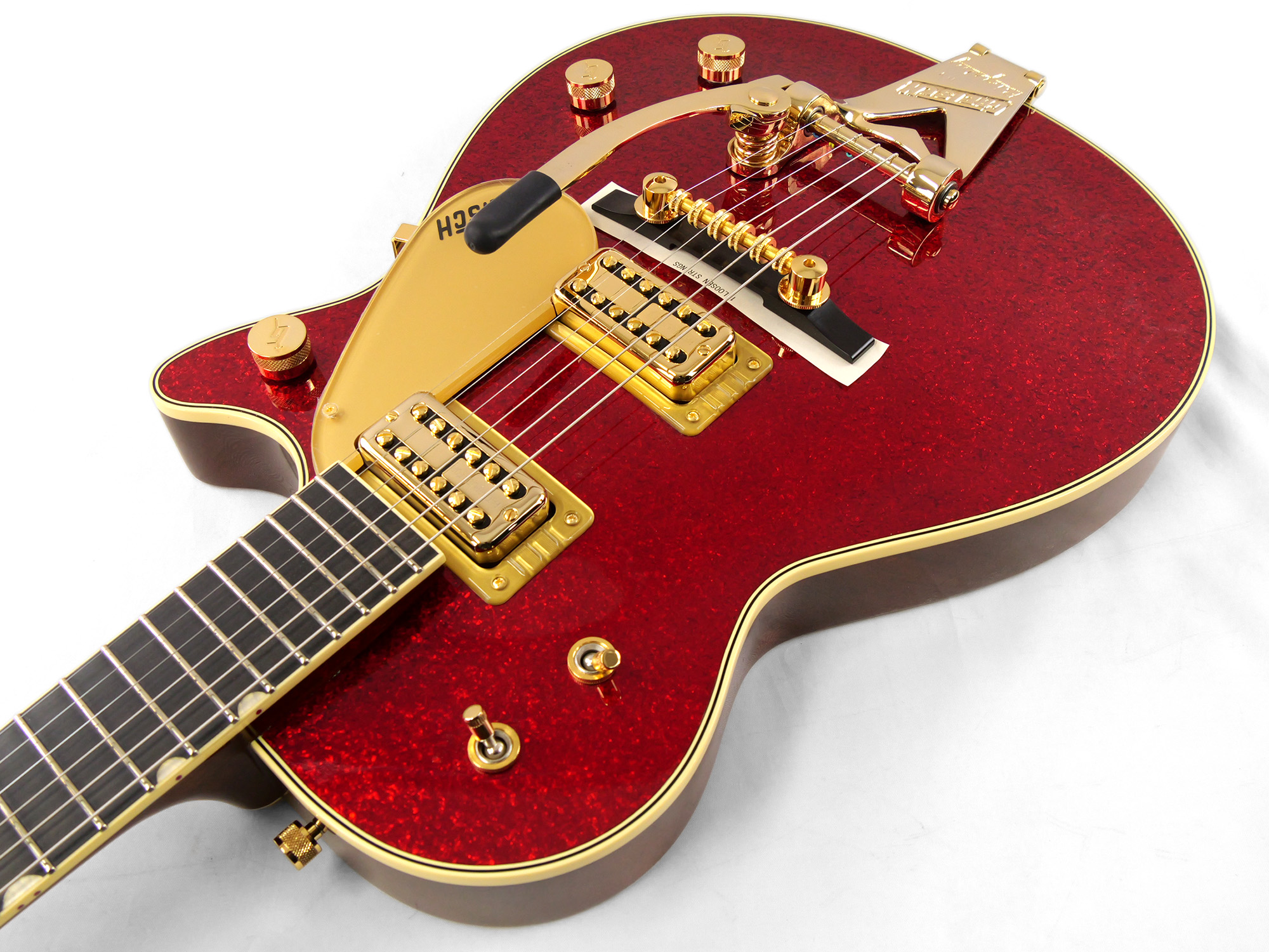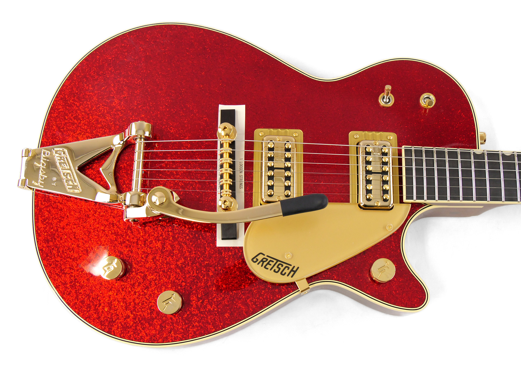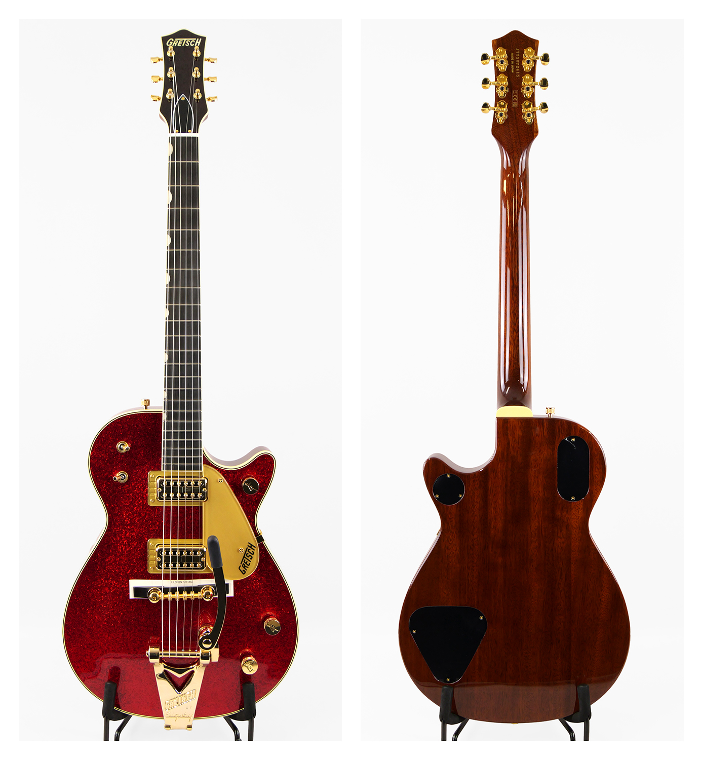 Sparkle Jetは、Duo Jetをさらに煌びやかなフィニッシュで仕上げたタイムレスなモデルで、チェンバー加工されたマホガニーボディによって得られるパワフルでパンチの効いたサウンドが特徴です。トップとボディの間で空気が共鳴することで倍音豊かな響きを増幅し、より生き生きとして明瞭なトーンを奏でます。Filter'Tron ピックアップは1959年にJetに初めて搭載されたピックアップのサウンドは、この限定モデルに採用された2基のTV Jones Ray Butts Ful-Fidelityピックアップによってかつてないほど正確に再現されています。