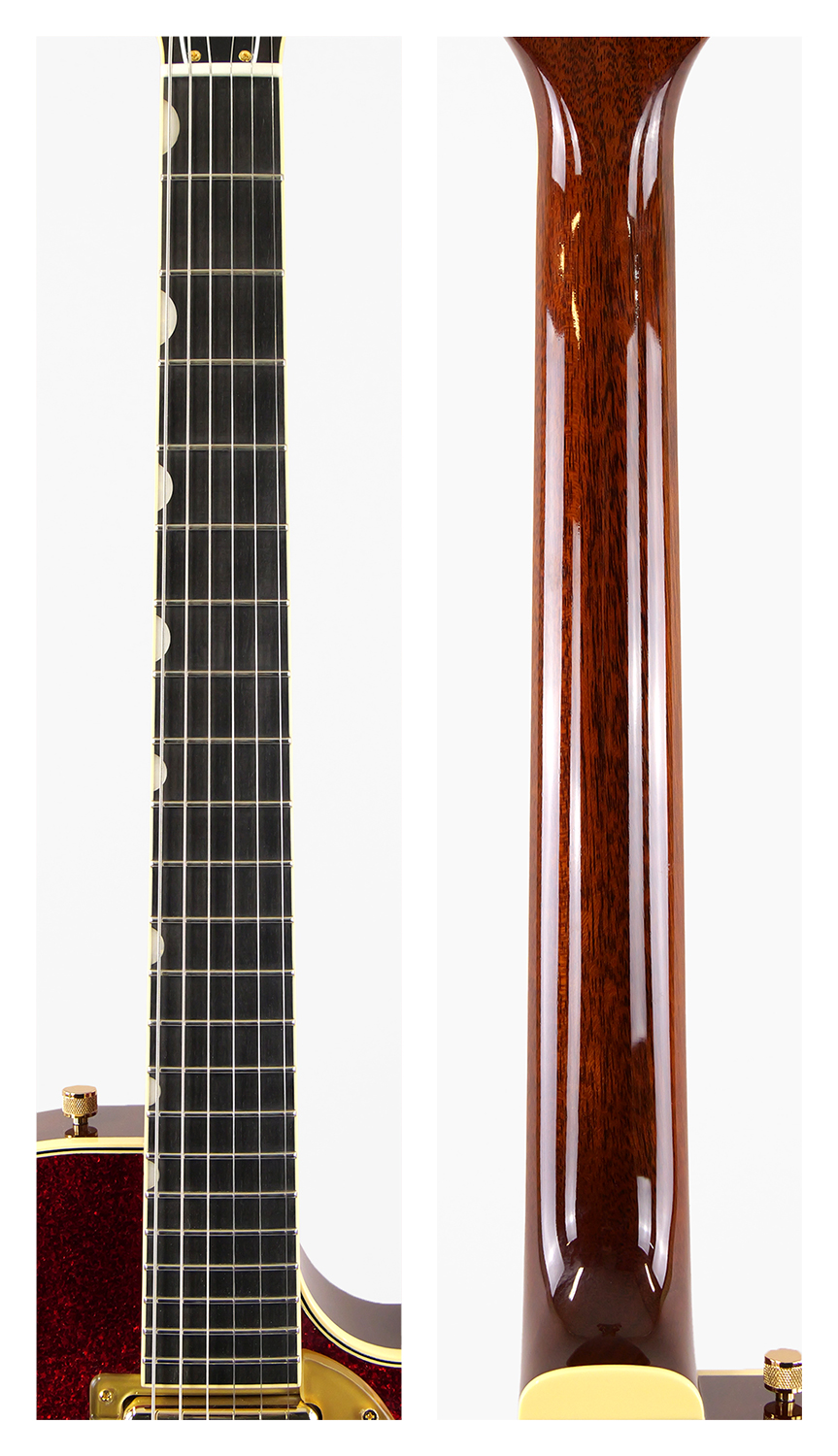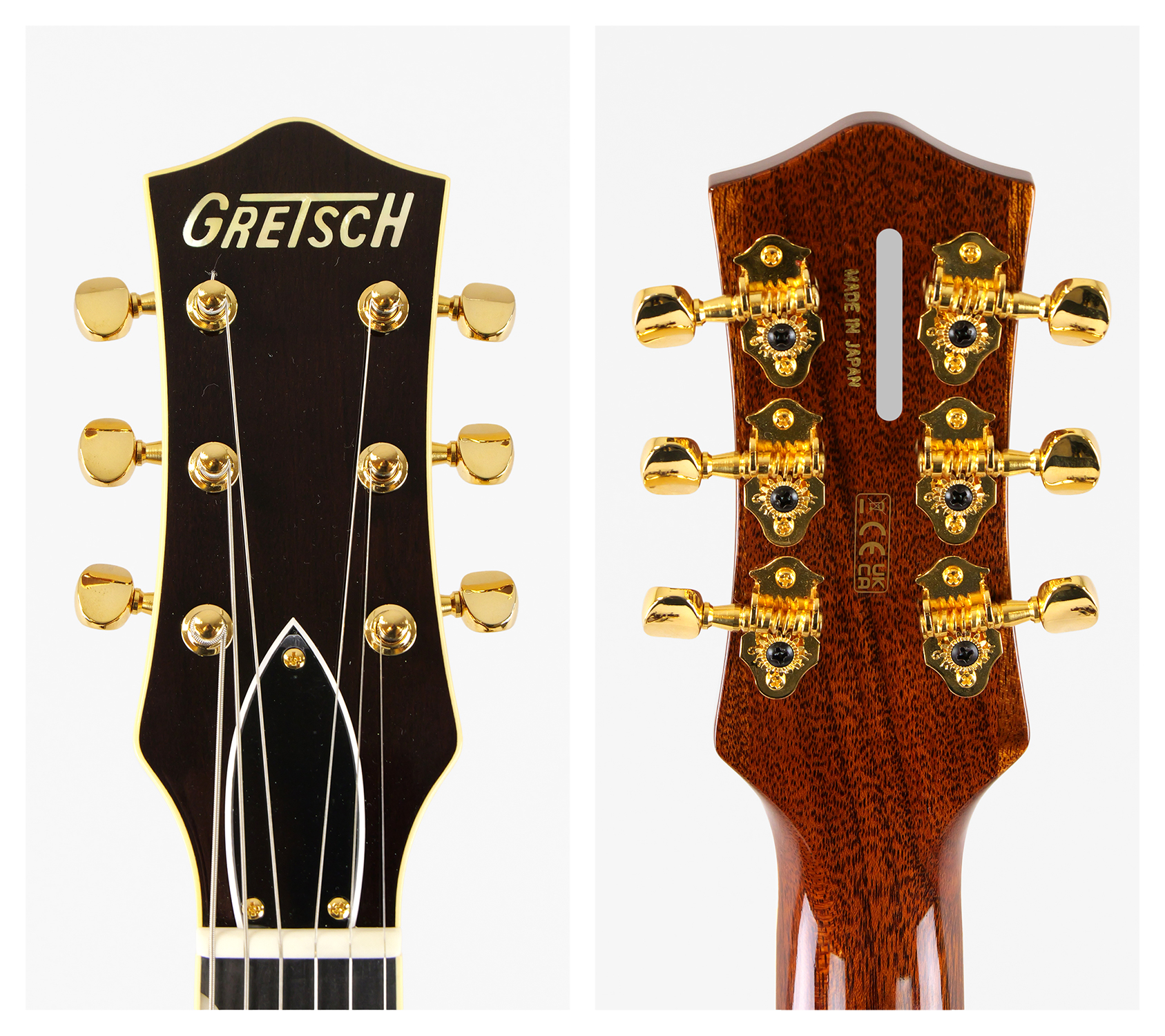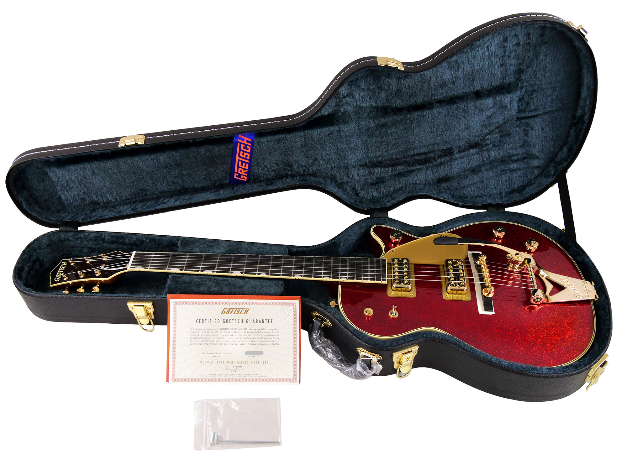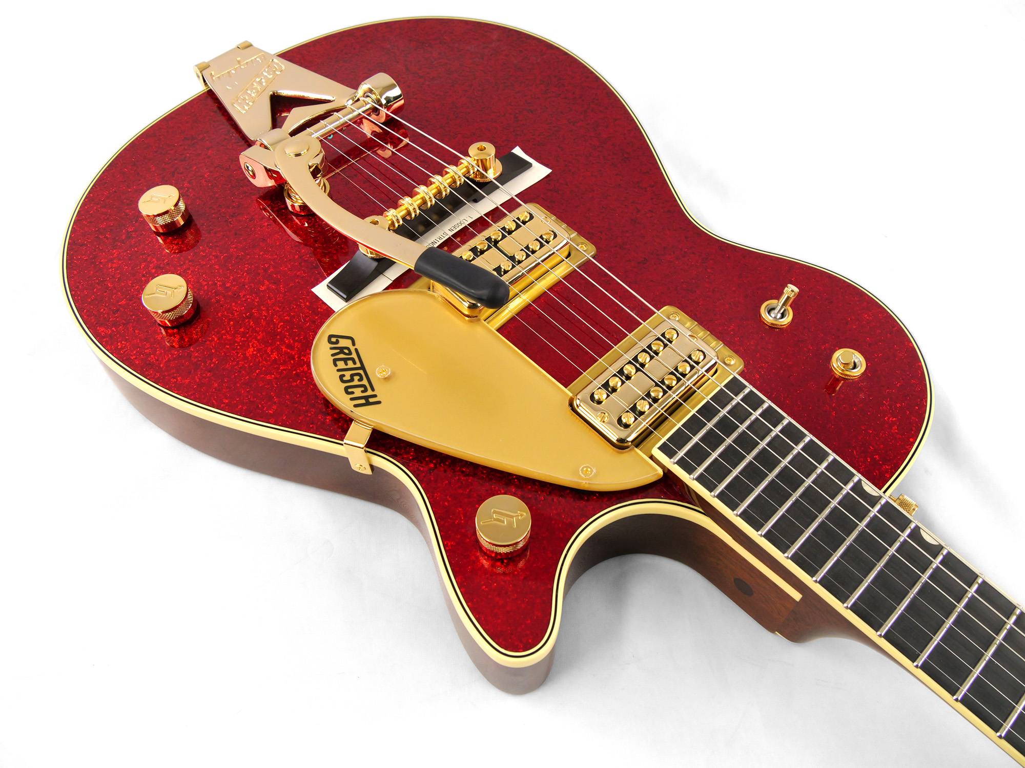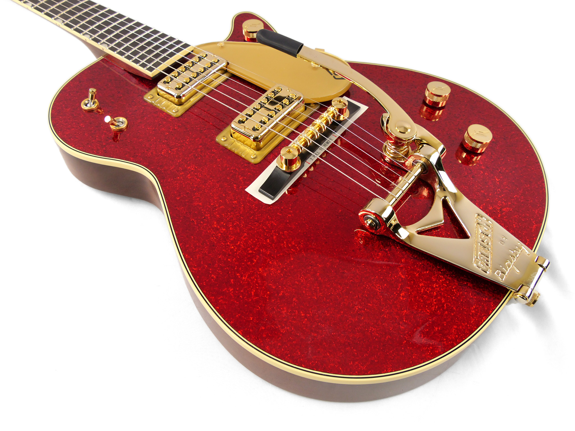 Sparkle Jetは、Duo Jetをさらに煌びやかなフィニッシュで仕上げたタイムレスなモデルで、チェンバー加工されたマホガニーボディによって得られるパワフルでパンチの効いたサウンドが特徴です。トップとボディの間で空気が共鳴することで倍音豊かな響きを増幅し、より生き生きとして明瞭なトーンを奏でます。Filter'Tron ピックアップは1959年にJetに初めて搭載されたピックアップのサウンドは、この限定モデルに採用された2基のTV Jones Ray Butts Ful-Fidelityピックアップによってかつてないほど正確に再現されています。