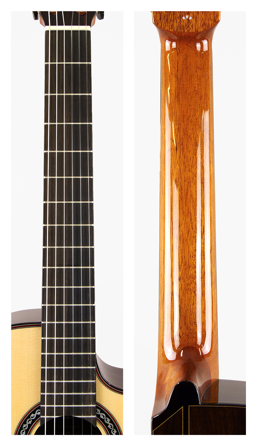 - ブレイシング : Spanish heel neck joint & fan bracing, Flamenco style build