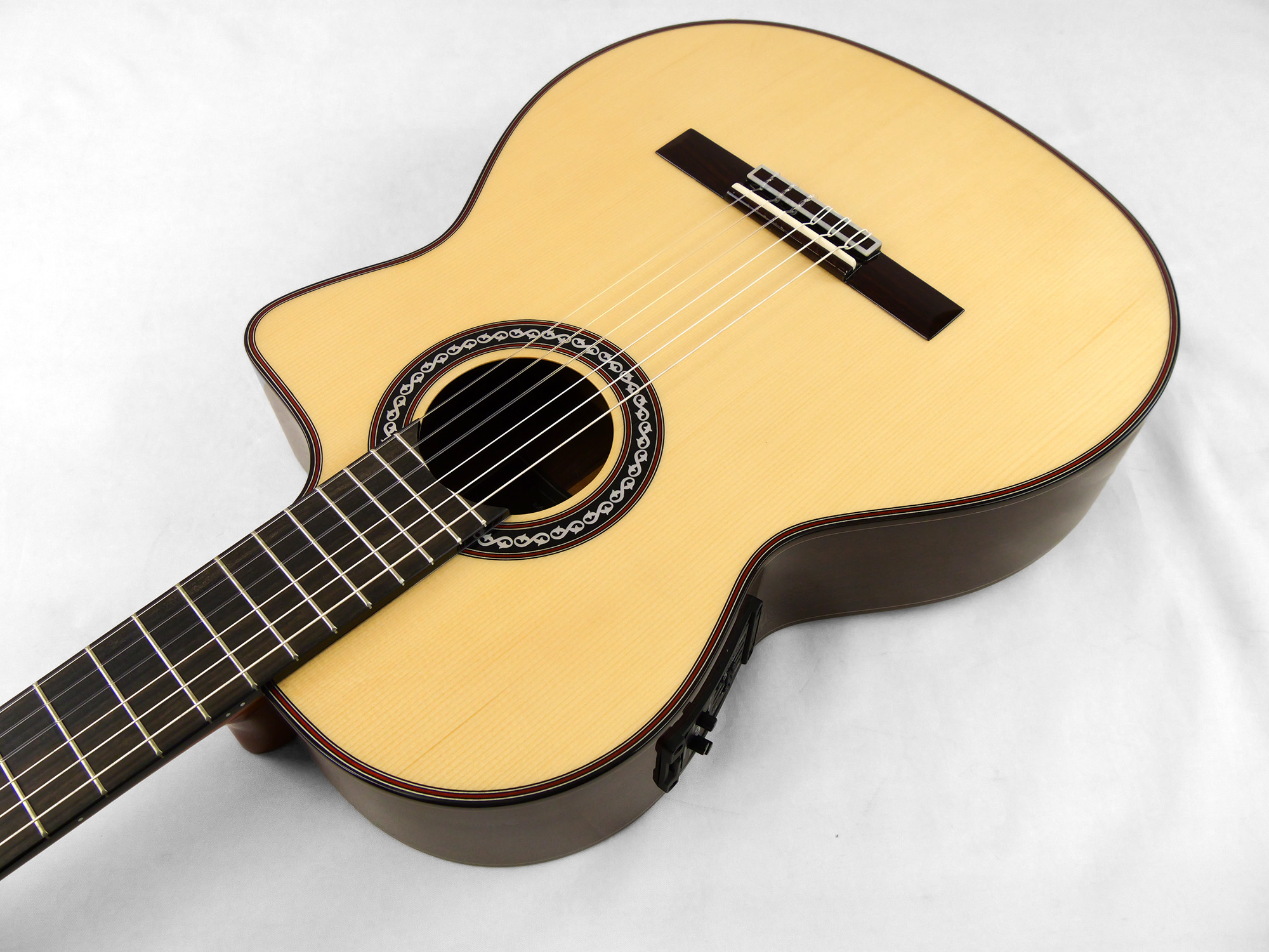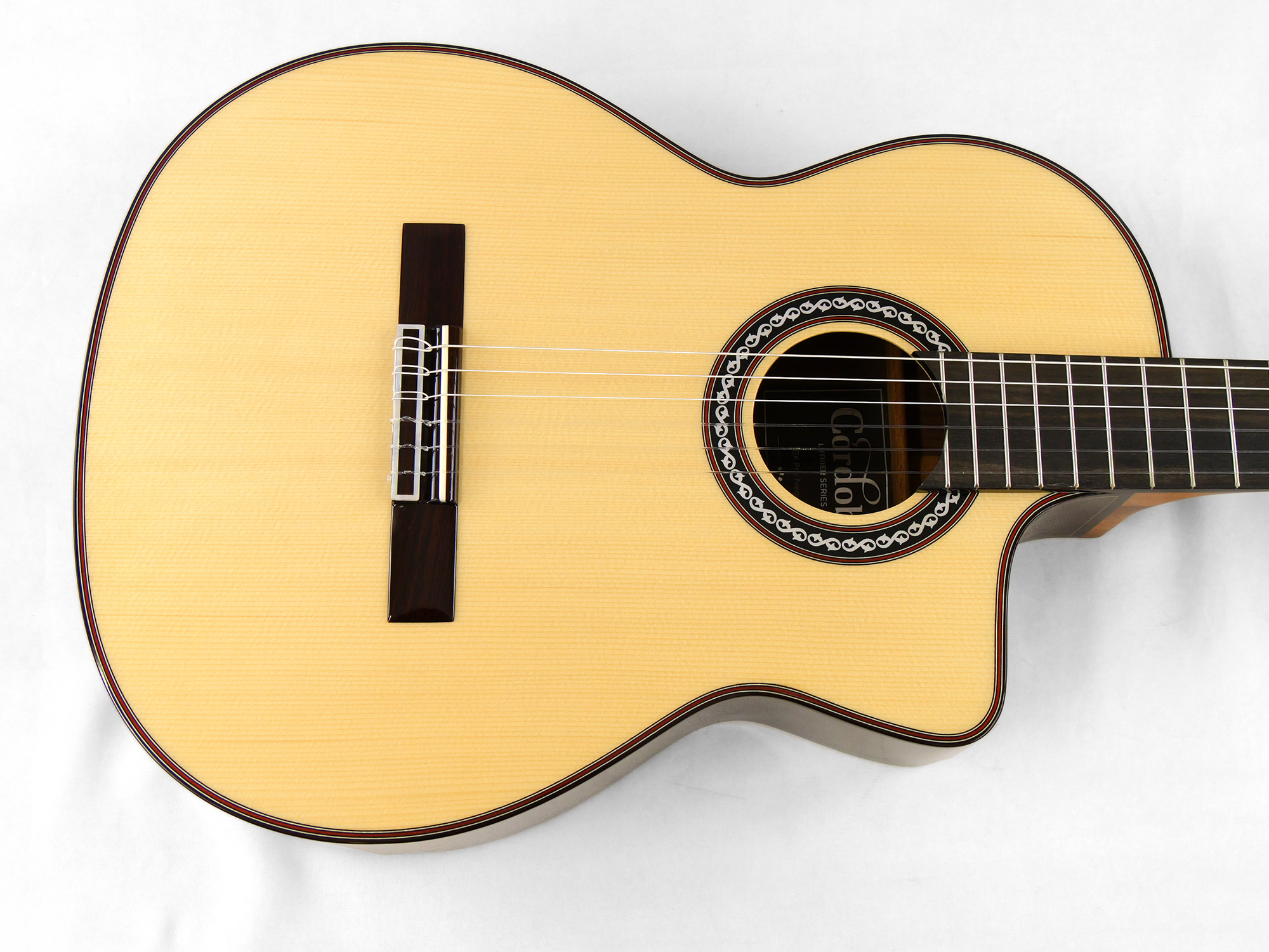 GK Pro NegraはCordobaのベストセラーのひとつであるGK Studio Negraの上位機種で、オールソリッドギターです。スリムなネックとCutawayにより幅広い演奏が可能になり、伝統のフラメンコギターのスナッピートーンを作り出す低い弦高にセットアップされています。ソリッドインディアンローズウッドのバック&サイドはバランスのとれたトレブルと共にリッチなベーストーンなど音色に新たな深みを加えています。Fishman’s Prefix Problend on-board electronics 3-band EQ仕様。湿度や気温によるネックの変化に対応可能なアジャスタブル・ロッド仕様です。