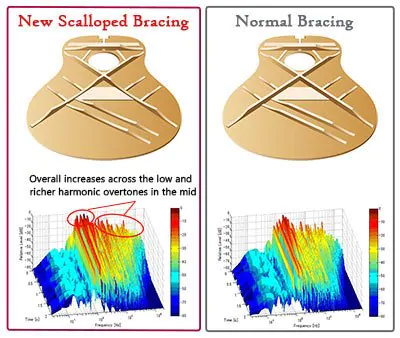 ヤマハギターチームが新しく開発した木工加工技術により、中低音域における音量を強化し、パワフルなサウンドを実現。設計者たちは、過去の経験や推測に基づいた開発ではなく、音の実験、解析をとことん行い、科学的に音の進化を解明。その解析から新たなデザインのブレイシングに到達し、音の肝である表板の耐久性を維持しながら、かつてない表現力をもった音を生み出しました。