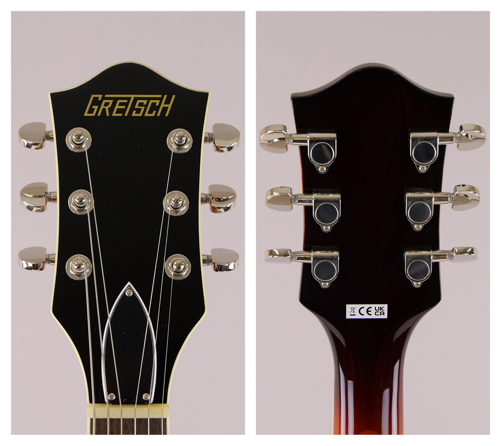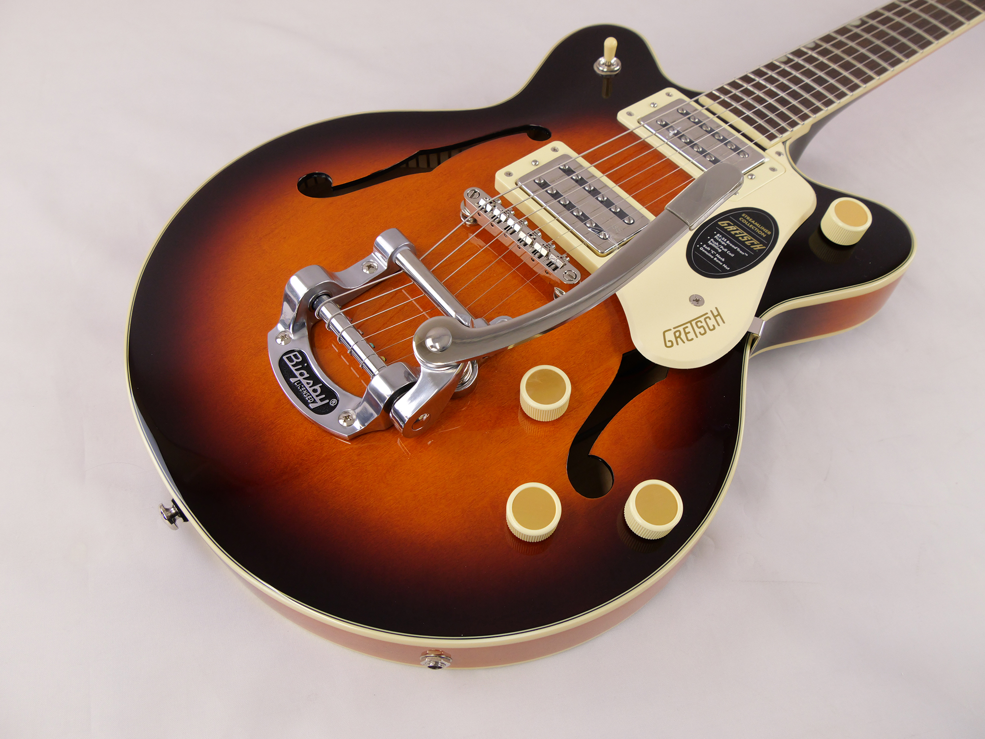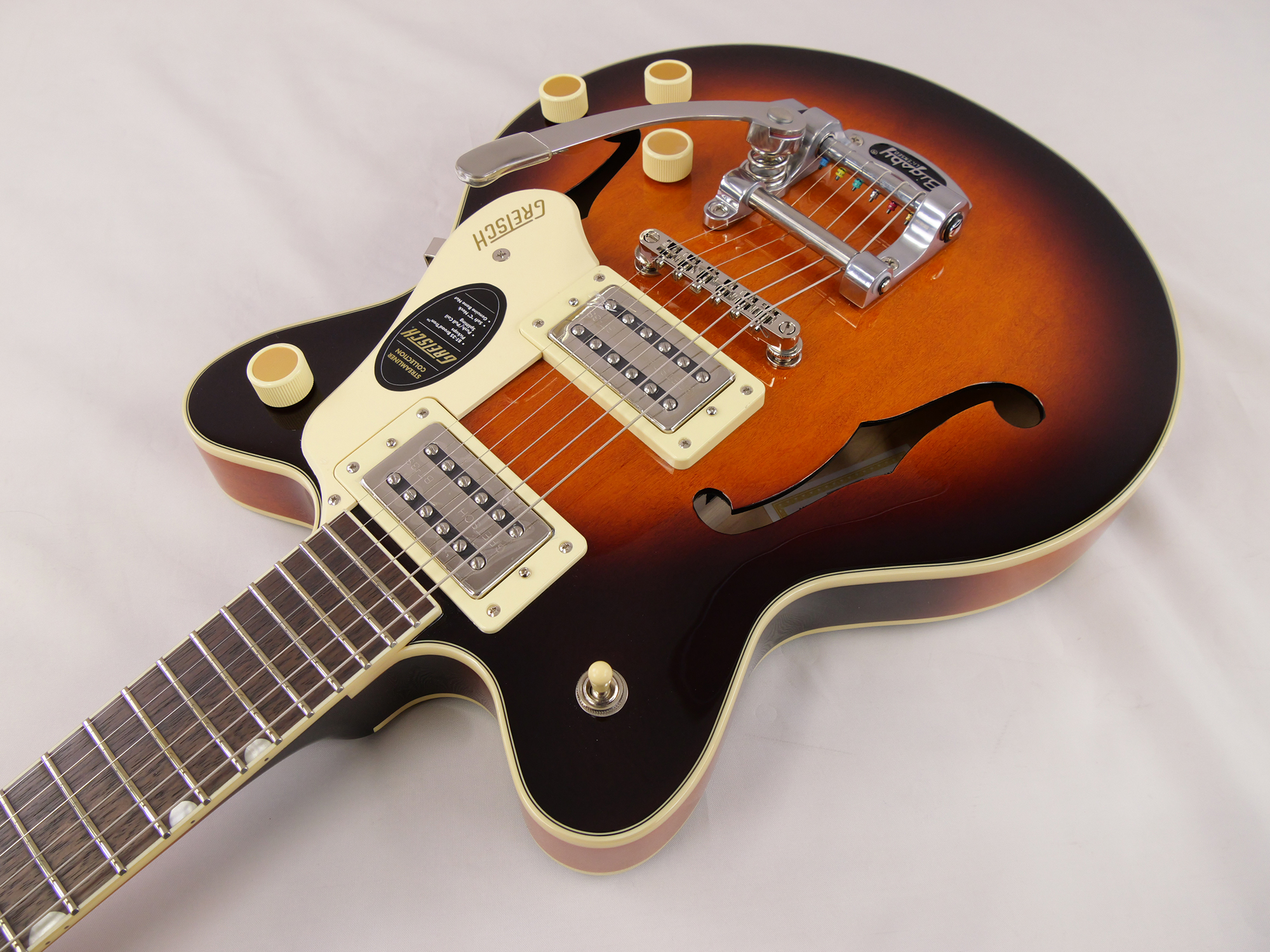 新しいセンターブロックデザインのメイプルボディ G2655T Center Block Jr.は、小さめのアーチドメイプルボディに、新しいセンターブロックデザインを採用しています。この新しいセンターブロックは、軽量で快適な演奏性と存在感のあるフルでリッチなサウンドを両立するように設計されており、アタックとサスティンを向上させ、優れたフィードバック抑制効果を、重さを感じさせない快適なギターにまとめ上げています。