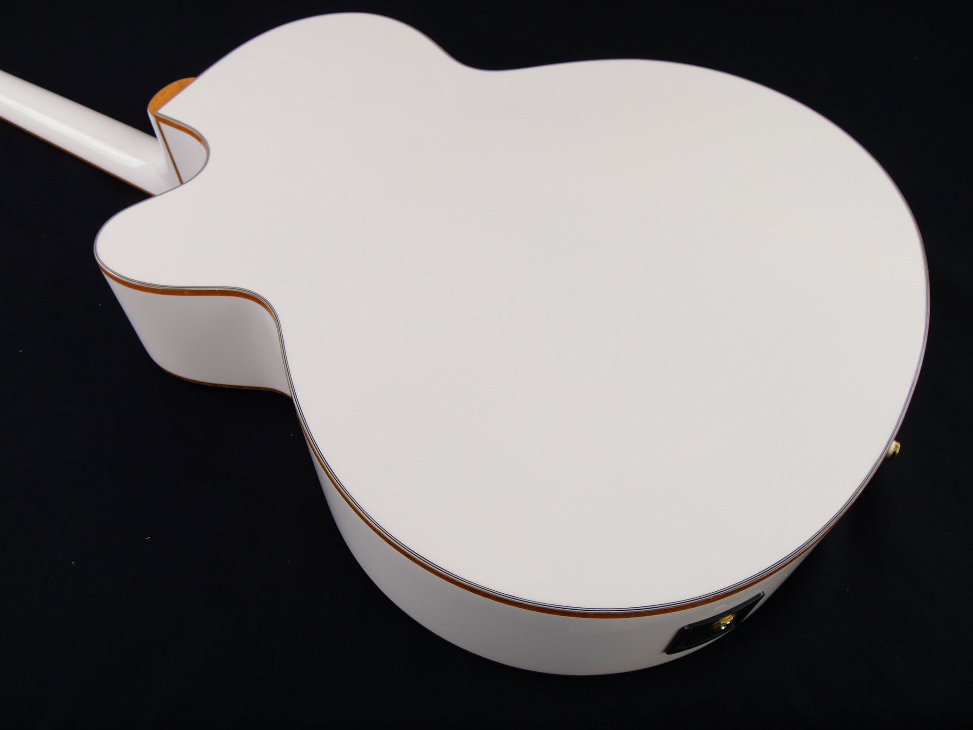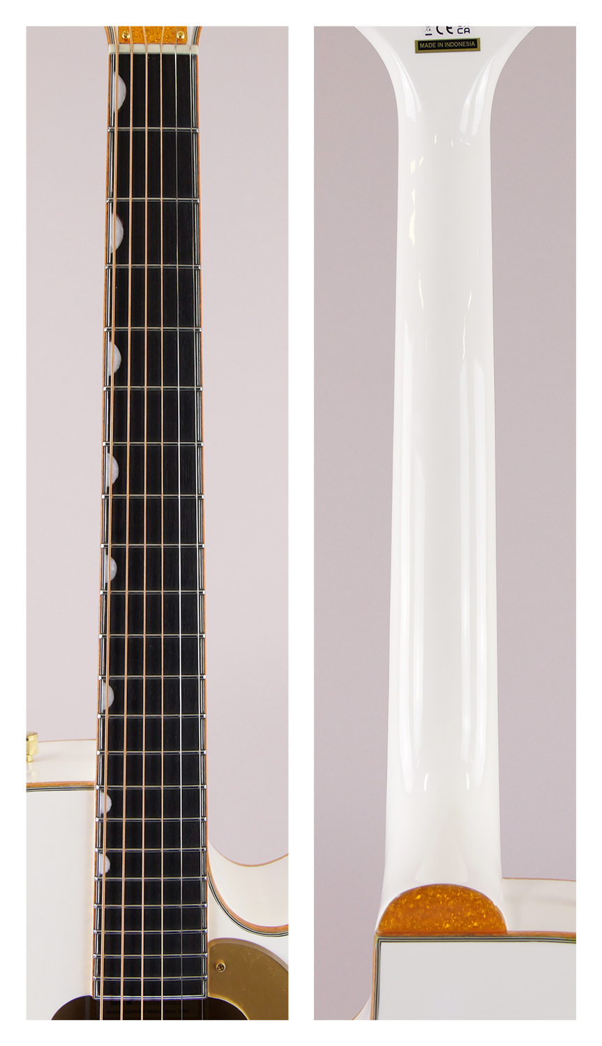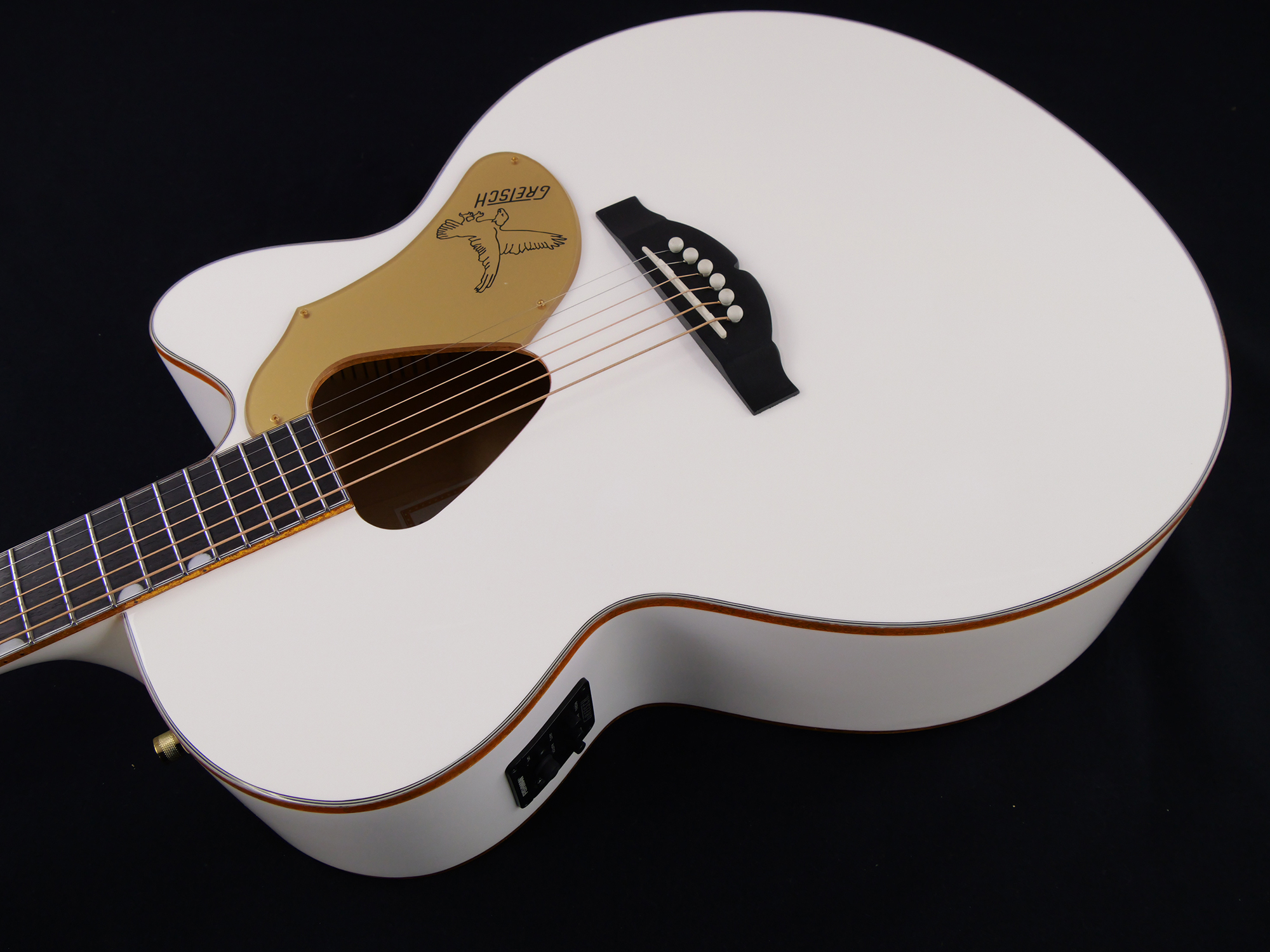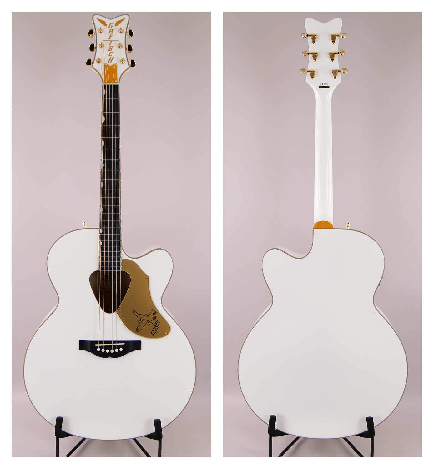 その他のプレミアムな仕様に、スキャロップドXブレイシング、クラシックなランチャータイプの三角型サウンドホールを備えた、ソリッドスプルース・ボディトップを使用。ボディ・サイドとアーチ状のボディ・バックにメイプル材を使用し、マホガニーネック、Neo-Classic™のサムネイル・インレイを装備した、21フレット仕様のローレル指板を採用。翼の付いた"Gretsch"スパークルロゴが入ったV字型ヘッドストック、ローズウッド台座付きコンペンセーテッド・ブリッジ、デラックスチューナー、金メッキされたハードウェアを採用しています。