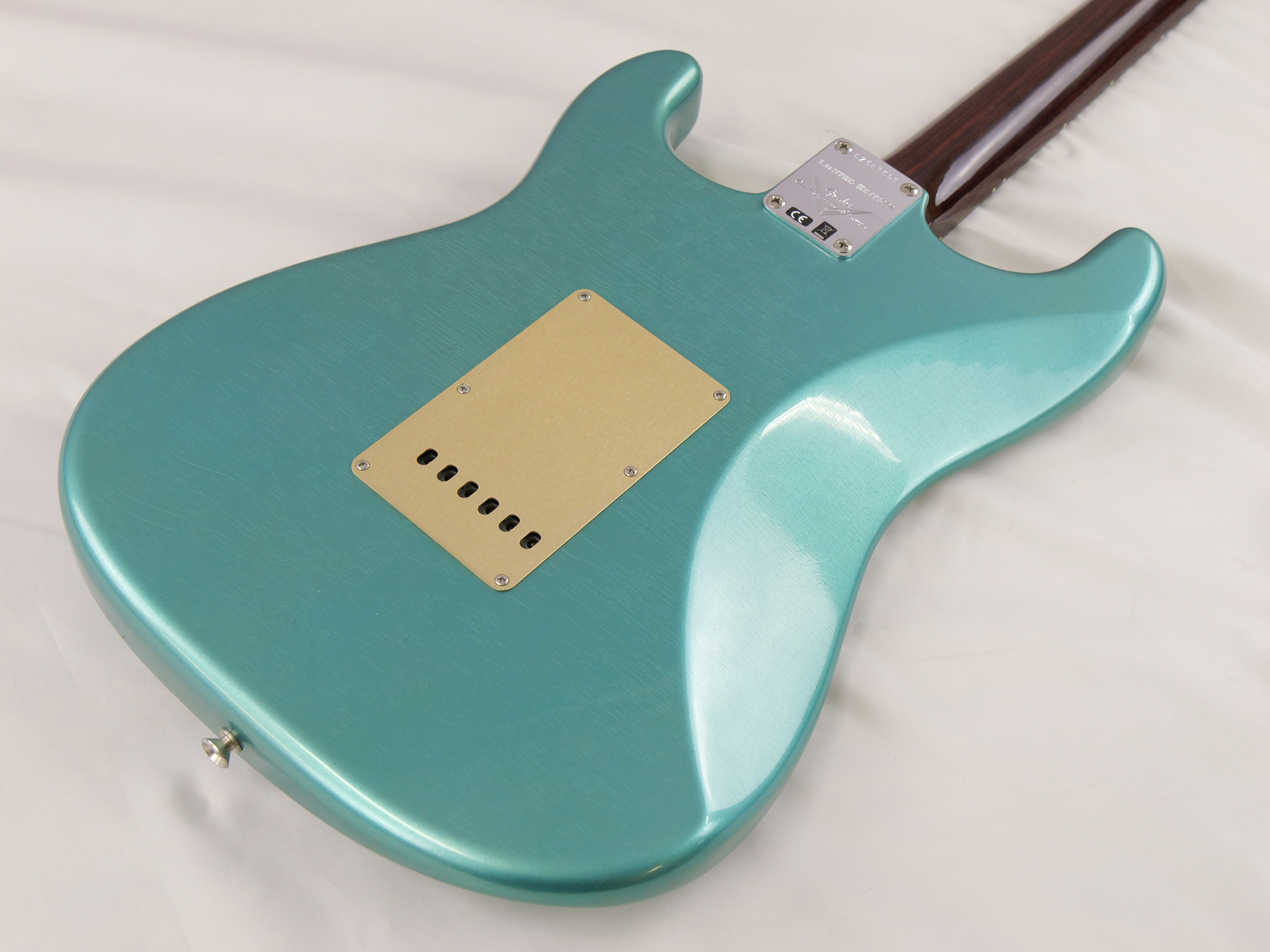 ・ボディフィニッシュ : 薄いニトロセルロースラッカー塗装で、ボディ全体にウェザーチェックが入っております。経年変化が見られるものの、光沢はしっかり残っております。