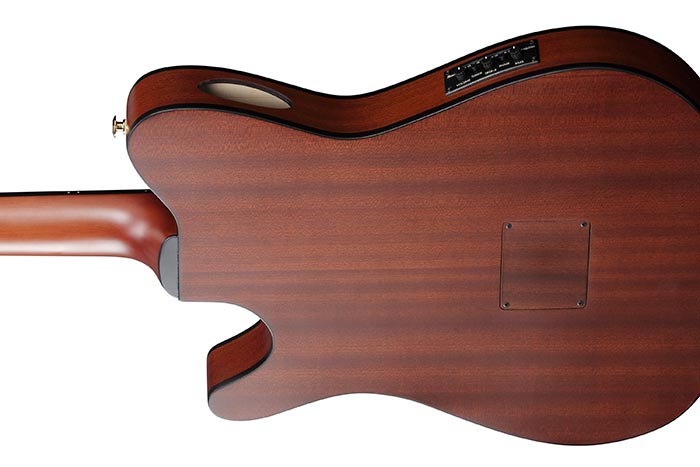 シングルカットのIbanezオリジナル”FR”シェイプを基に、クラシック・ギターでは一般的なファン・ブレーシングをトップ(表甲)に備えた厚さ約50mmのホロウ構造ボディです。