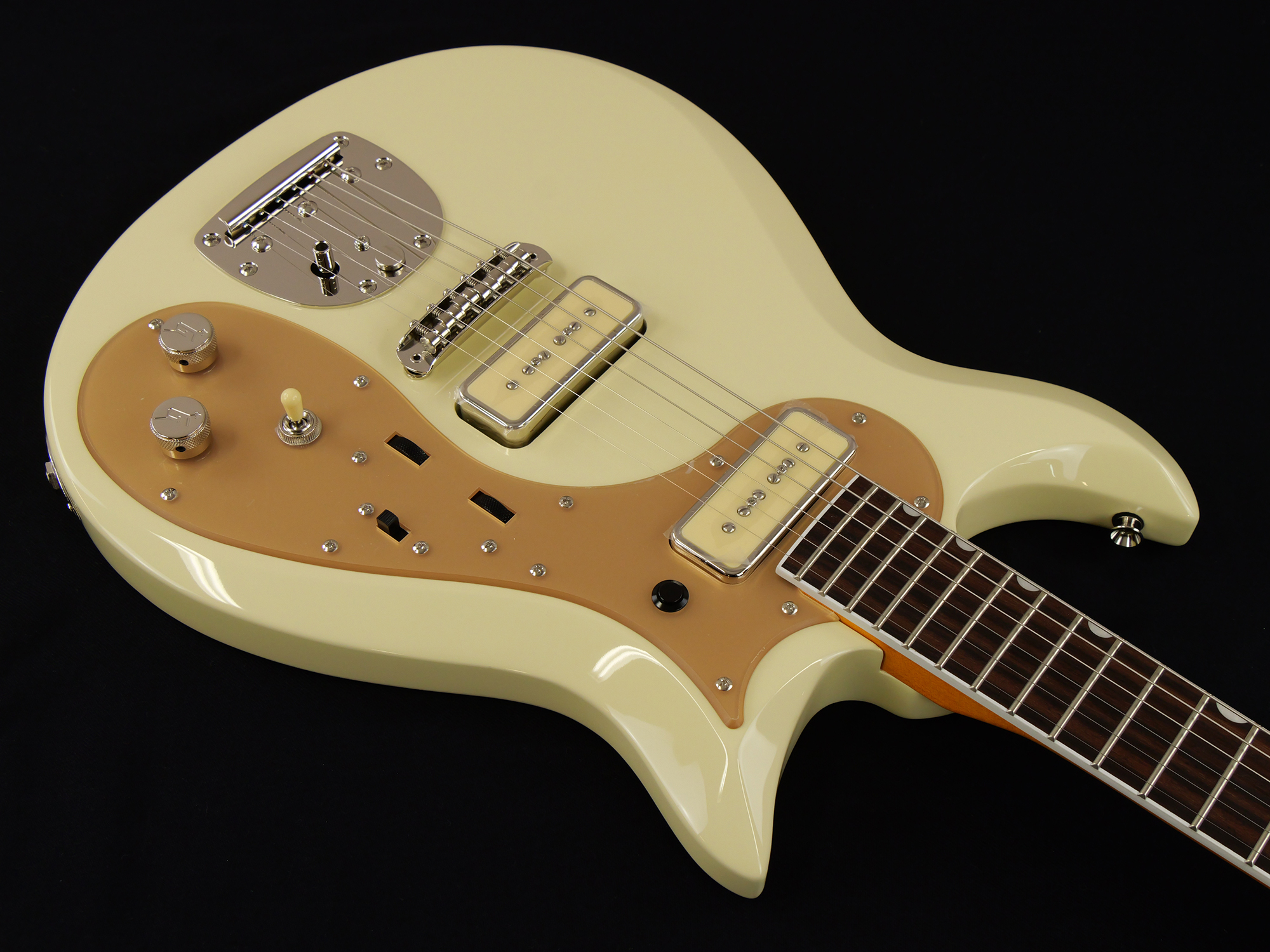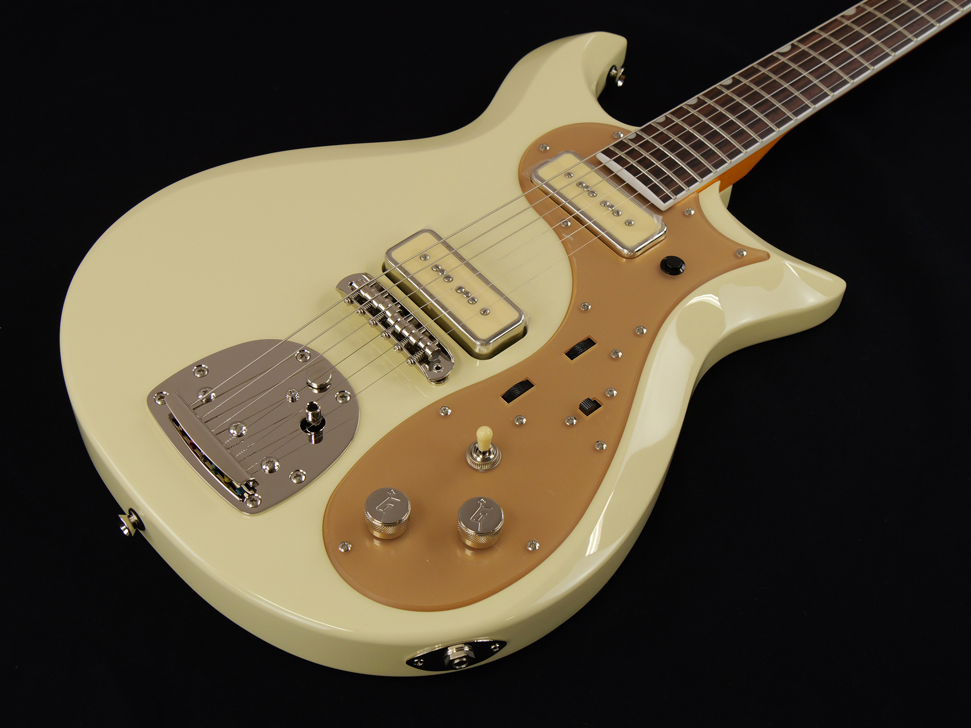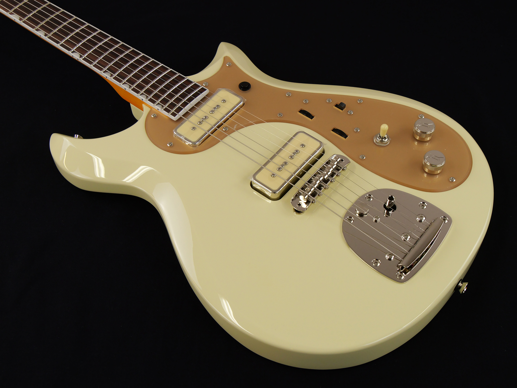 その他、ロックボタン付きヴィンテージスタイルフローティングトレモロ、ゴールドプレキシピックガード&トラスロッドカバー、ニッケルハードウェア、Vintage Whiteマッチングヘッドなど、ユニークな仕様をまとっています。