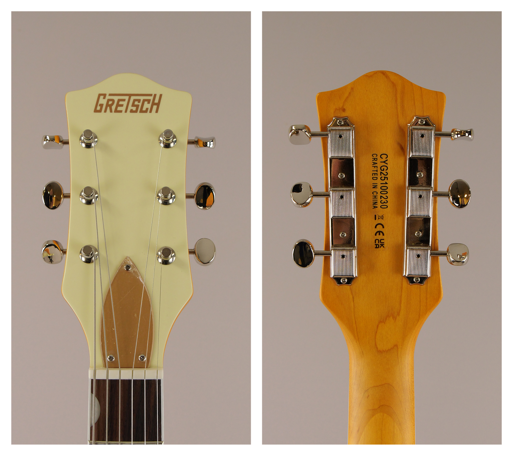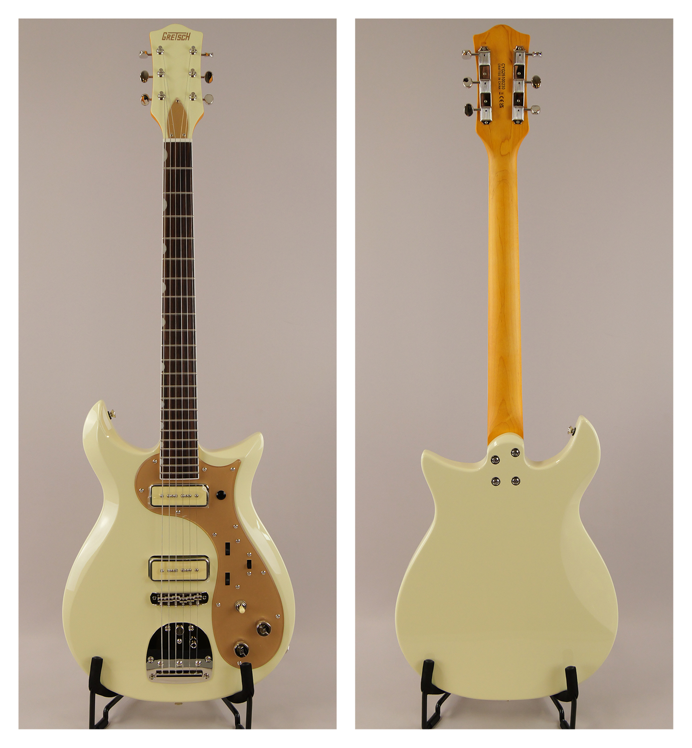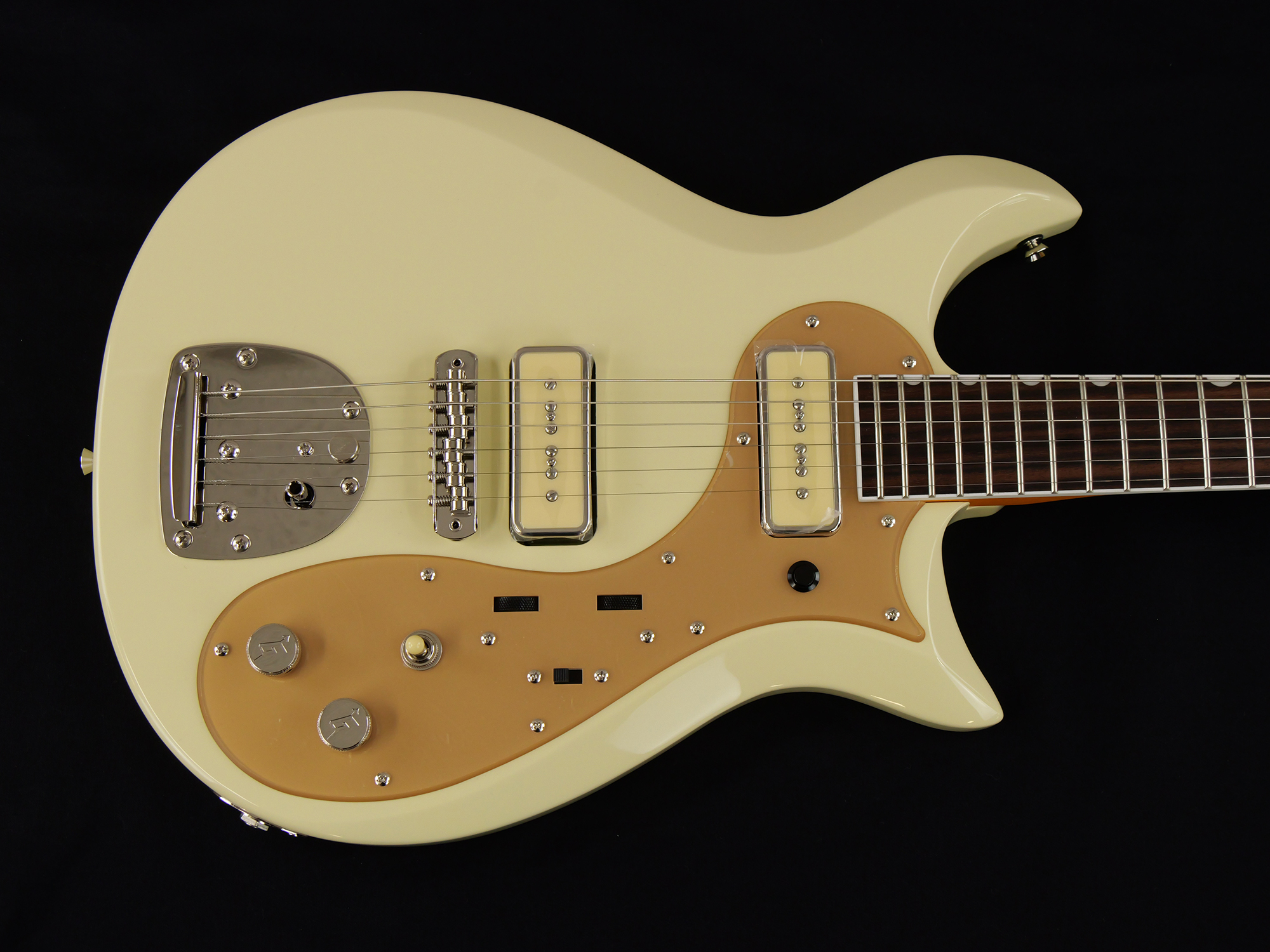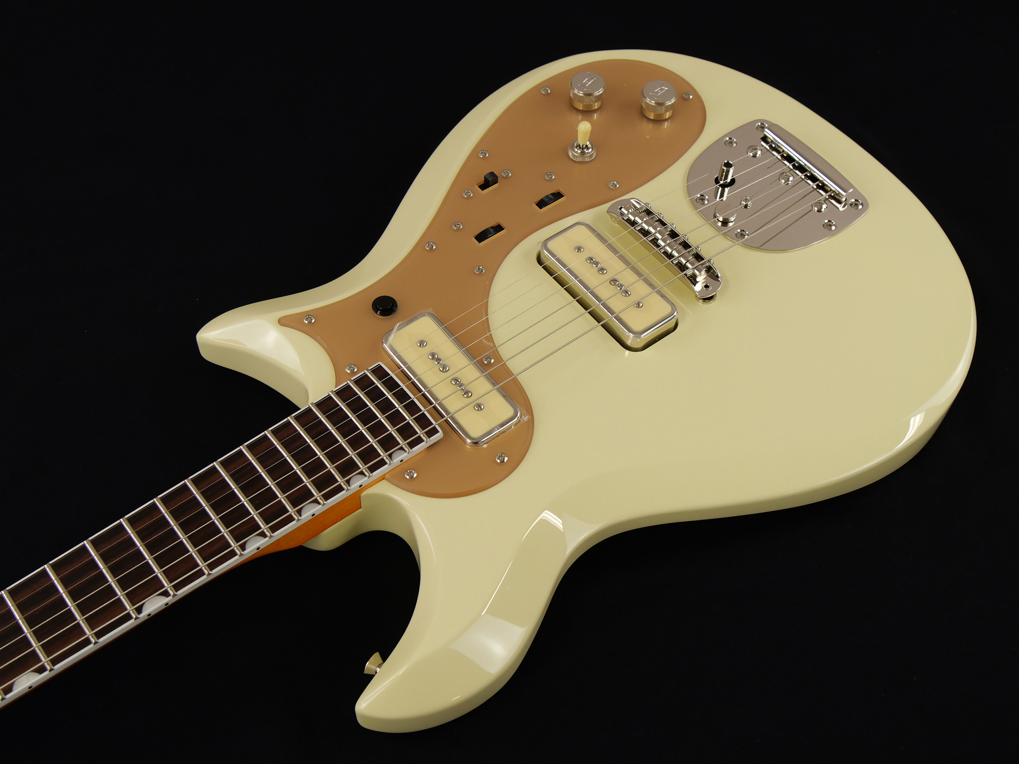 その他、ロックボタン付きヴィンテージスタイルフローティングトレモロ、ゴールドプレキシピックガード&トラスロッドカバー、ニッケルハードウェア、Vintage Whiteマッチングヘッドなど、ユニークな仕様をまとっています。