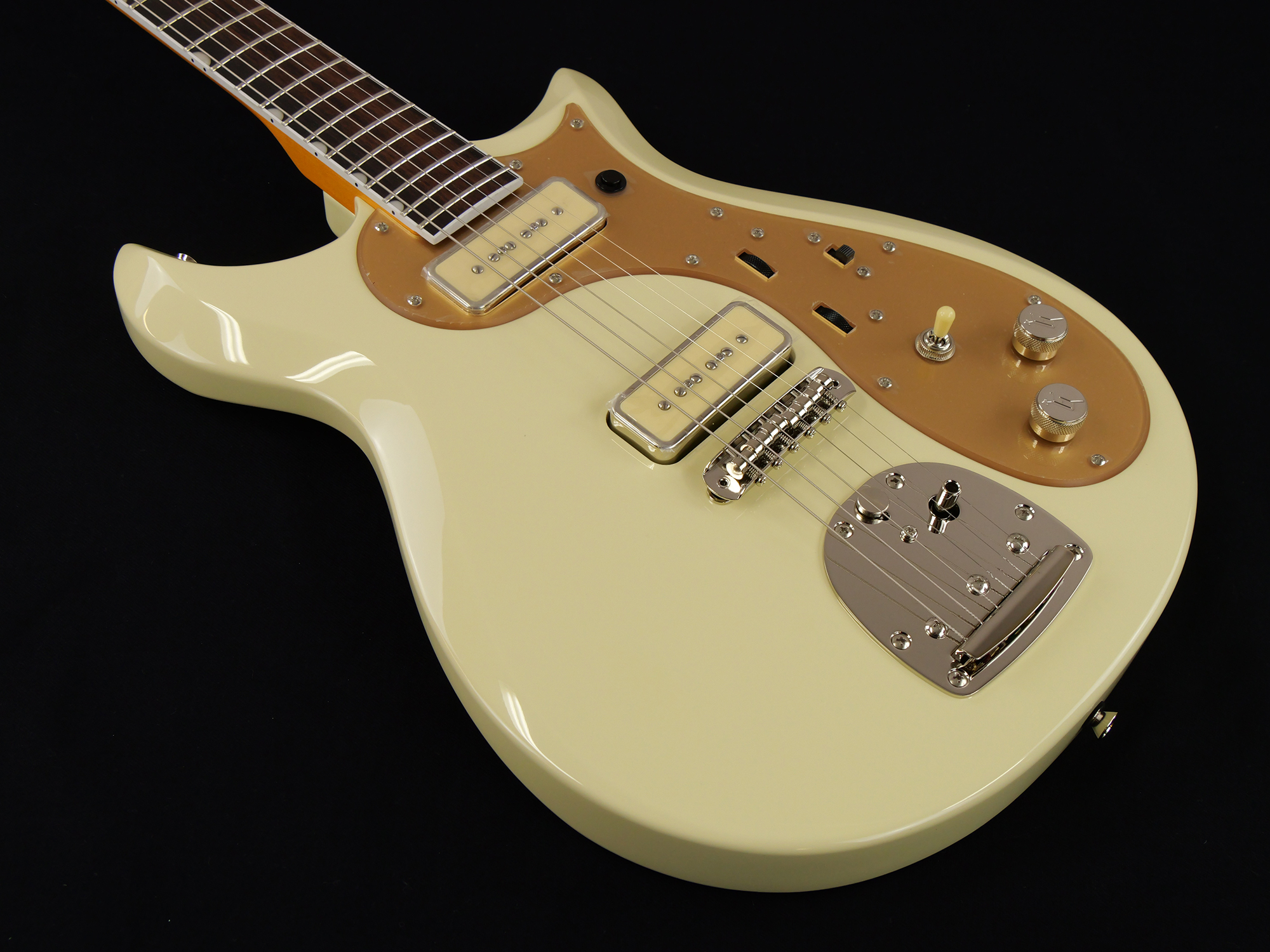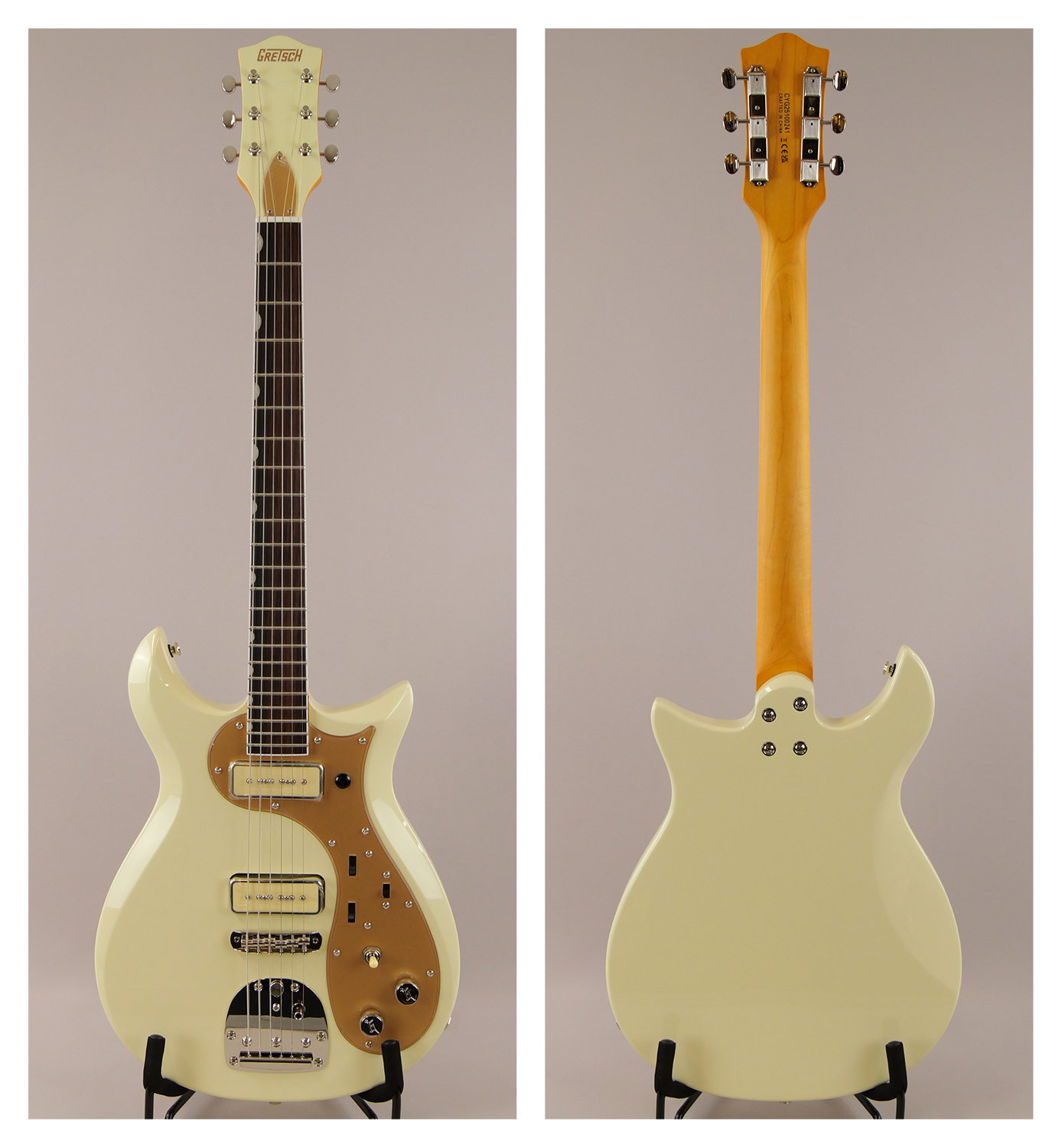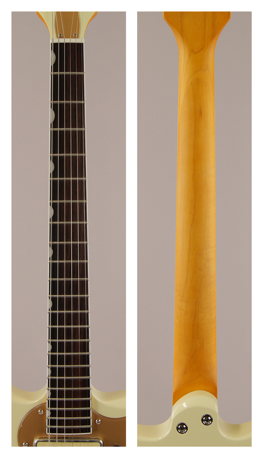 その他、ロックボタン付きヴィンテージスタイルフローティングトレモロ、ゴールドプレキシピックガード&トラスロッドカバー、ニッケルハードウェア、Vintage Whiteマッチングヘッドなど、ユニークな仕様をまとっています。