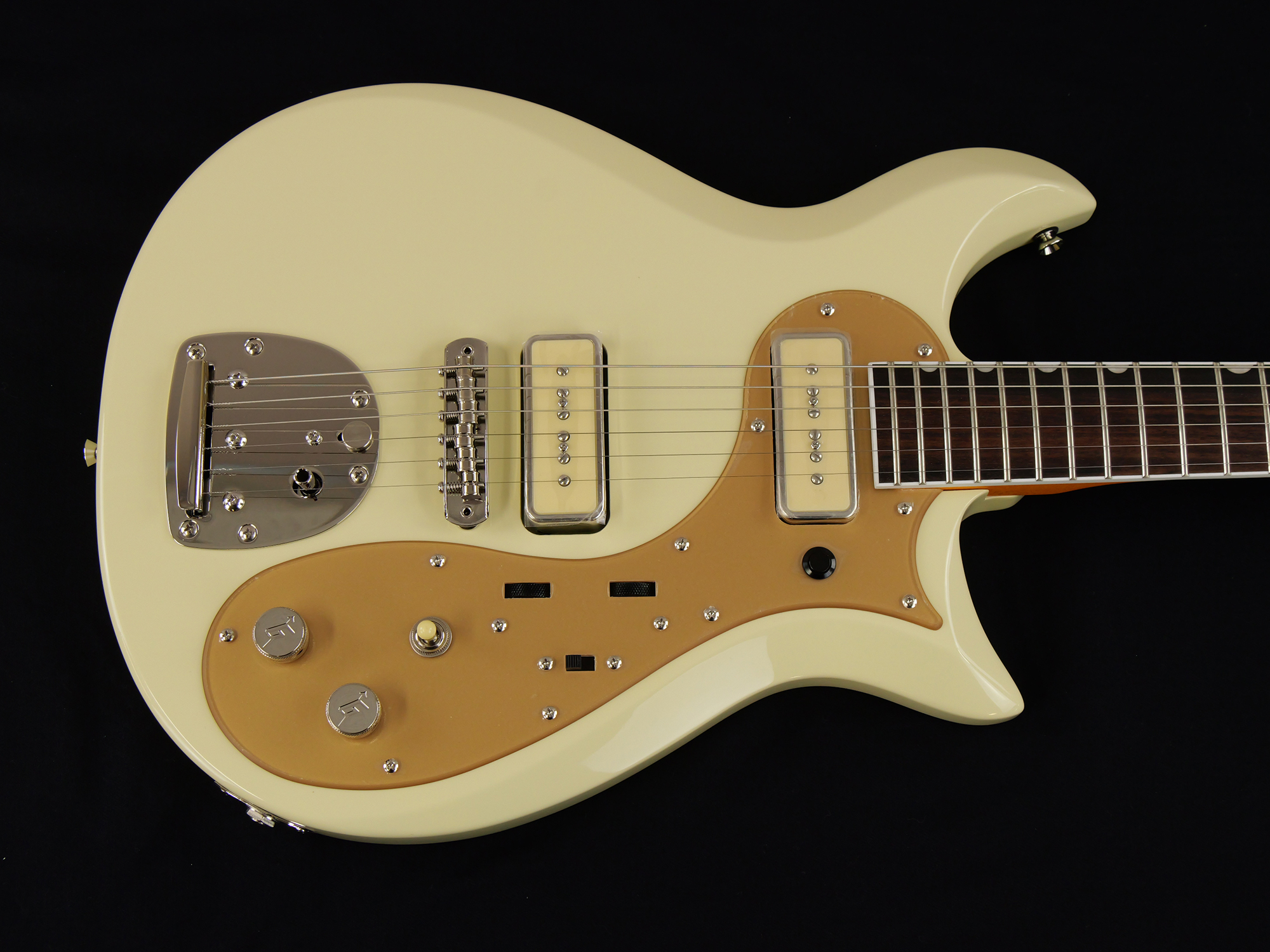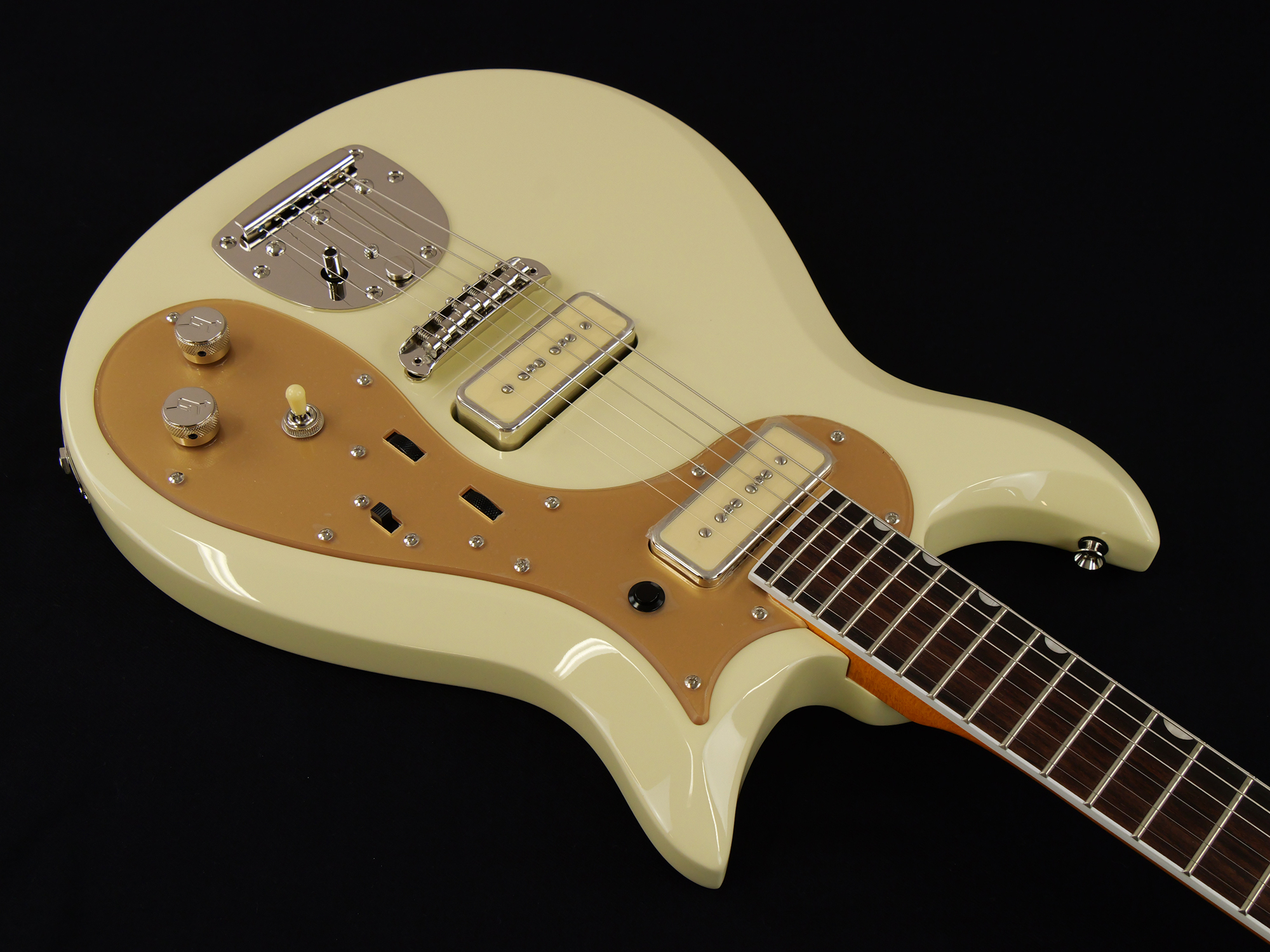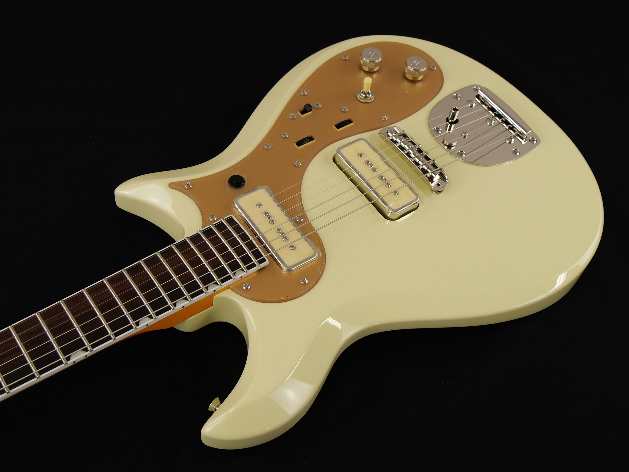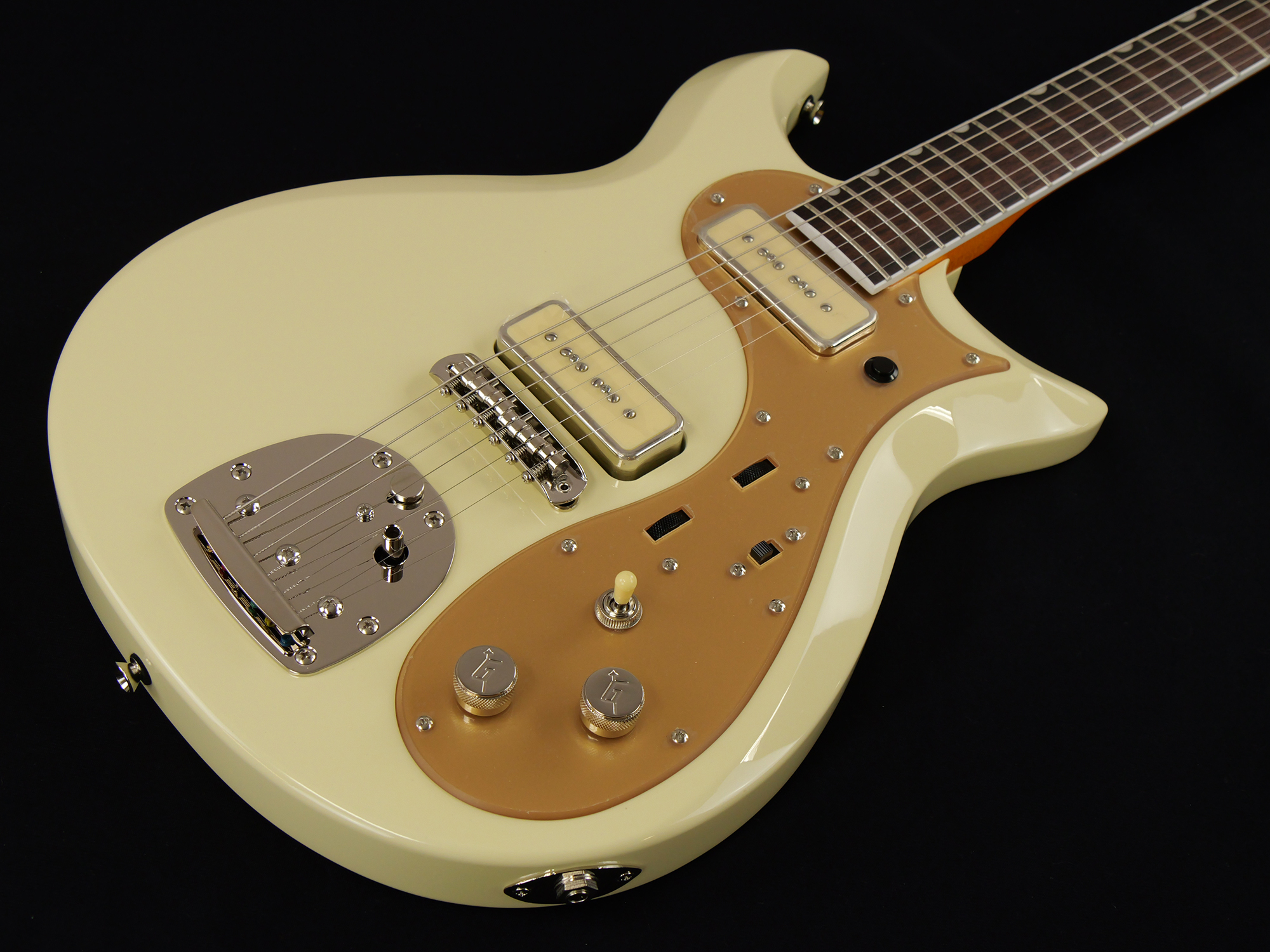 その他、ロックボタン付きヴィンテージスタイルフローティングトレモロ、ゴールドプレキシピックガード&トラスロッドカバー、ニッケルハードウェア、Vintage Whiteマッチングヘッドなど、ユニークな仕様をまとっています。