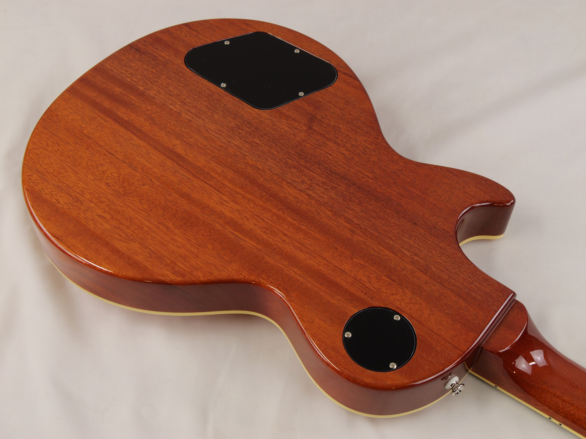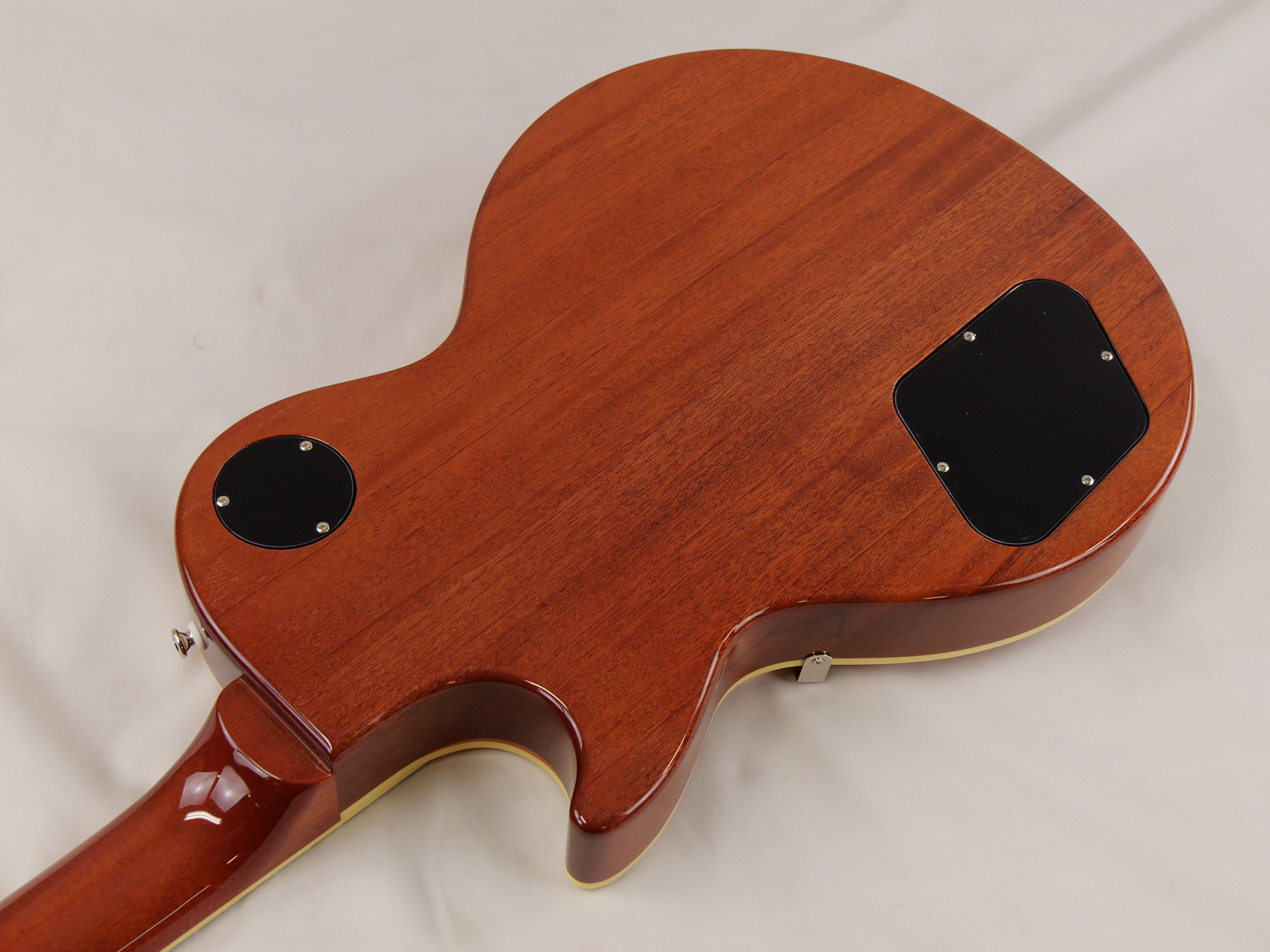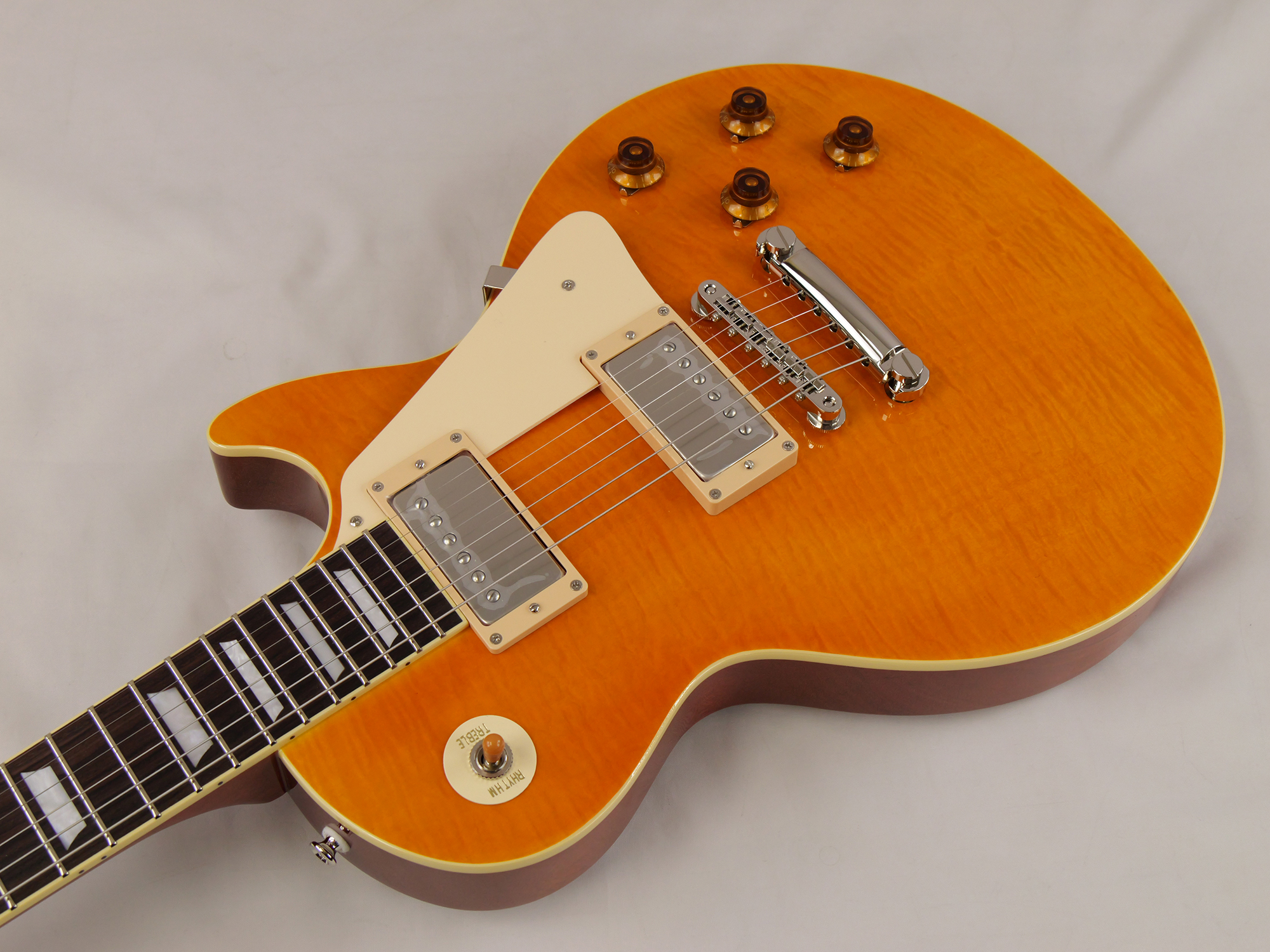 フレイム・メイプルをトップにラミネートした王道のレスポール・スタンダード・スタイル。ネックとボディの接合には伝統的なニカワ接着が採用されており、セットネックならではの響きの一体感がしっかりと感じられます。