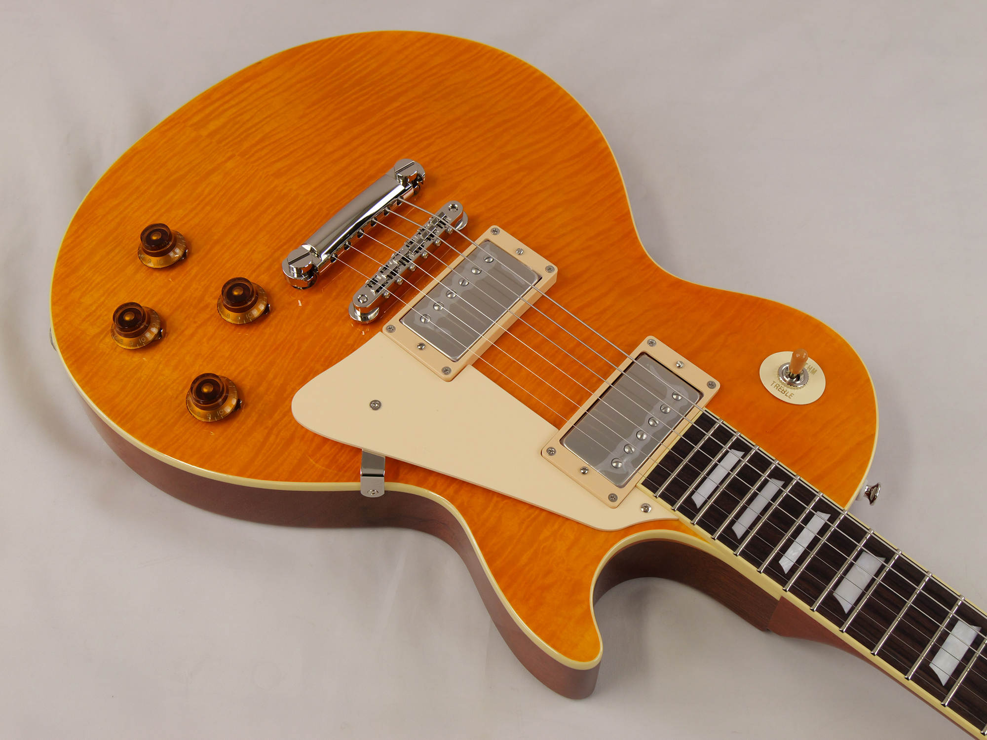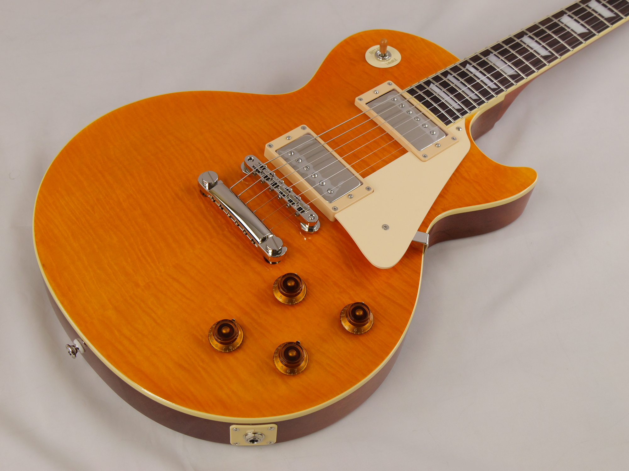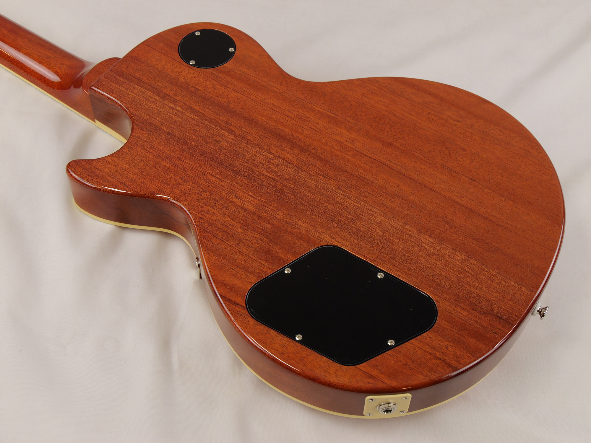 フレイム・メイプルをトップにラミネートした王道のレスポール・スタンダード・スタイル。ネックとボディの接合には伝統的なニカワ接着が採用されており、セットネックならではの響きの一体感がしっかりと感じられます。