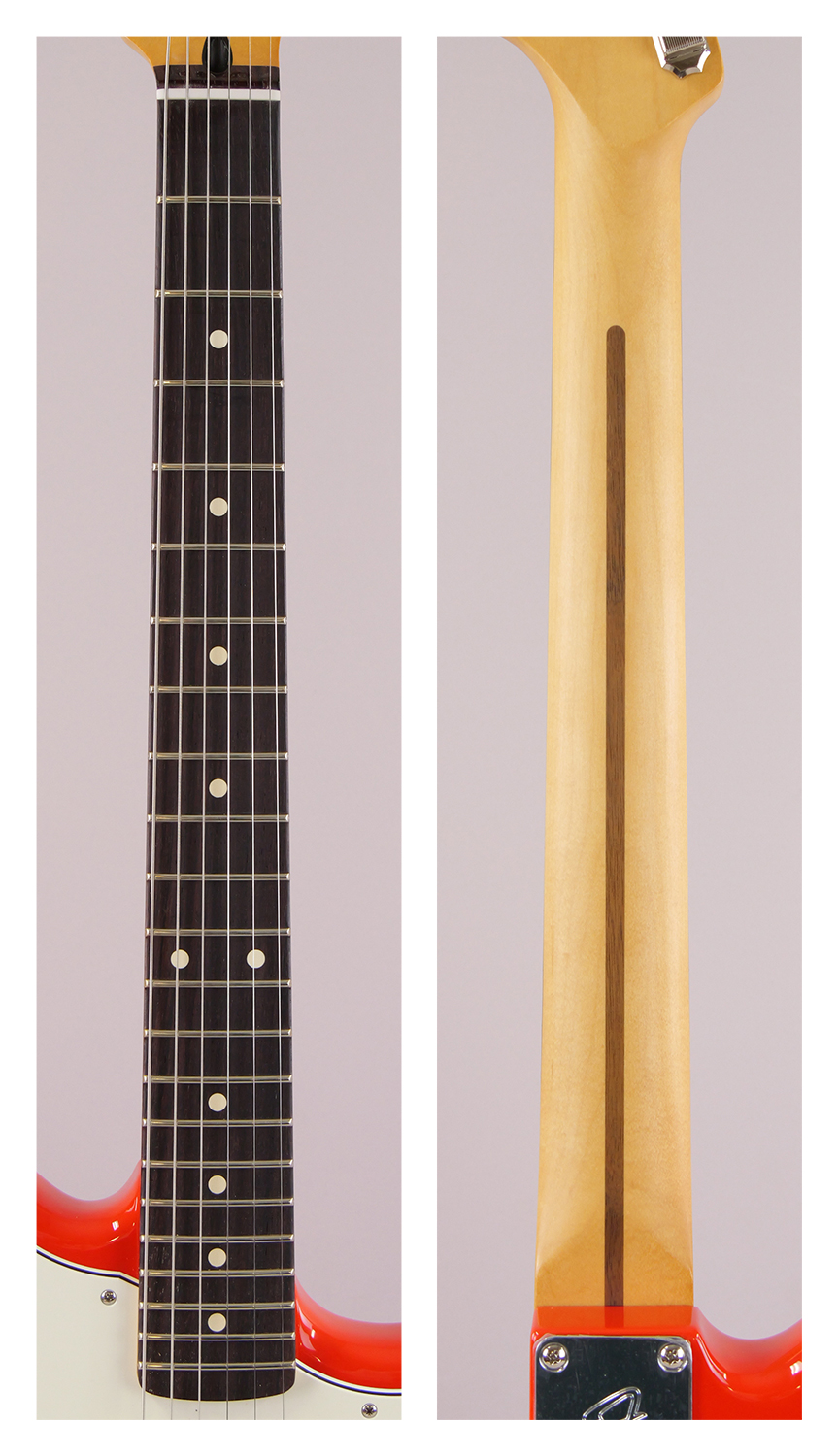 Modern "C"シェイプのネックバックにはシルキーなサテンウレタンフィニッシュが施されており、丁寧にロールオフされた指板エッジと22本のミディアムジャンボフレットを採用した9.5インチラジアスのスラブローズウッド指板が、ネック全長にわたり快適なプレイアビリティを提供します。