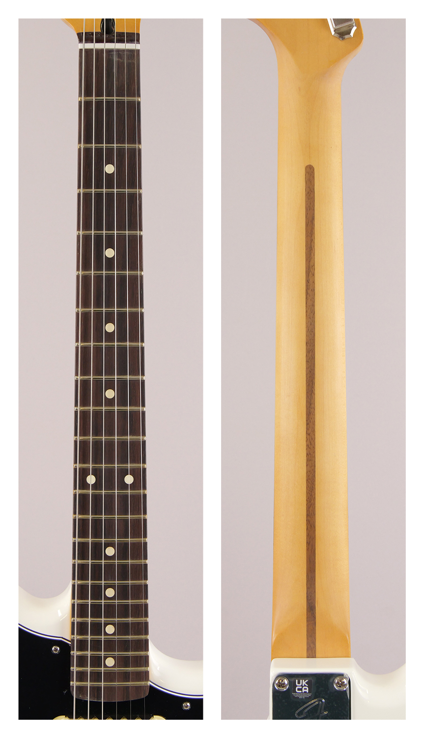 Modern "C"シェイプのネックバックにはシルキーなサテンウレタンフィニッシュが施されており、丁寧にロールオフされた指板エッジと22本のミディアムジャンボフレットを採用した9.5インチラジアスのスラブローズウッド指板が、ネック全長にわたり快適なプレイアビリティを提供します。