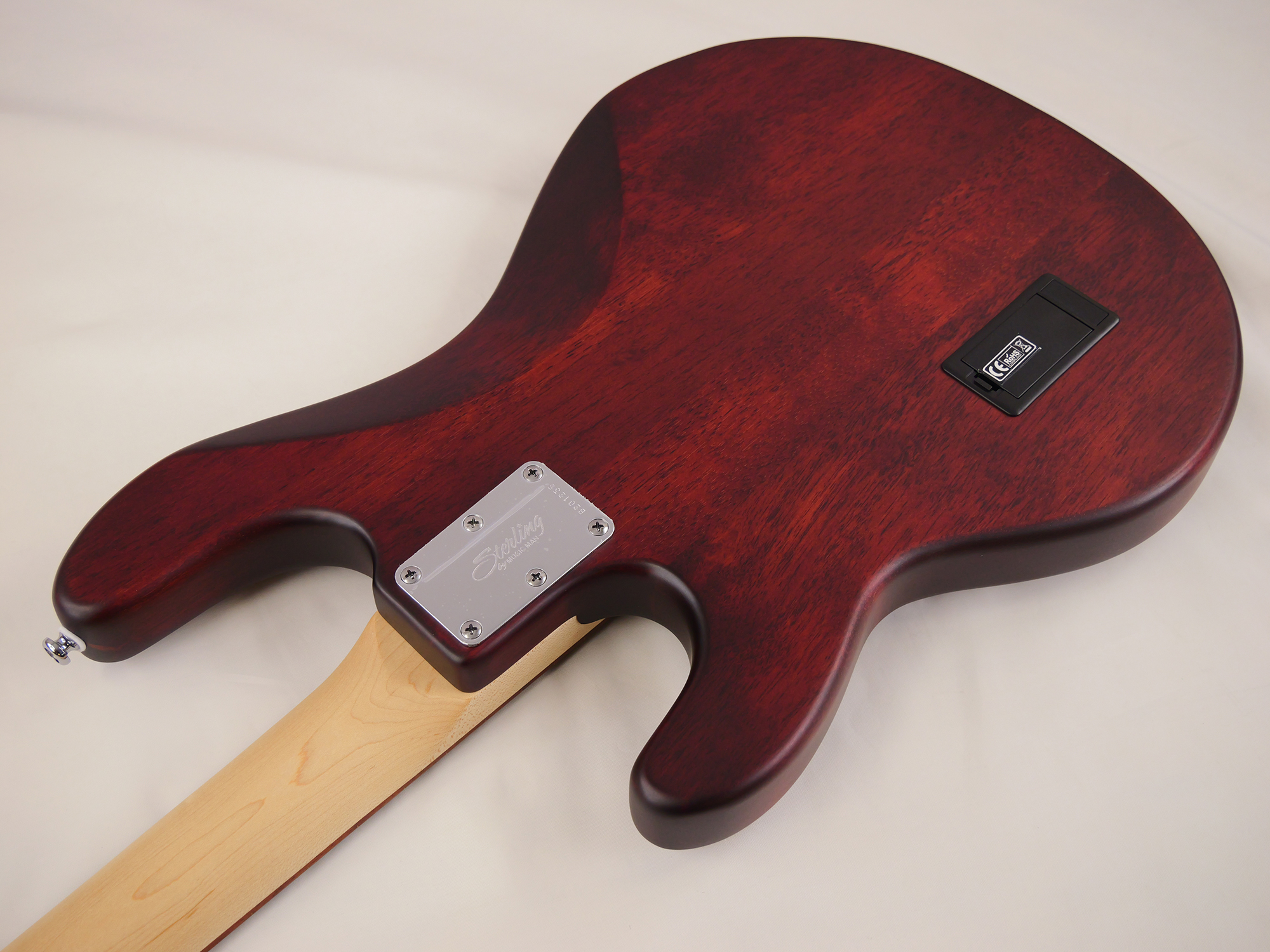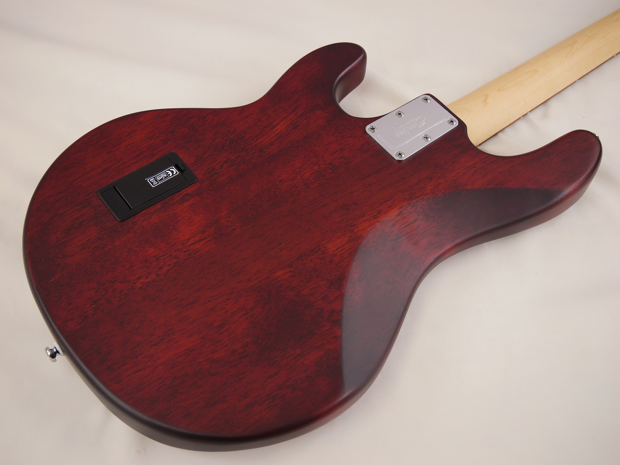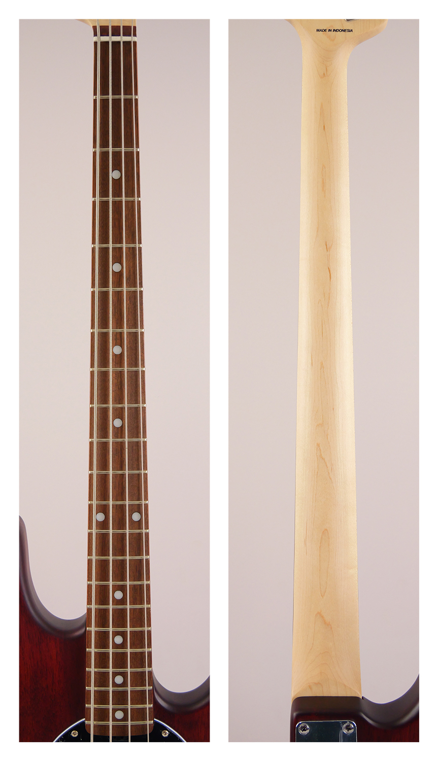 バスウッドボディにメイプルネック、6点止めボルトオン、ミュージックマンデザインによるオリジナルブリッジを搭載、約3.8mmのナット幅。
