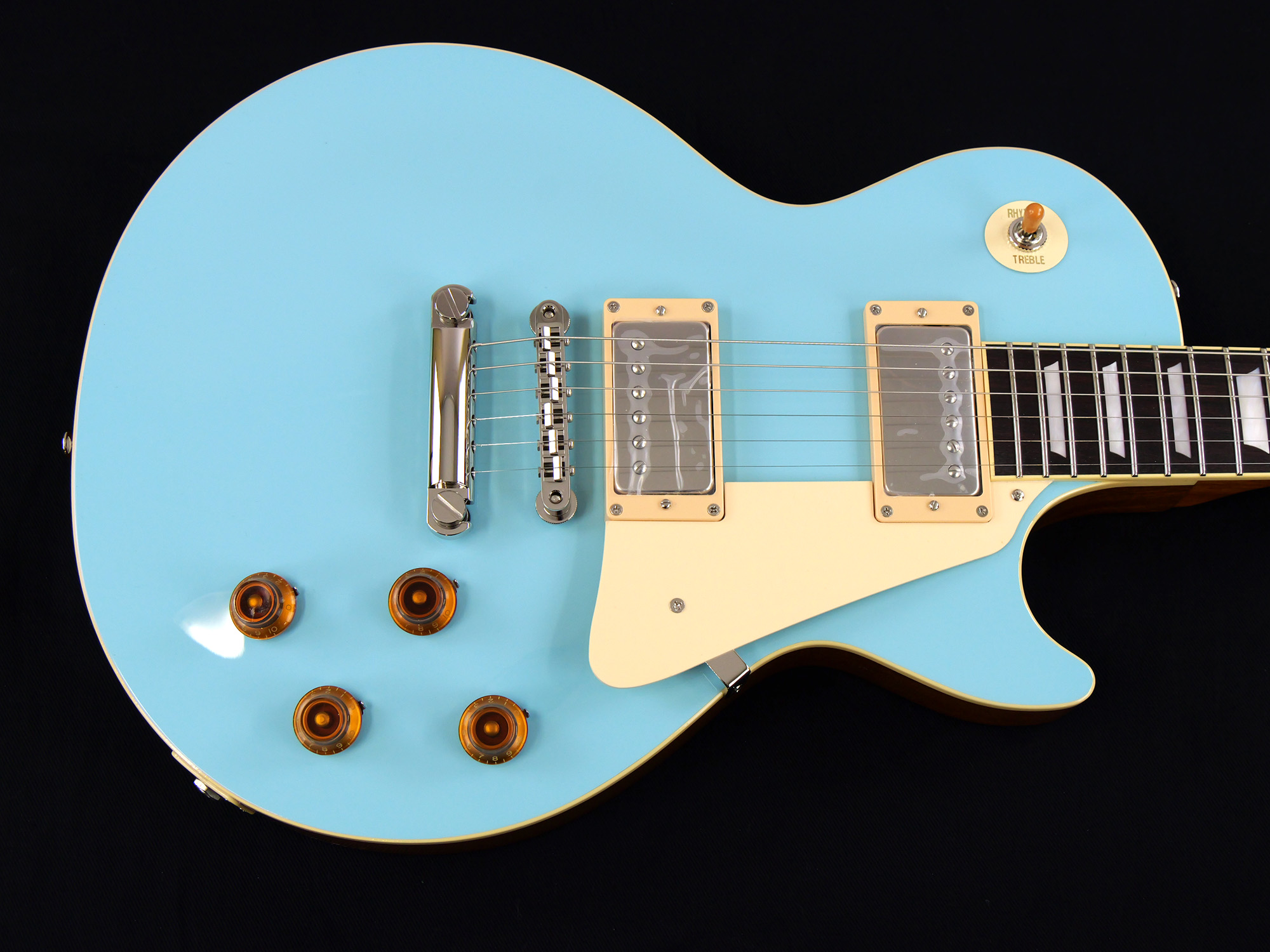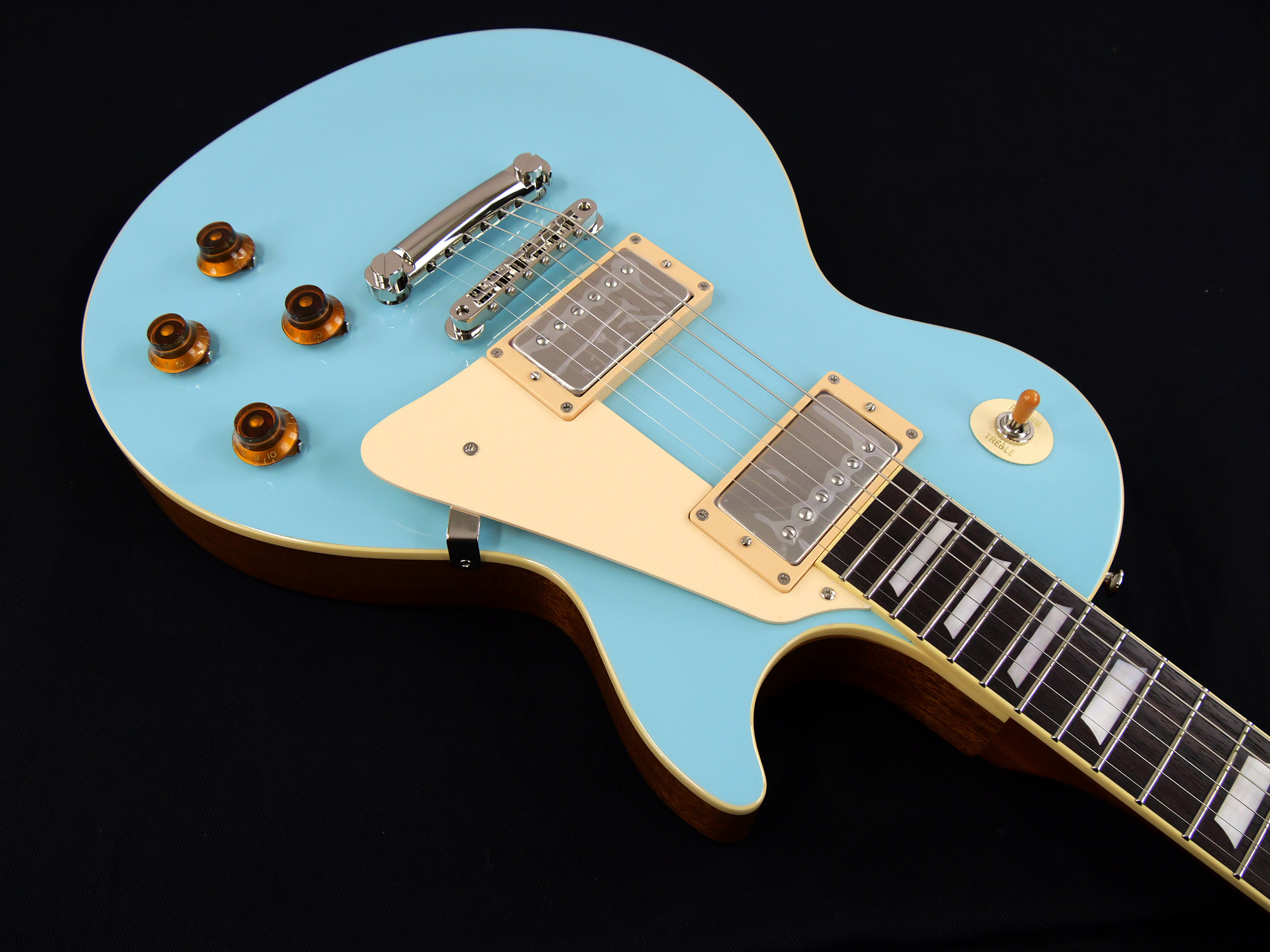 メイプルをトップにラミネートした王道のレスポール・スタンダード・スタイル。ネックとボディの接合には伝統的なニカワ接着が採用されており、セットネックならではの響きの一体感がしっかりと感じられます。