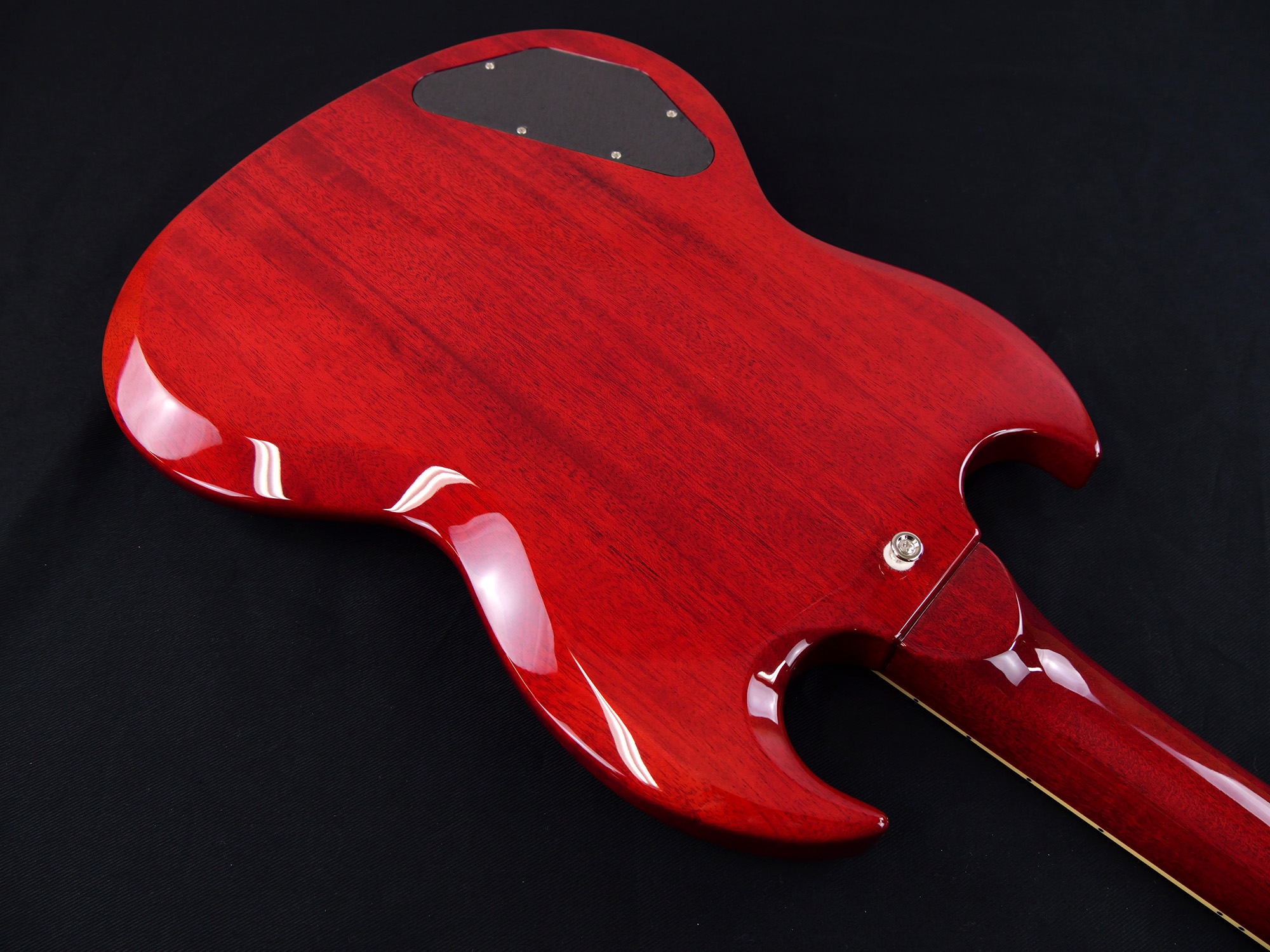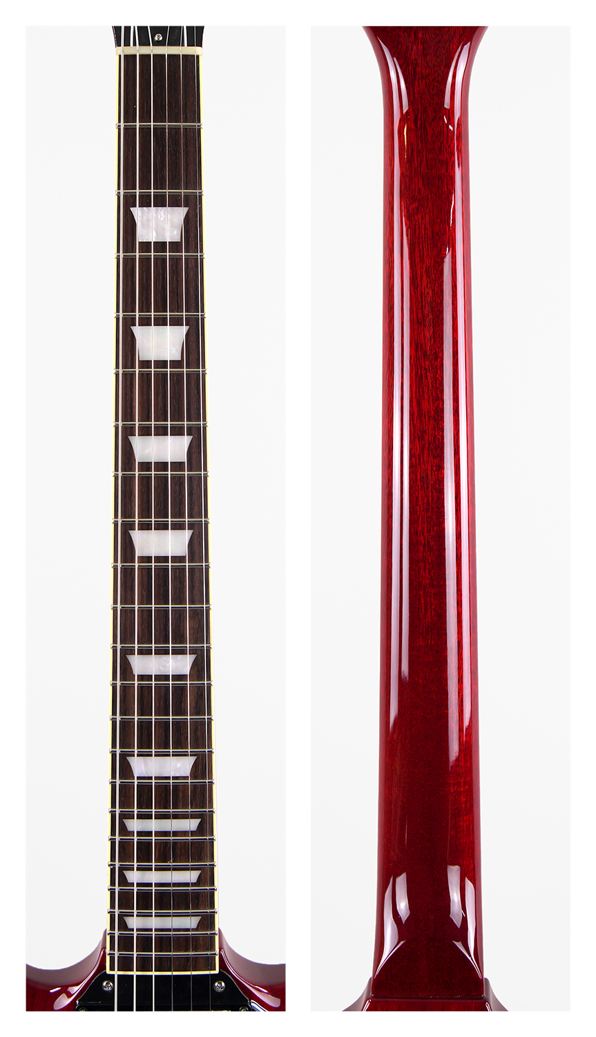 2ピースマホガニーボディ、1ピースマホガニーネックを採用したSG スタイル。ネックとボディの接合には伝統的なニカワ接着が採用されており、セットネックならではの響きの一体感がしっかりと感じられます。