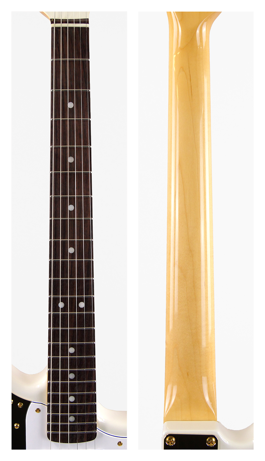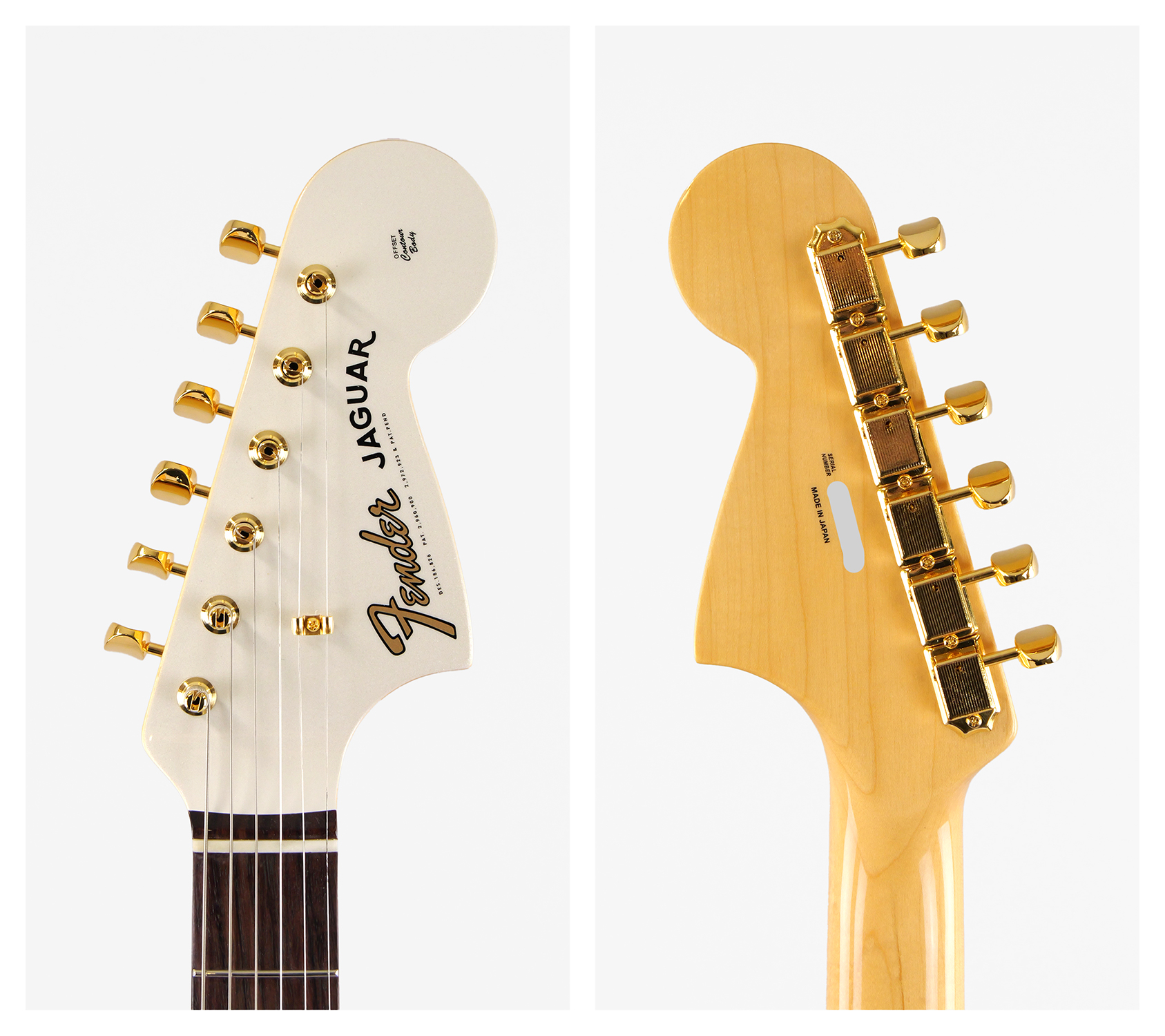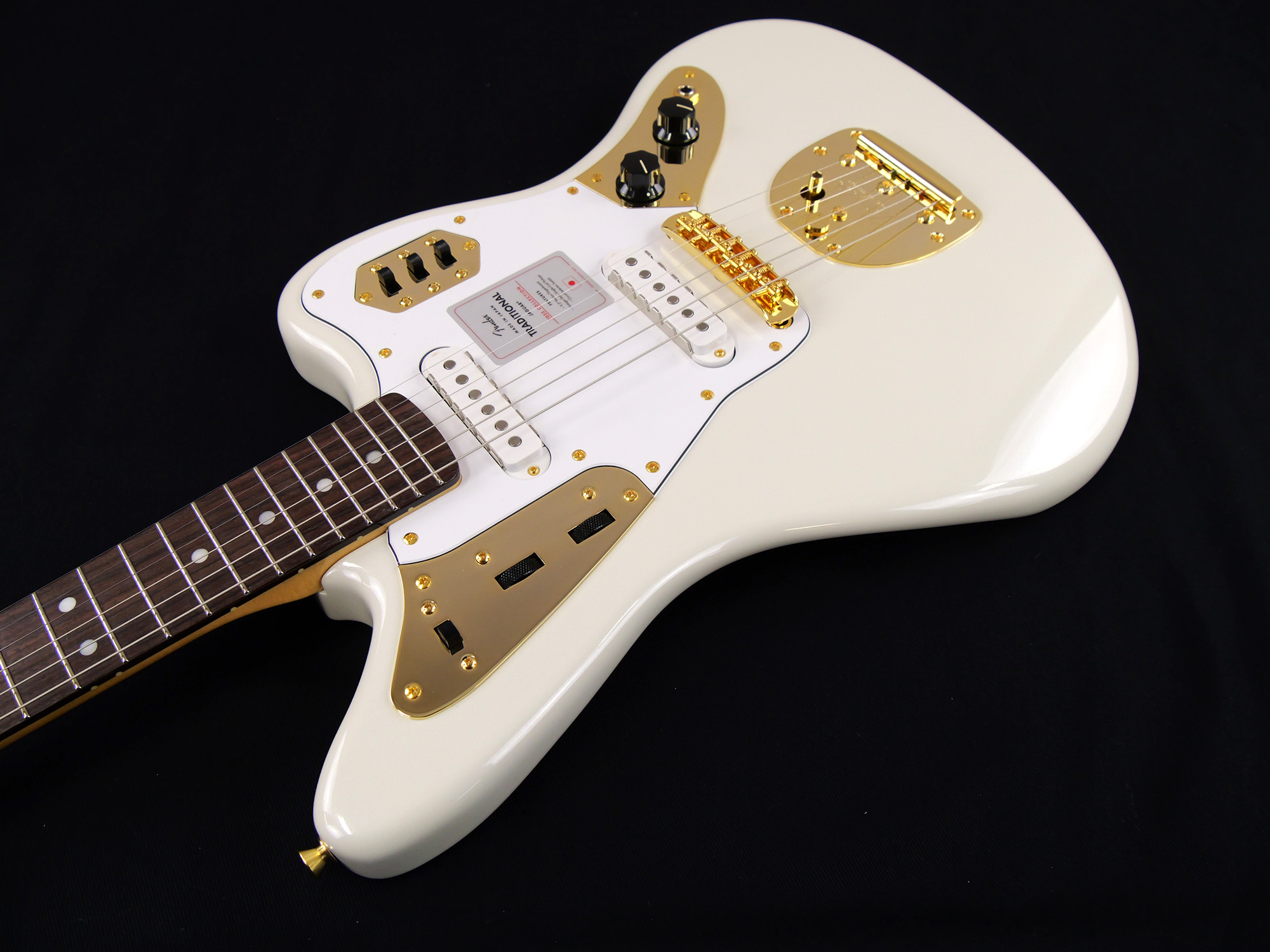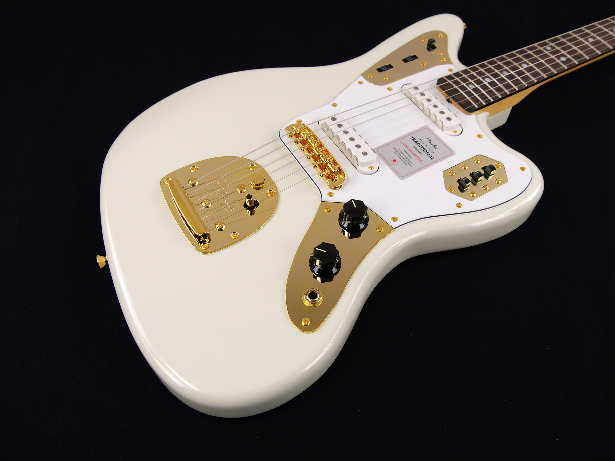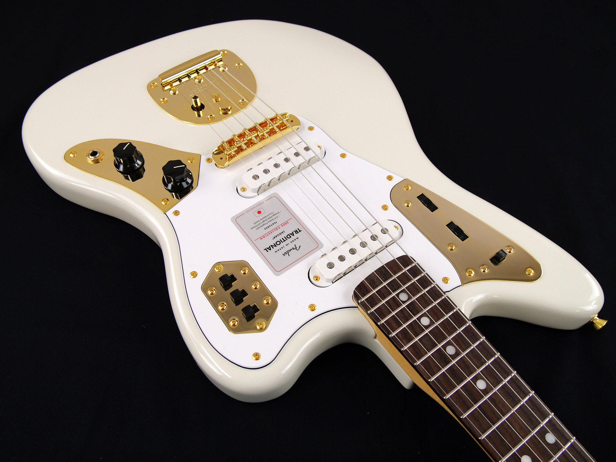 Made in Japan Traditional 2025 Collection, 60s Jaguar®は、Made in Japan Traditional 60s Jaguar®をベースに2025年限定のルックスを纏った特別なモデルです。 "Black Pearl"と"White Pearl"は、ボディとヘッドストックにこれらの製品だけの特殊なパール塗装を施しており、ゴールドに統一されたハードウェアと相まって、より一層、優雅で上品な高級感を得ることができます。 "Competition Black / 3-Color Sunburst"と"Competition 3-Color Sunburst / Aged Natural"は、従来の有彩色なコンペティションラインをあしらった製品ではなく、フェンダーの代表的なカラーである3-Color Sunburstをボディデザインに溶け込ませることで、3本ラインの中から、違った角度のフェンダーらしさを感じることができる製品です。