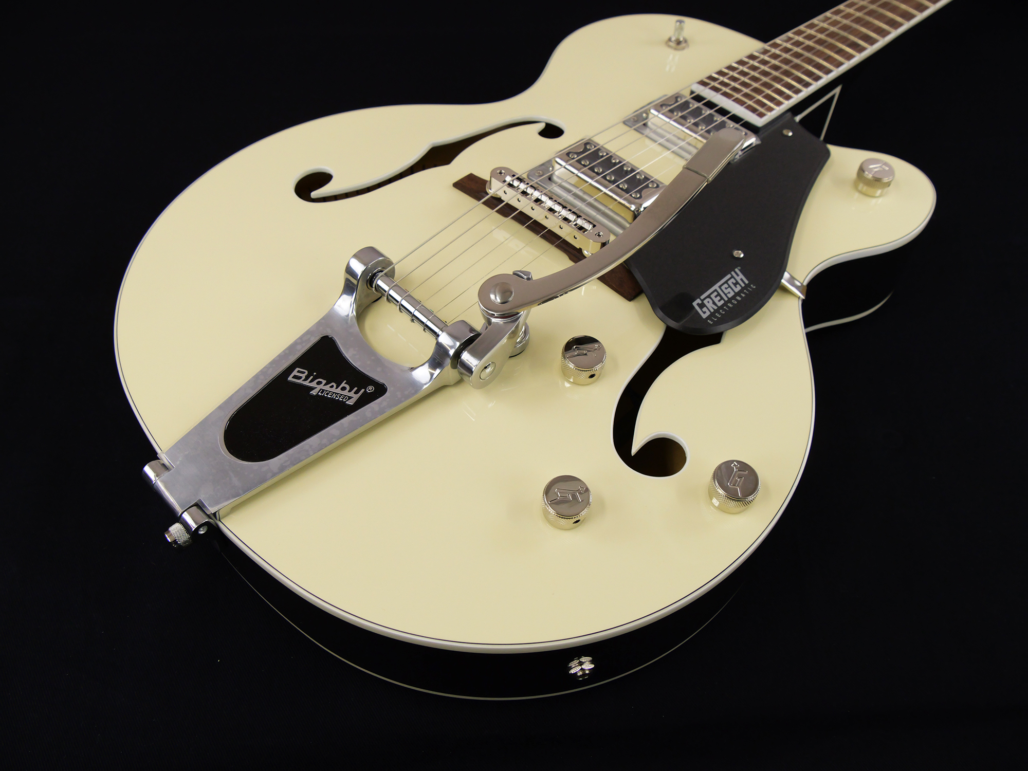 全く新しいクラシック「C」シェイプのメイプルネックは、プレイアビリティとパフォーマンスを向上させ、快適な演奏感をもたらす、12インチラジアスのローレル指板を備えています。 生き生きとした響きを提供するG5420Tは、トレブルブリードサーキットとマスターボリュームを含む、様々なアップグレードを施されたコントロール部を持ち、 マスタートーン、個々のピックアップボリュームコントロールと3ポジションピックアップトグルスイッチ、特大のバウンドFホール、マルチプライボディバインディング、バインディング加工された50年代後半の小ぶりなG6120バウンドヘッドストック、ヴィンテージスタイルのオープンバックチューニングマシン、Graph Tech® NuBoneナット、パーロイドのeo-Classic™サムネイルインレイ、安定したAdjusto-Matic™ブリッジ、Bigsby B60ヴィブラートテールピースを備えています。