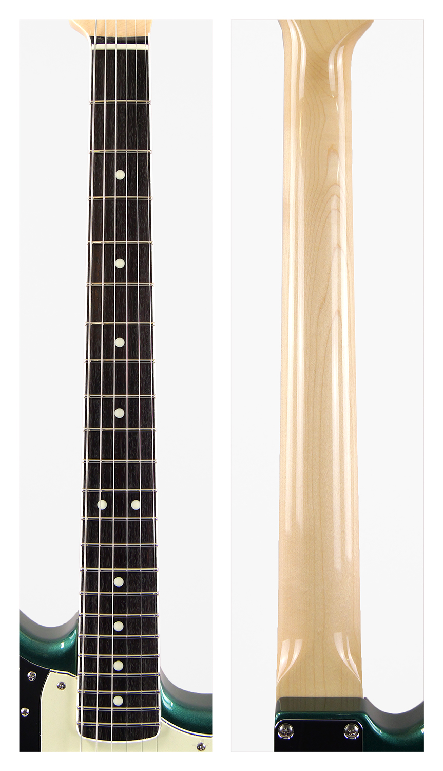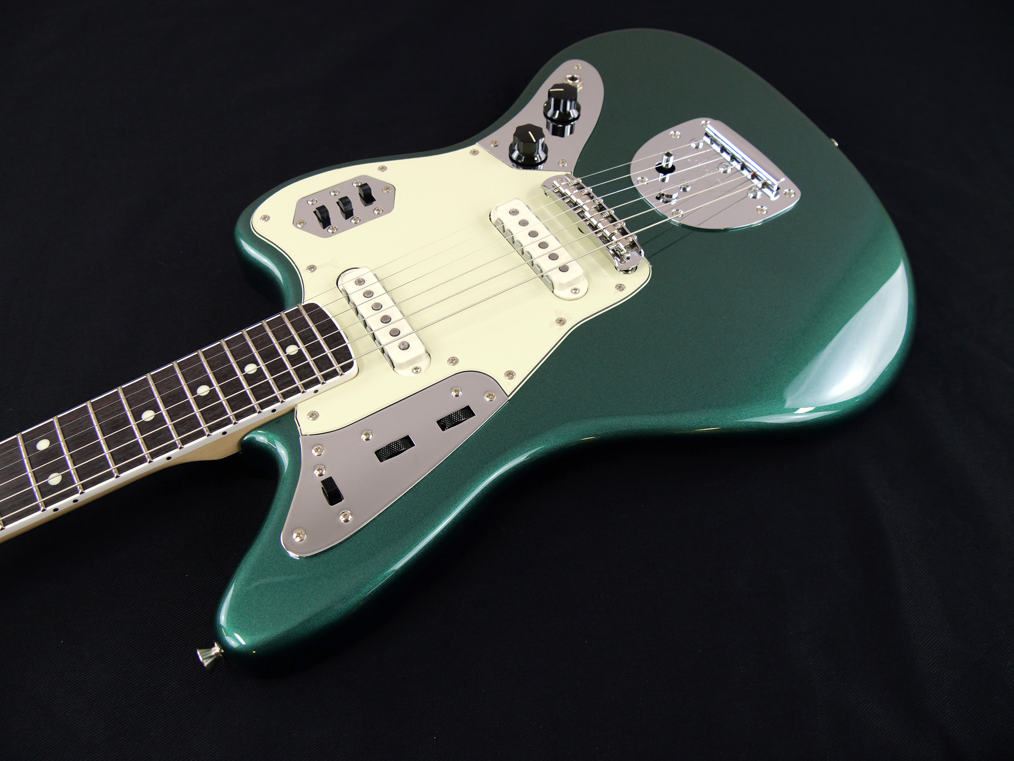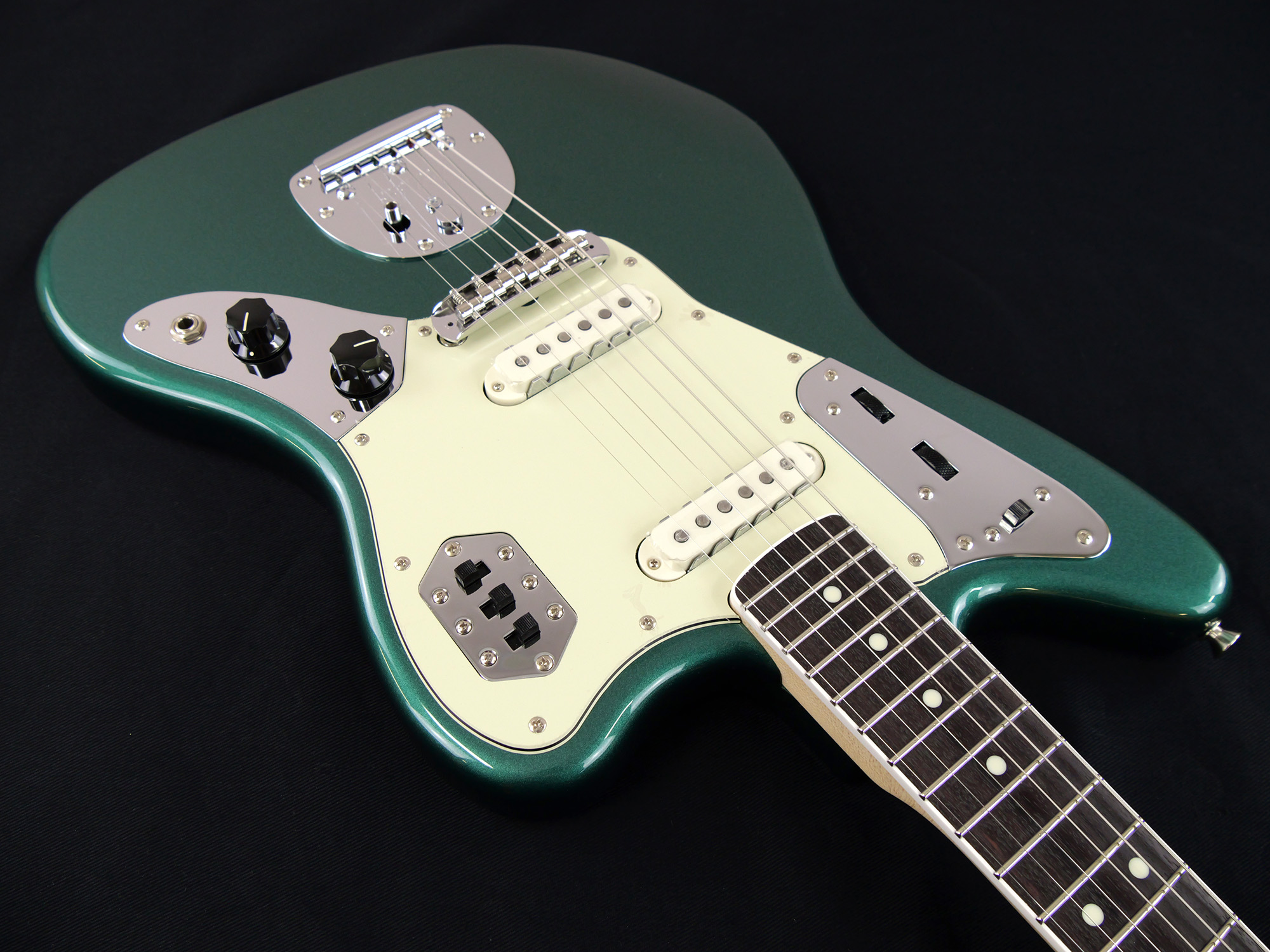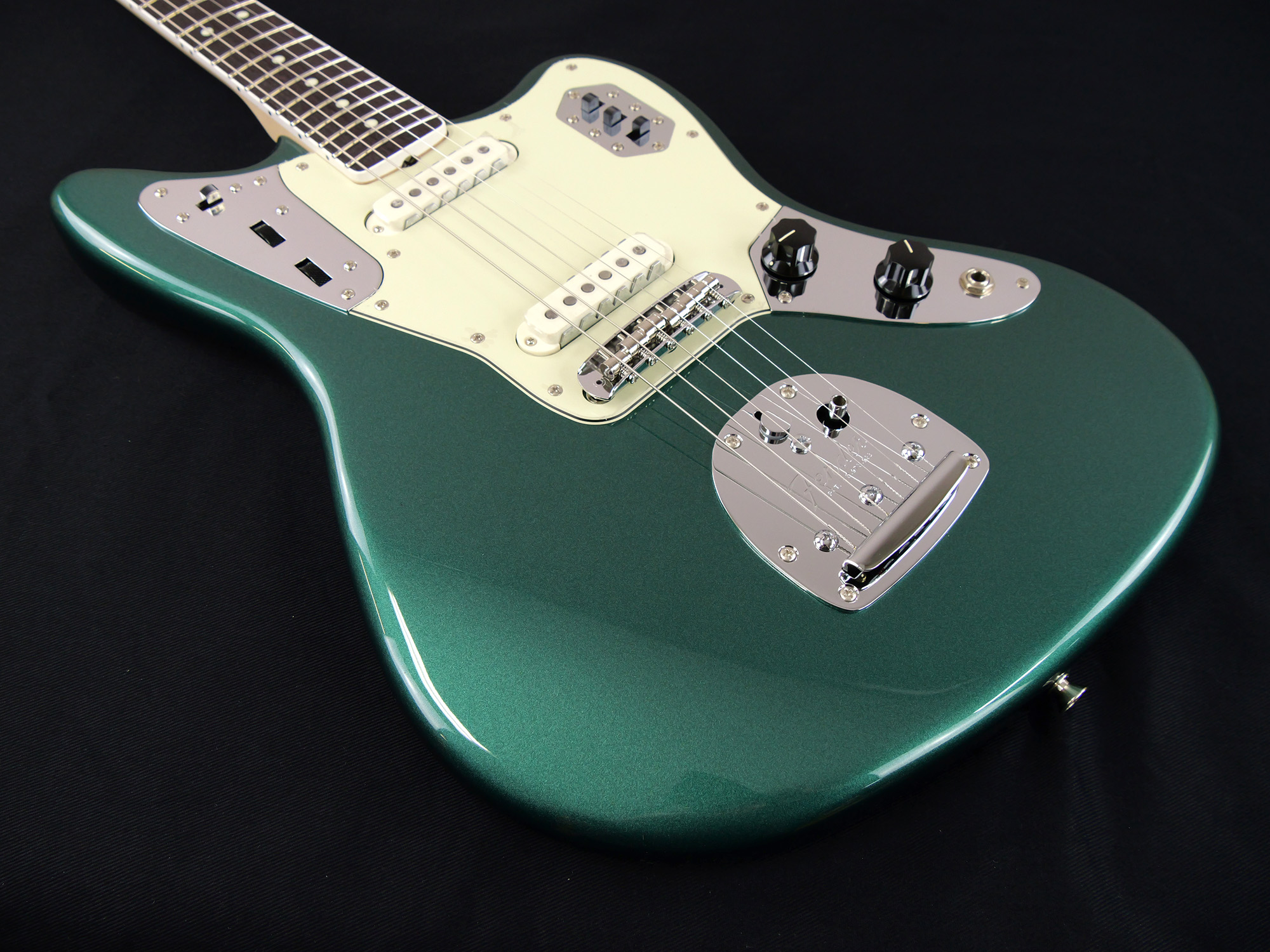 Made in Japan Traditional 60s Jaguar を基に、ボディ材をアルダーに、ピックアップをPure Vintage '65 Single-Coil Jaguarにアップグレード、ネックシェイプをMid '60s "C"、指板Rをヴィンテージ同様に7.25Radius、フレットをミディアム・ジャンボ・サイズ変更、ブリッジ・サドルを弦ズレの少ないムスタング・タイプに変更。