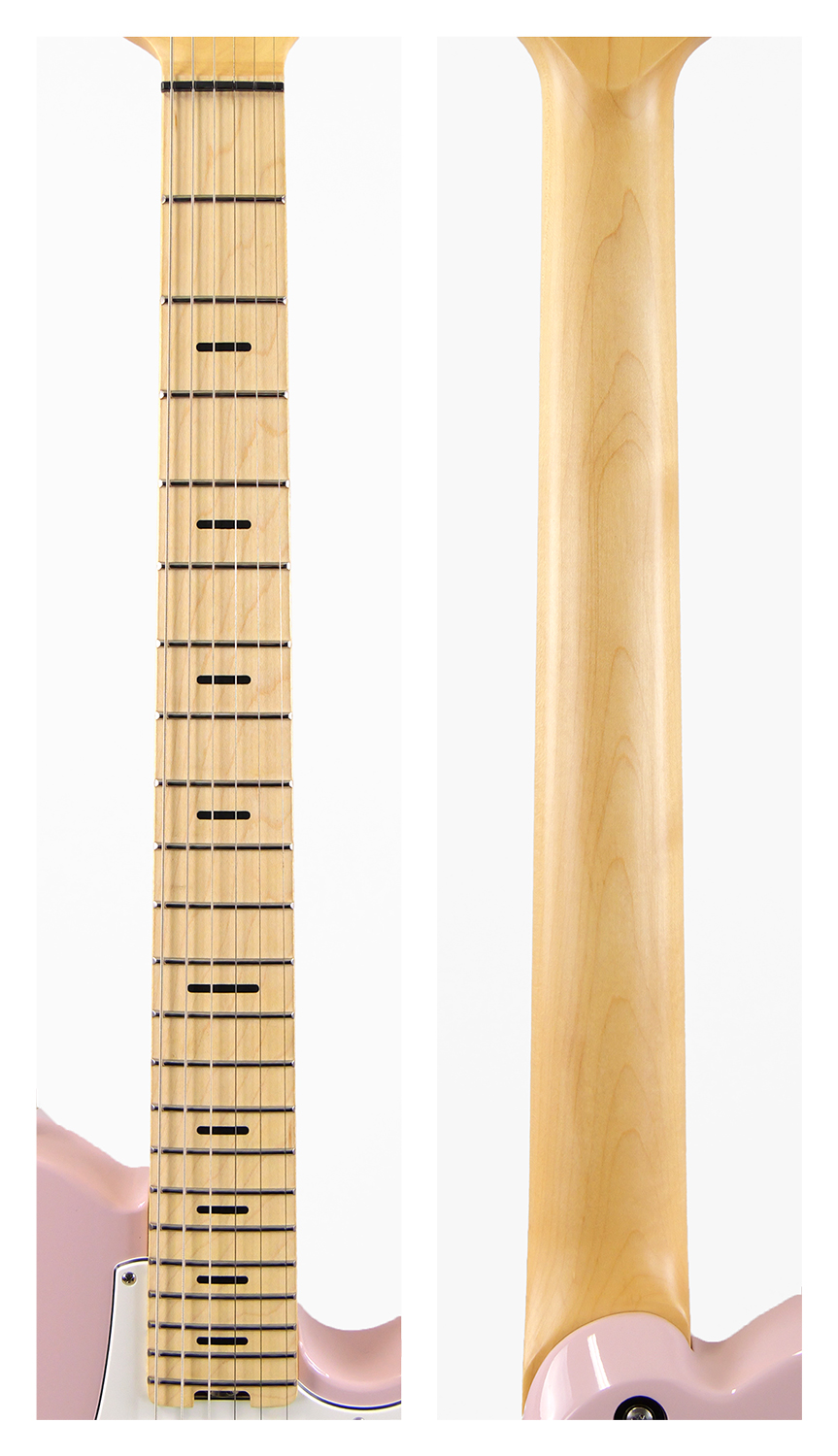 ネック背面は、木材の質感を味わいながら滑らかな弾き心地を実現するサテンフィニッシュ仕上げで、指板は温かみのある音色が特徴のローズウッド材と、明るい音色とキレのあるアタックが特徴のメイプル材の2種類を用意しました。『Pacifica SC Professional』ではコンパウンドラディアス指板を採用しており、一段高い演奏性をプレーヤーに提供します。