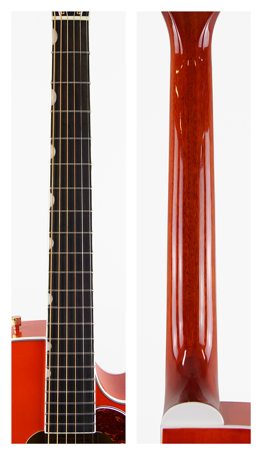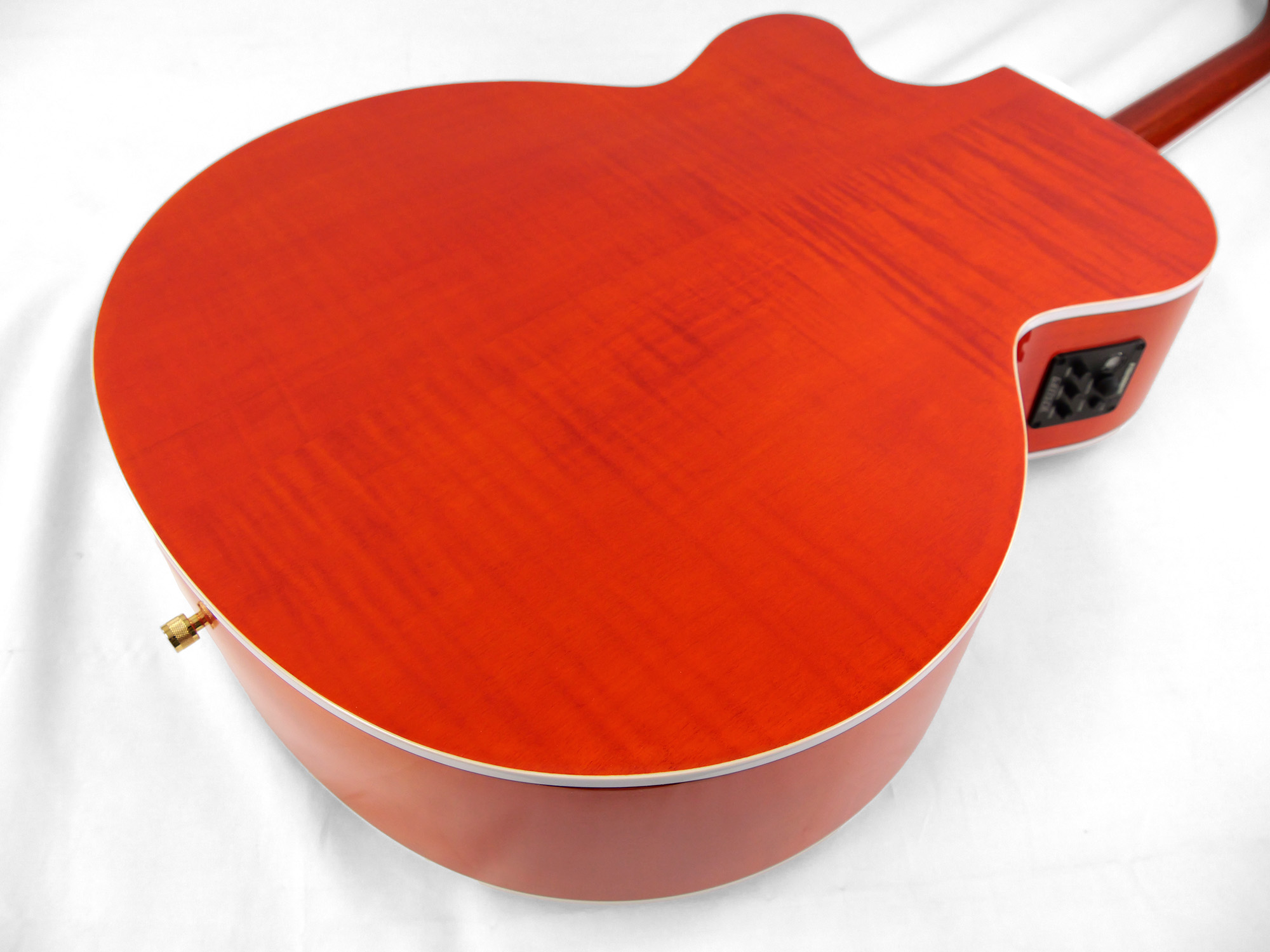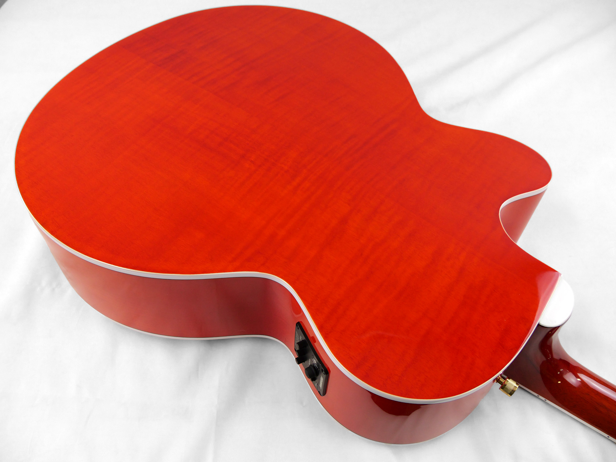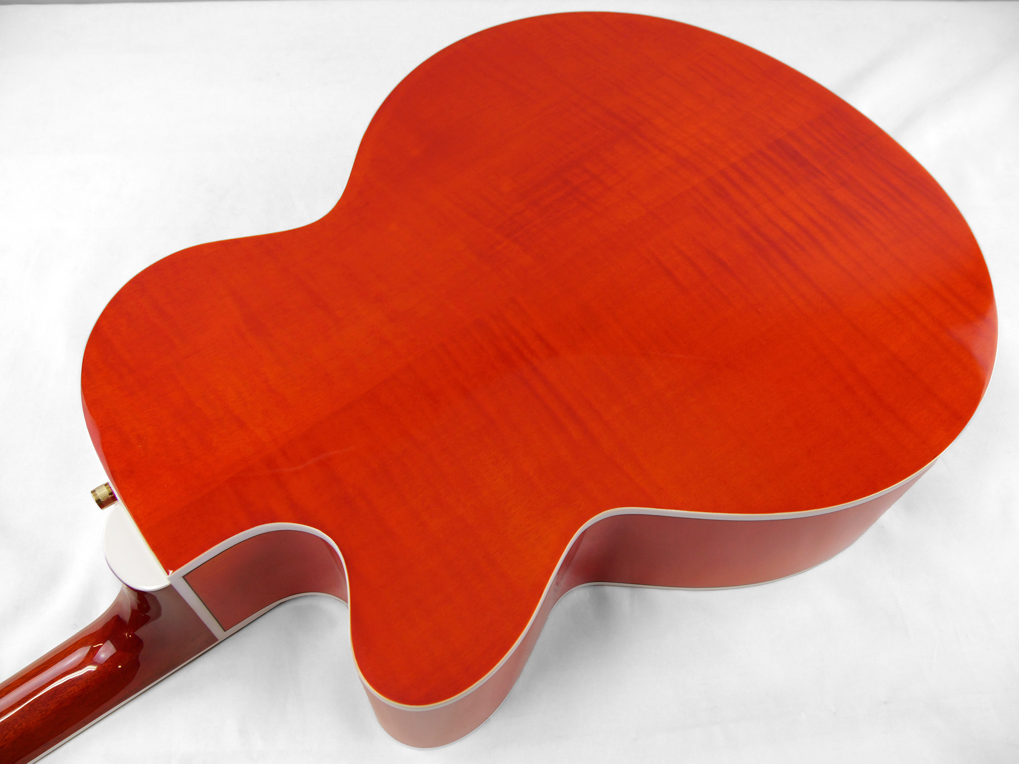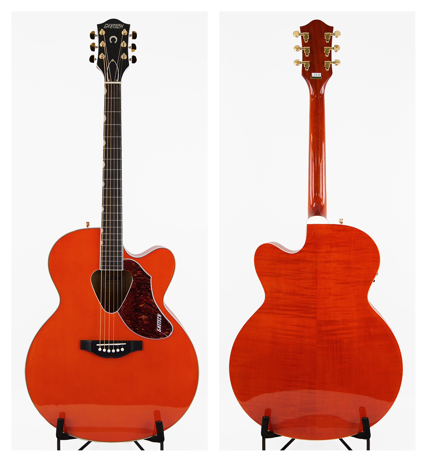 サバンナ・サンセットと名付けられたオレンジ色のボディは、単板スプルース・トップ、フレイム・メイプル・サイド&バックで構成され、ネックにはマホガニーを使用しています。ブリッジとフィンガーボードはローズウッドで、グレッチならではのネオ・クラッシック“サムネイル”ポジションマーカーを採用しています。