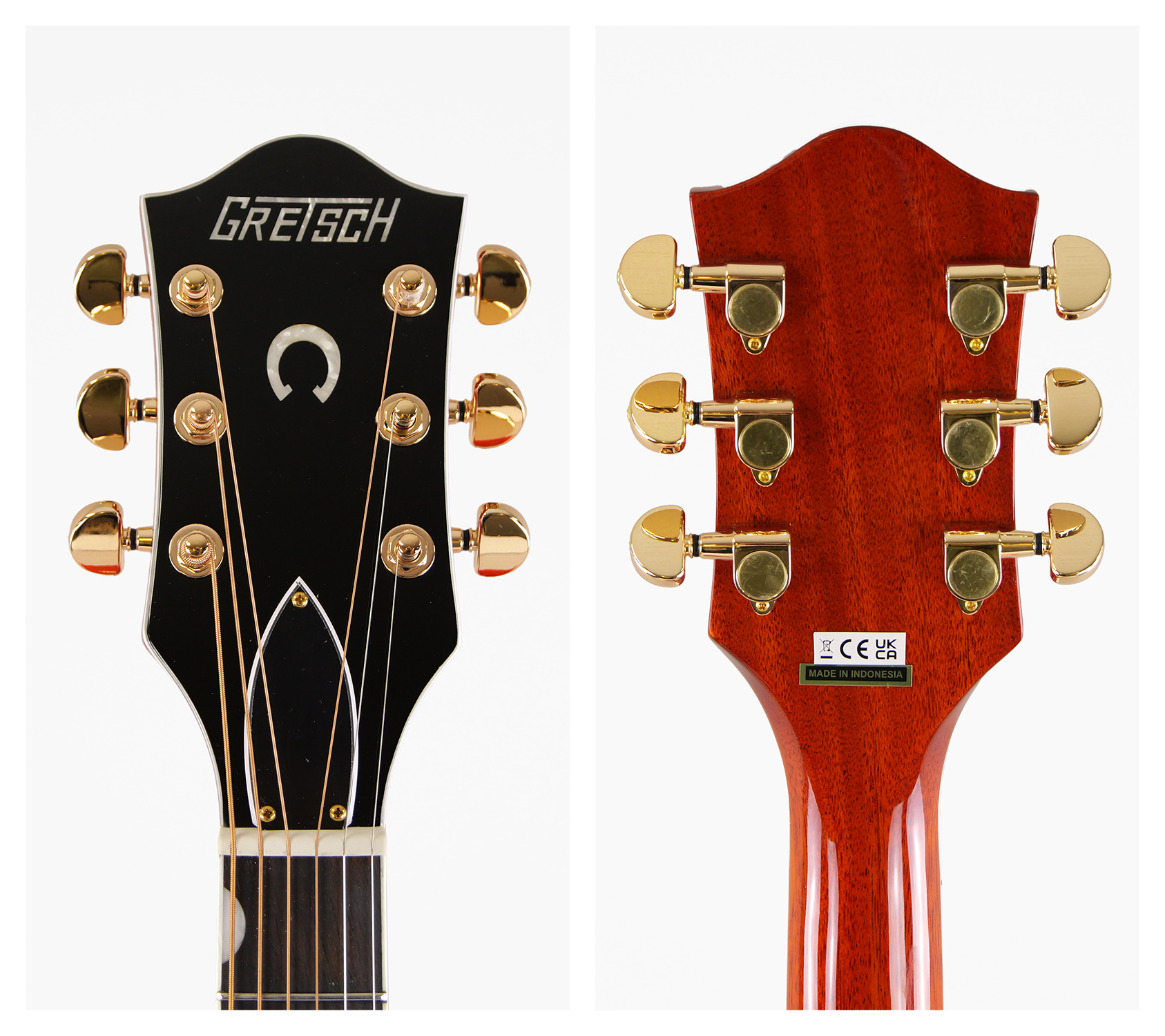 ヘッドには馬蹄のインレイが入り、ピックガードにはグレッチのロゴが入るなど、グレッチらしさをアピールしています。