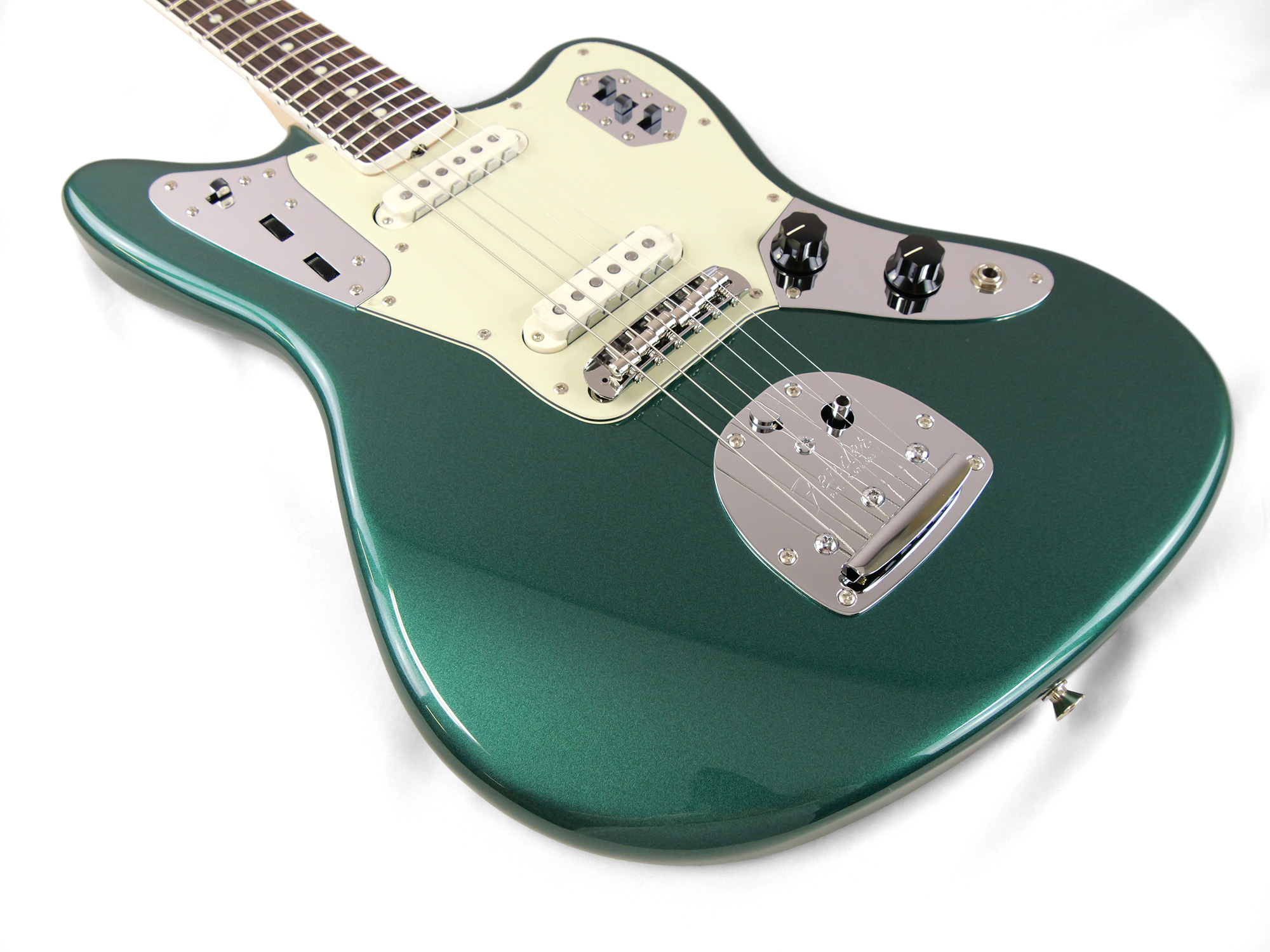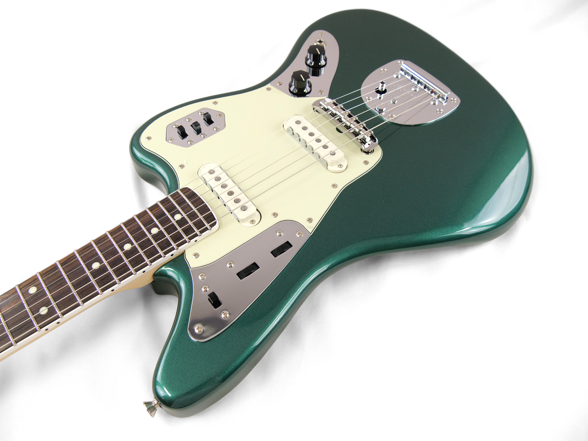Made in Japan Traditional 60s Jaguar を基に、ボディ材をアルダーに、ピックアップをPure Vintage '65 Single-Coil Jaguarにアップグレード、ネックシェイプをMid '60s "C"、指板Rをヴィンテージ同様に7.25Radius、フレットをミディアム・ジャンボ・サイズ変更、ブリッジ・サドルを弦ズレの少ないムスタング・タイプに変更。