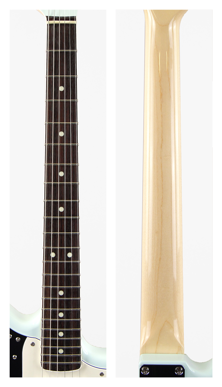 ソニック・ブルーのマッチング・ヘッド仕様、1964-1965の過渡期に使用されていたドット・ポジション・マーク、ネック・バインディングを再現。