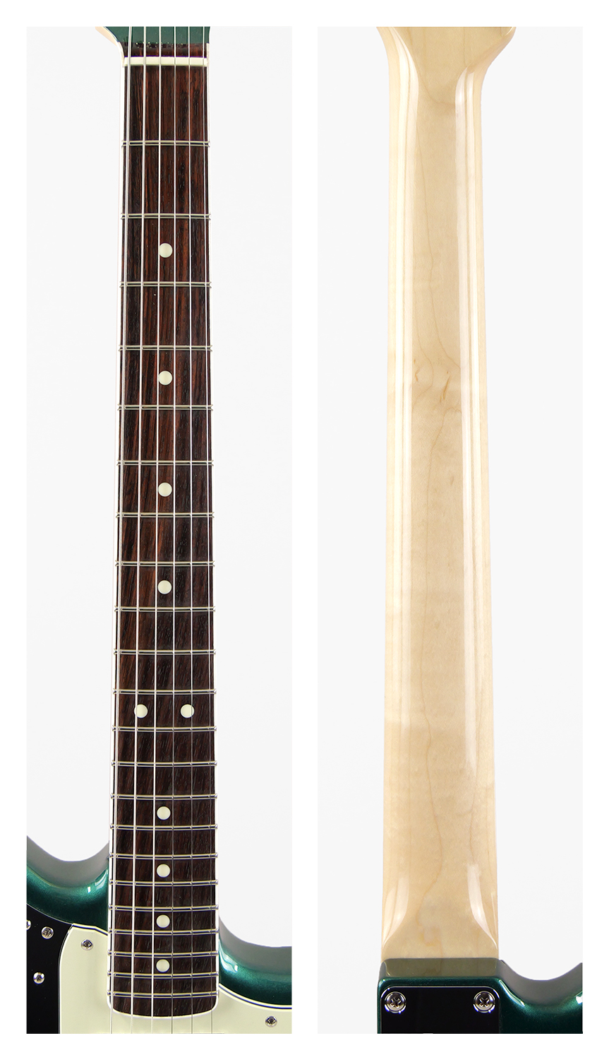 シャーウッド・グリーン・メタリックのマッチング・ヘッド仕様、1964-1965の過渡期に使用されていたドット・ポジション・マーク、ネック・バインディングを再現。