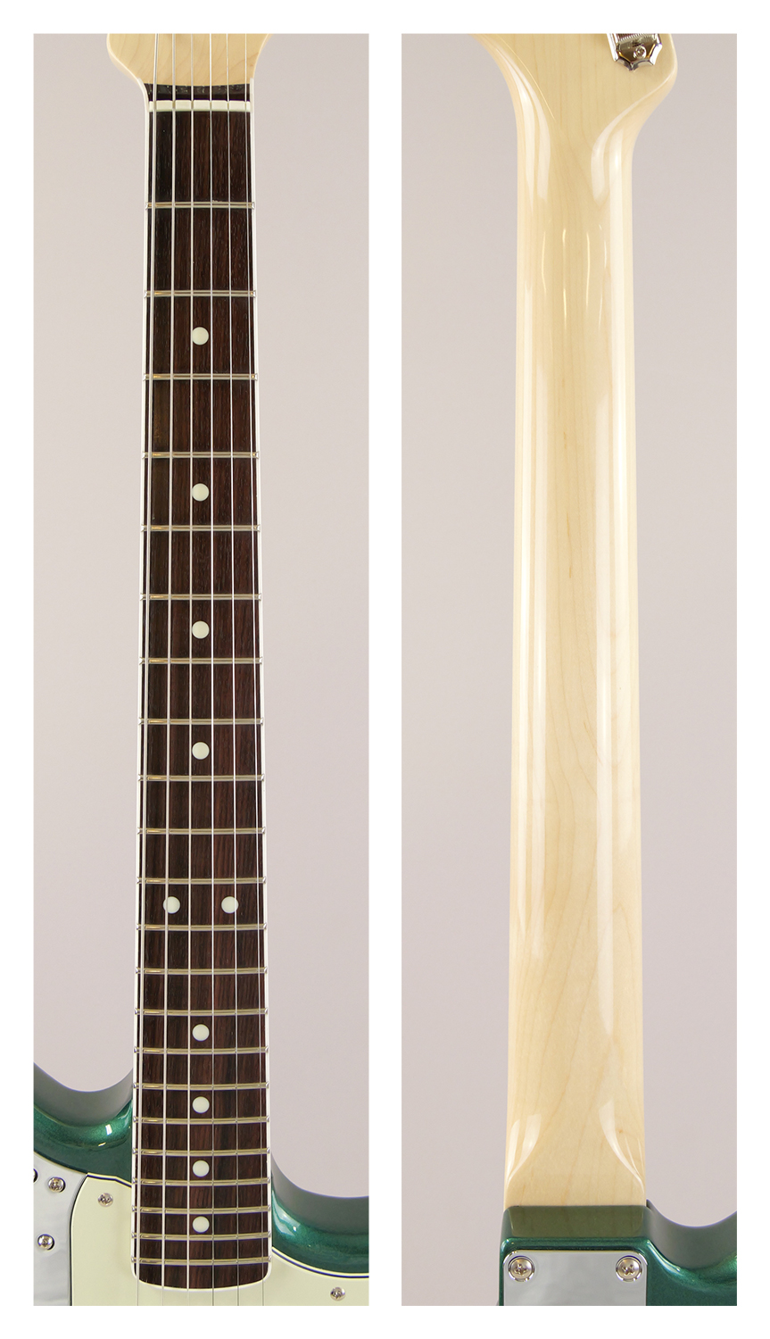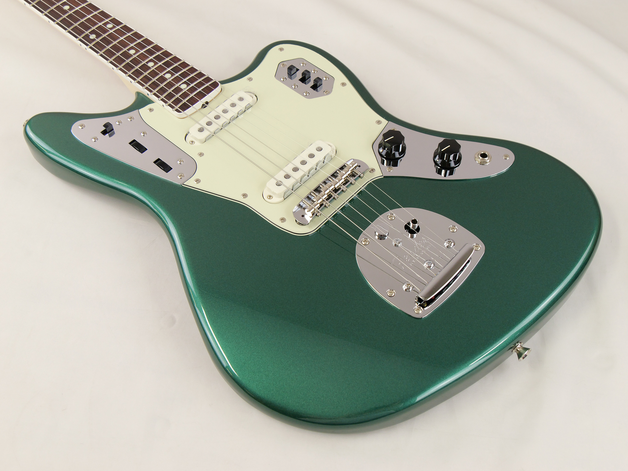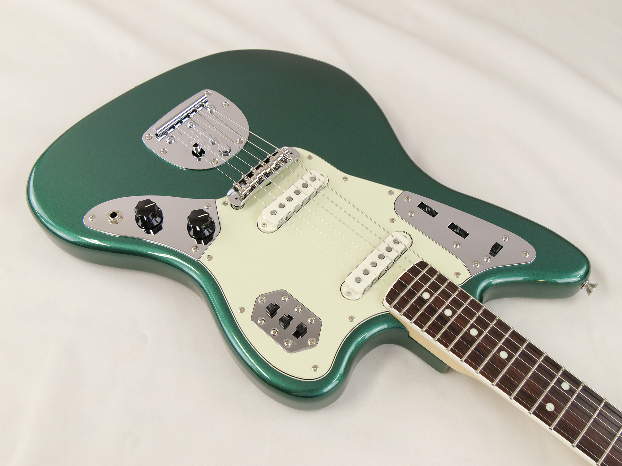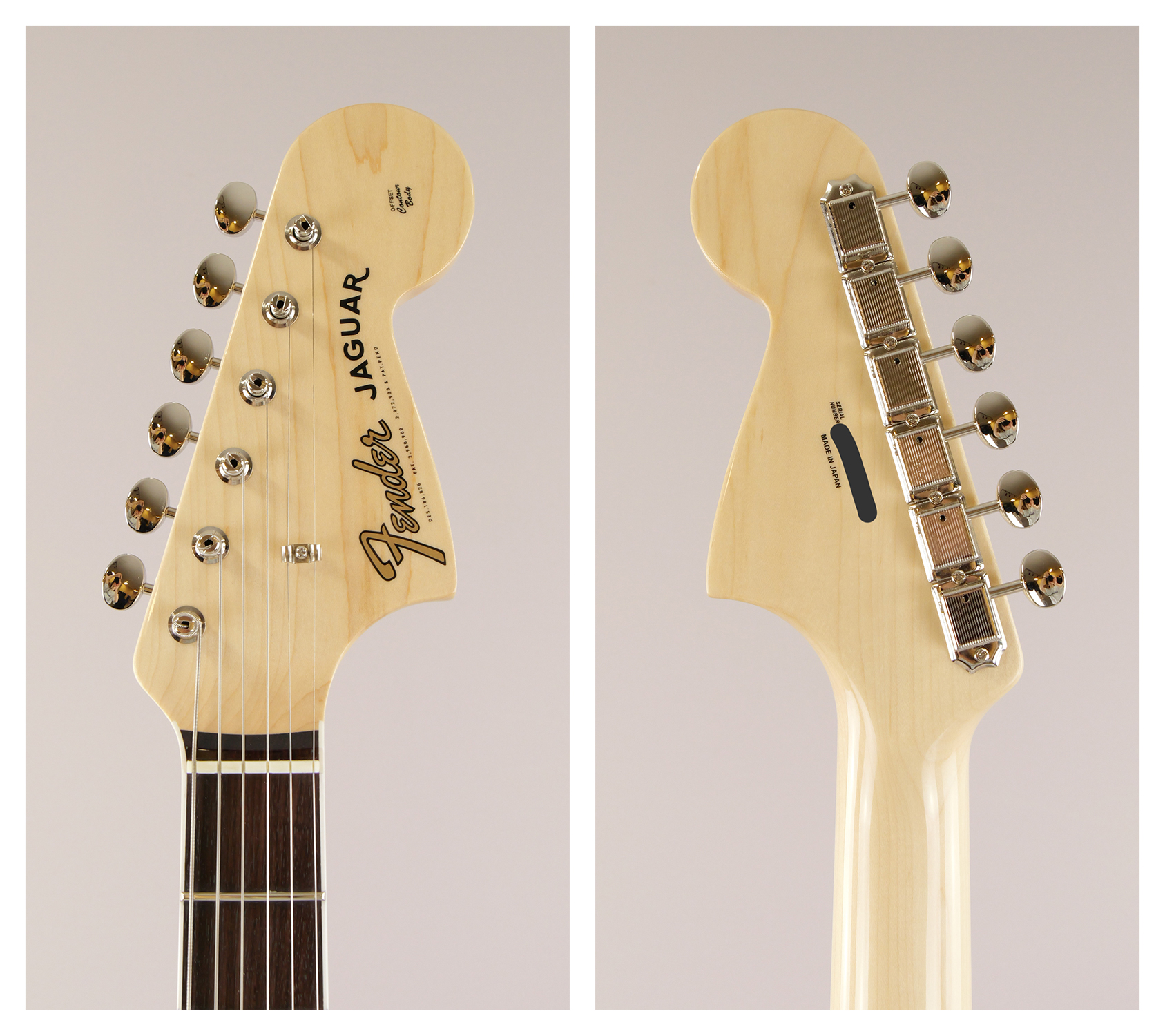 Made in Japan Traditional 60s Jaguar を基に、ボディ材をアルダーに、ピックアップをPure Vintage '65 Single-Coil Jaguarにアップグレード、ネックシェイプをMid '60s "C"、指板Rをヴィンテージ同様に7.25Radius、フレットをミディアム・ジャンボ・サイズ変更、ブリッジ・サドルを弦ズレの少ないムスタング・タイプに変更。