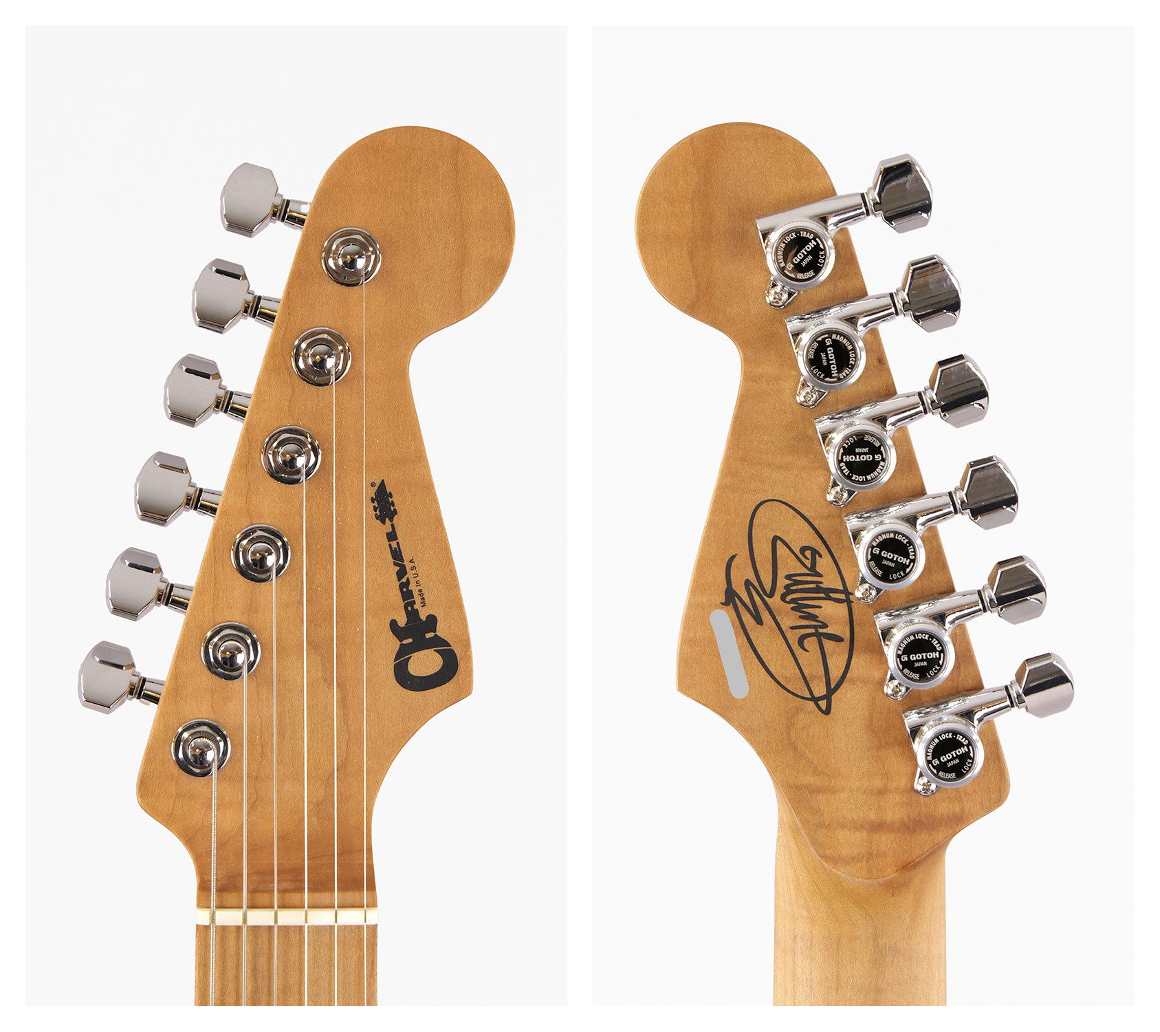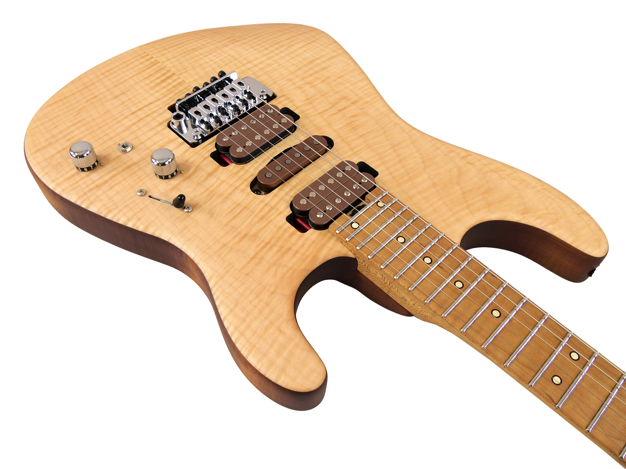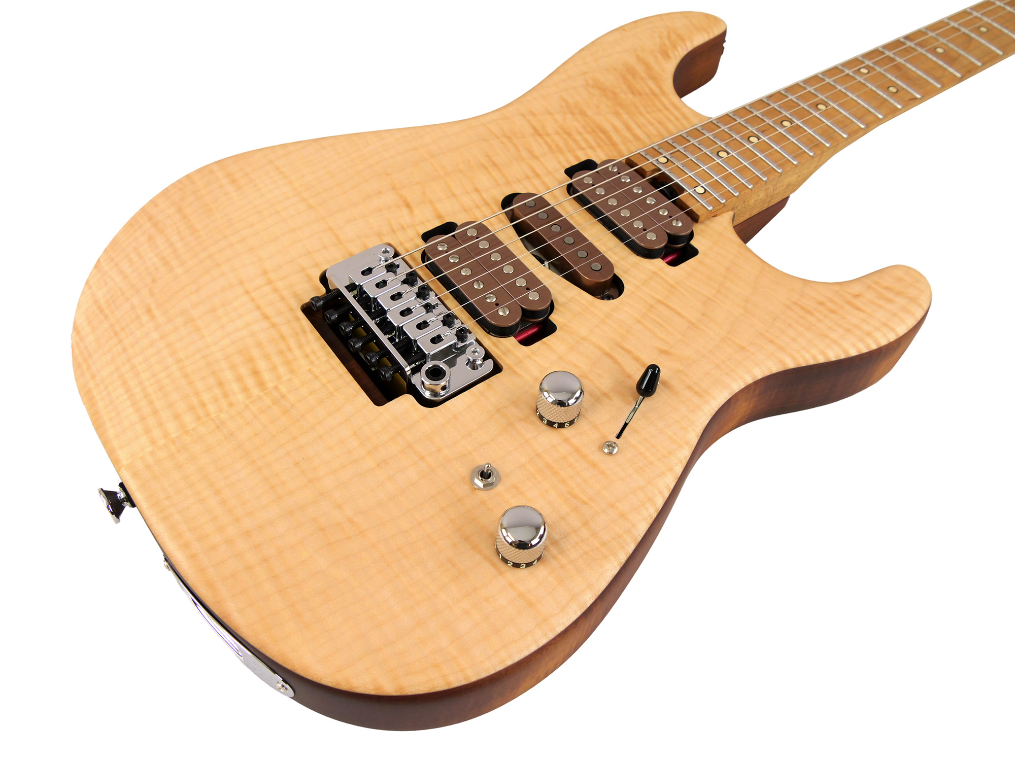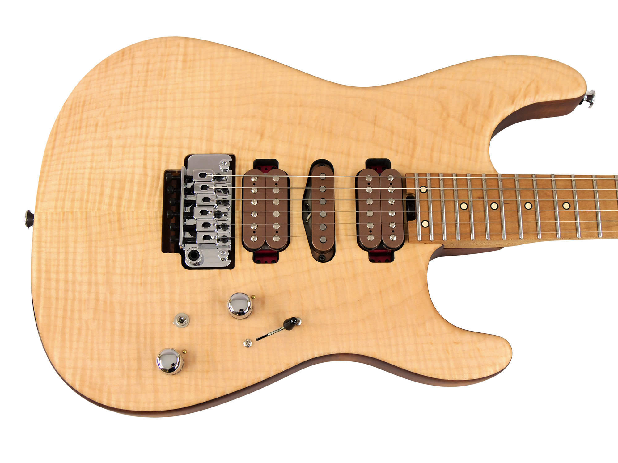 25.5インチスケールのギター、Guthrie Govan USA Signature HSH Flame Maple は、ハイポジションへも楽にアクセスできる特別なヒールカット(Sansネックプレート)加工を施され、薄いサテンウレタン仕上げの豪華なフレイムメイプルをまとった、キャラメルバスウッド製のSan Dimass®ボディを採用しています。