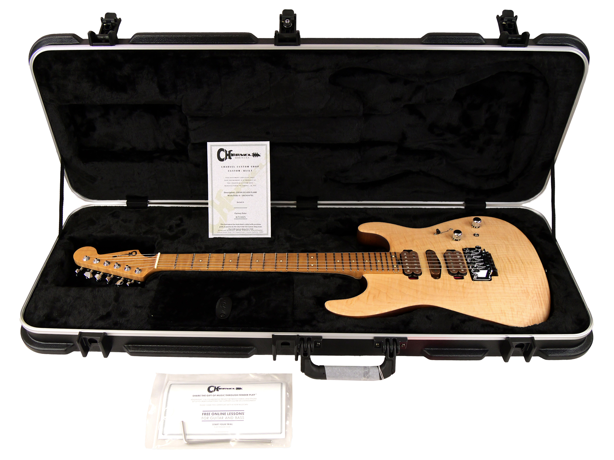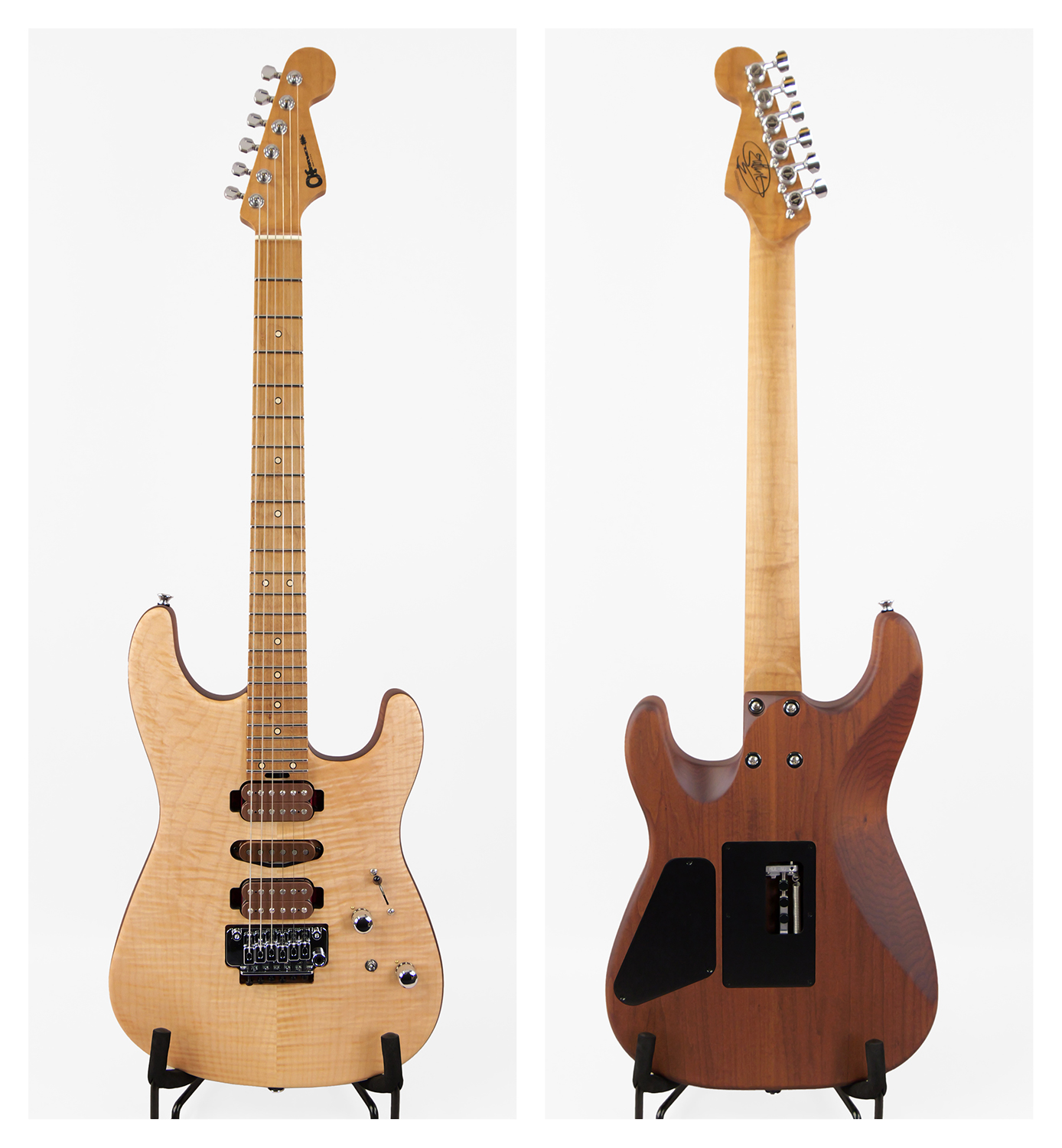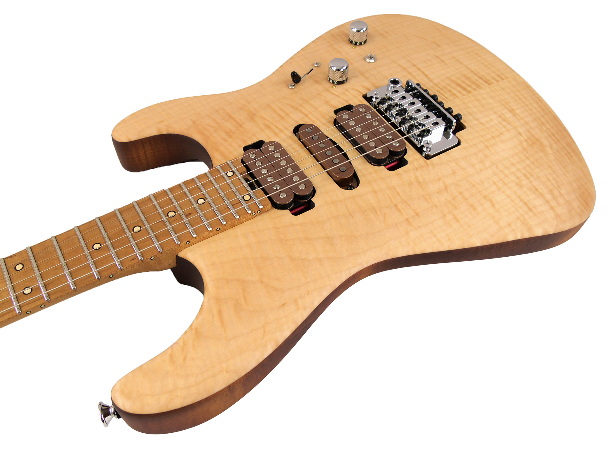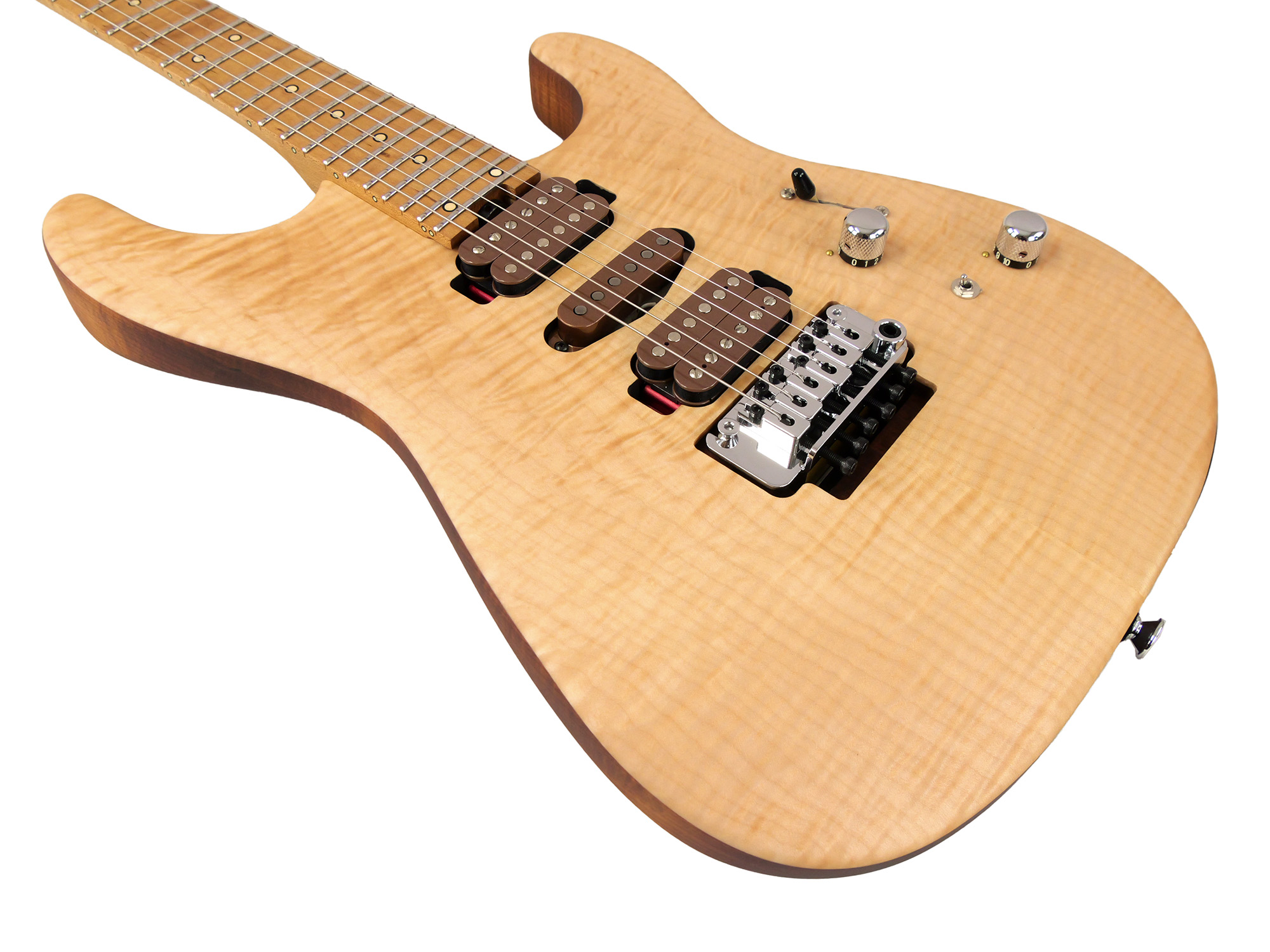 25.5インチスケールのギター、Guthrie Govan USA Signature HSH Flame Maple は、ハイポジションへも楽にアクセスできる特別なヒールカット(Sansネックプレート)加工を施され、薄いサテンウレタン仕上げの豪華なフレイムメイプルをまとった、キャラメルバスウッド製のSan Dimass®ボディを採用しています。