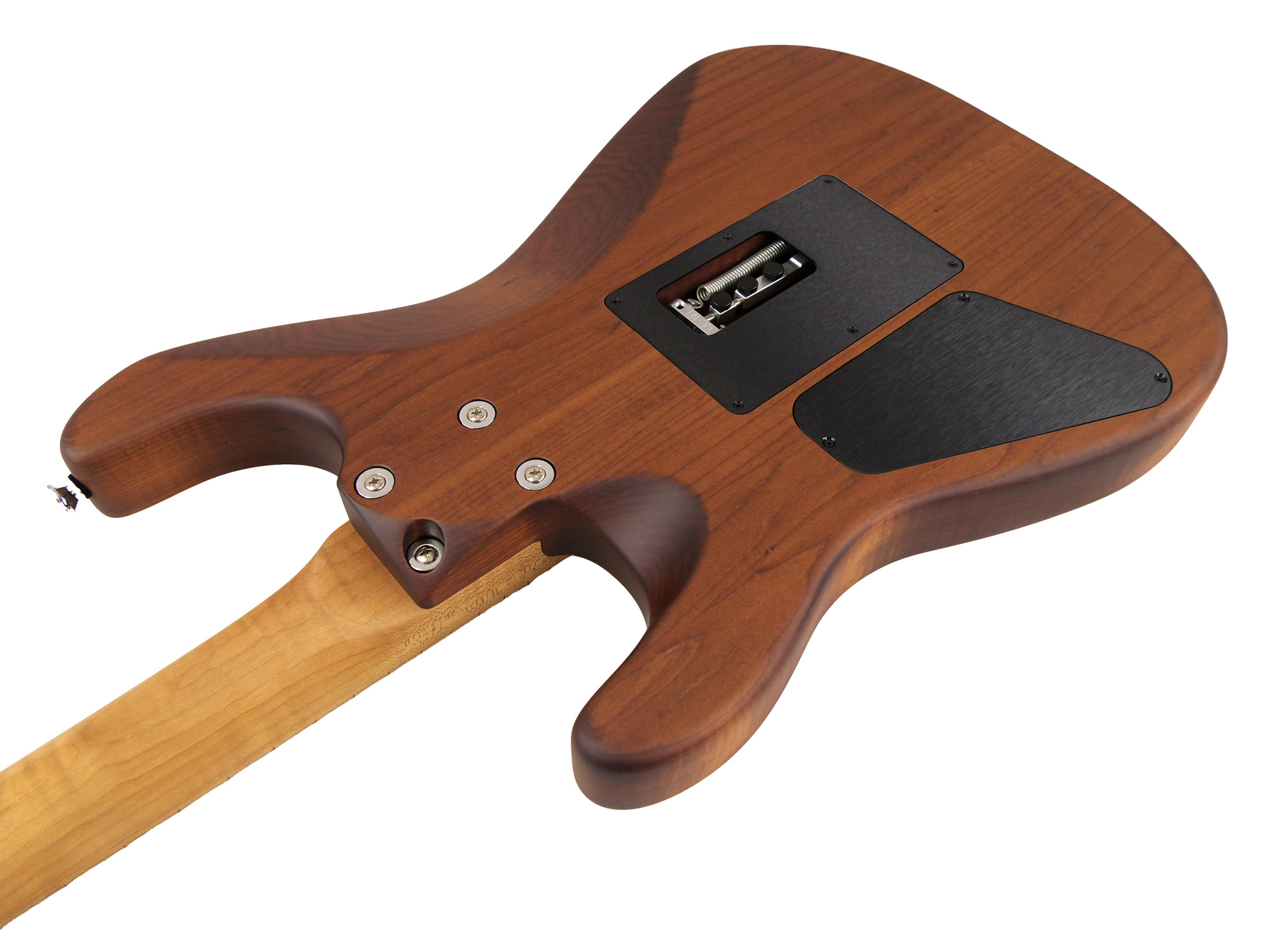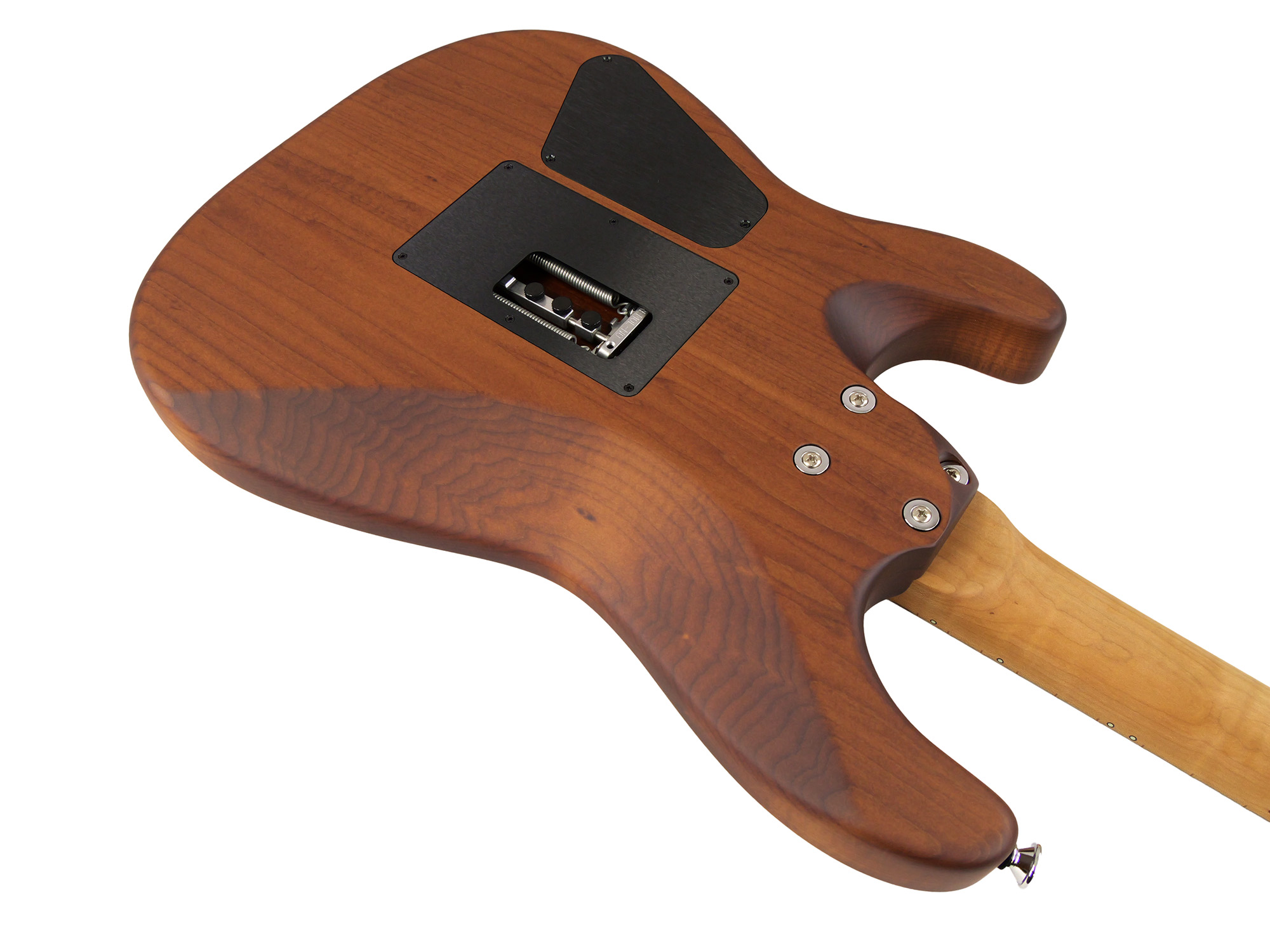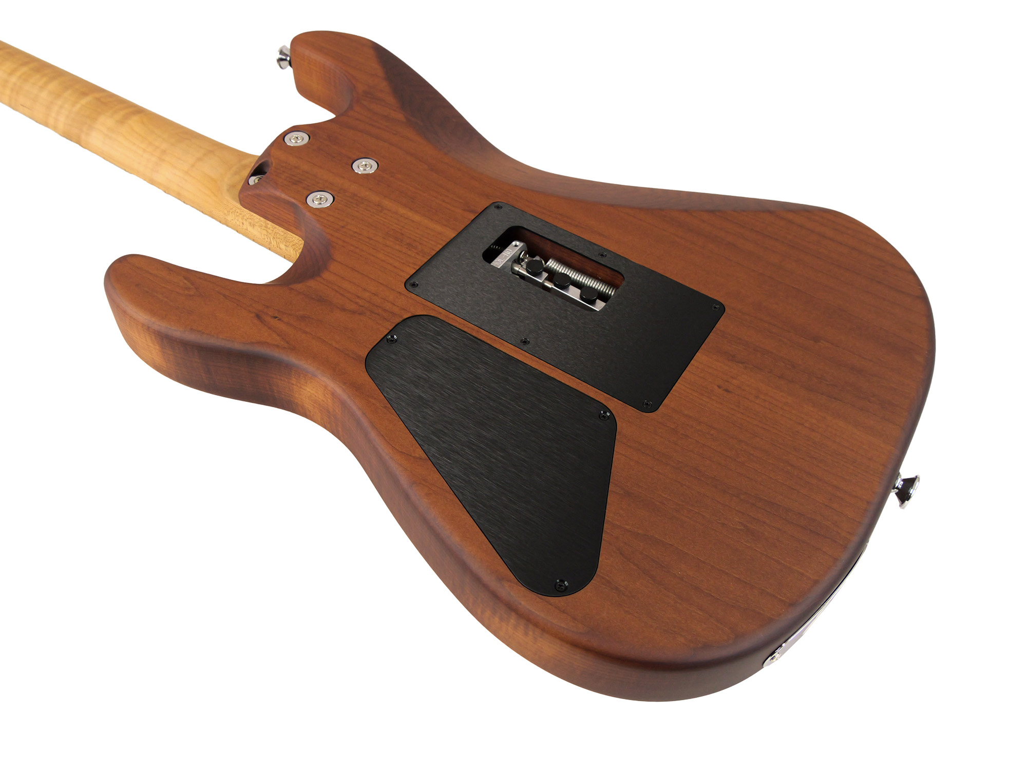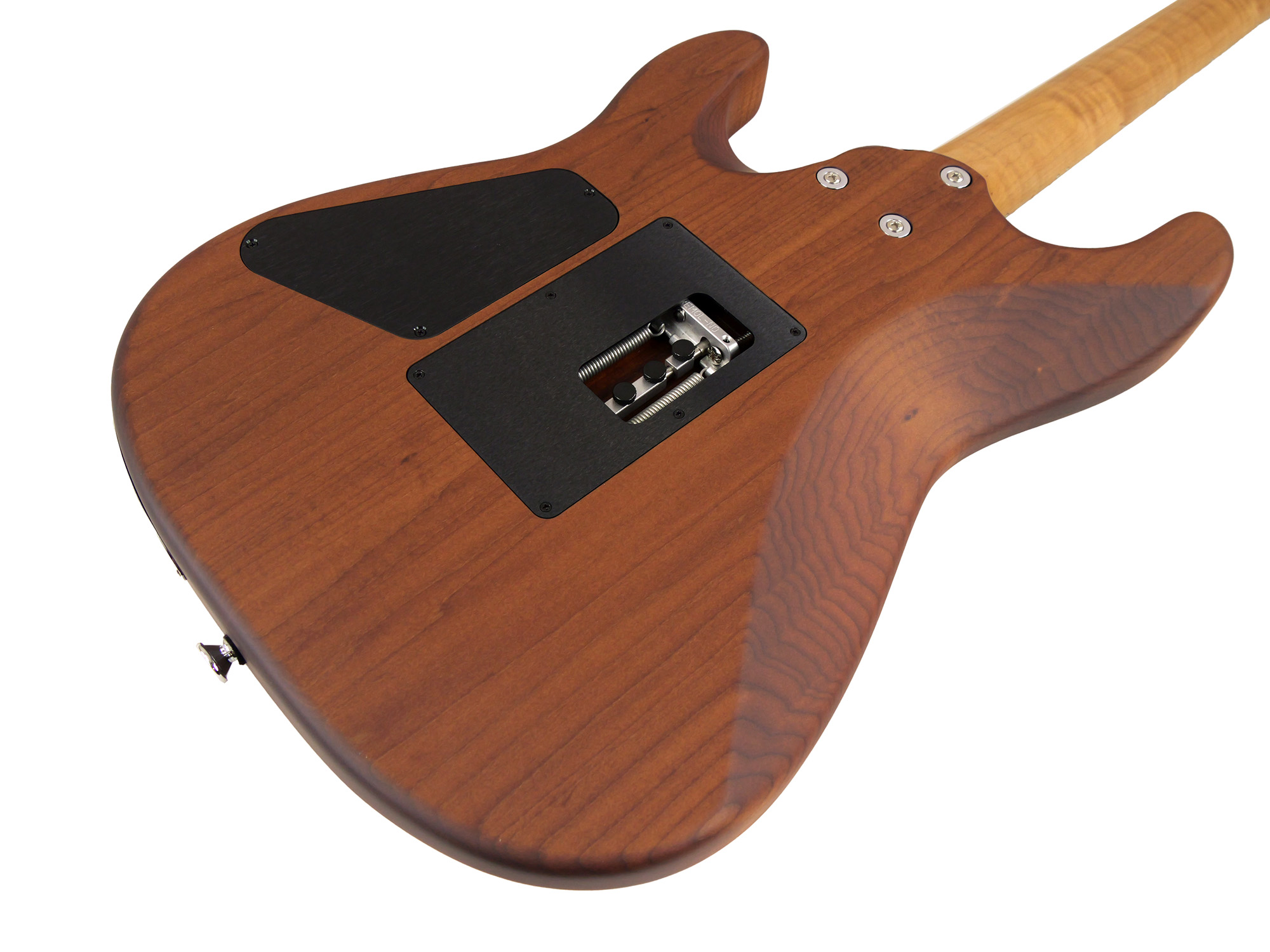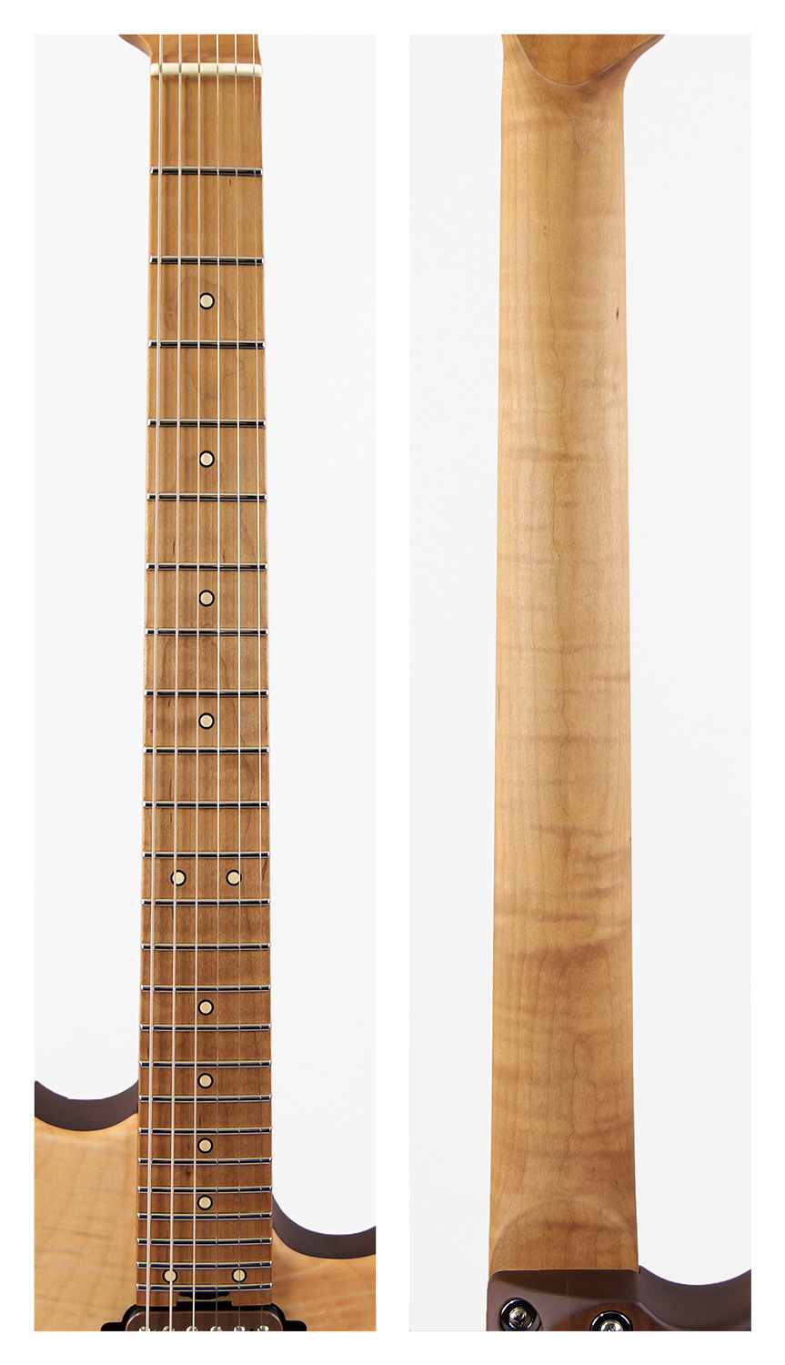 ボルトオン式フレイムメイプルネックは、グラファイト補強され、ネック背面は手作業によるウレタン仕上げに加え、便利なヒールマウント式トラスロッドアジャストメントを備えており、その「キャラメル」されたホットなサウンドは枯れた音でよく鳴るように十分に乾燥されています。