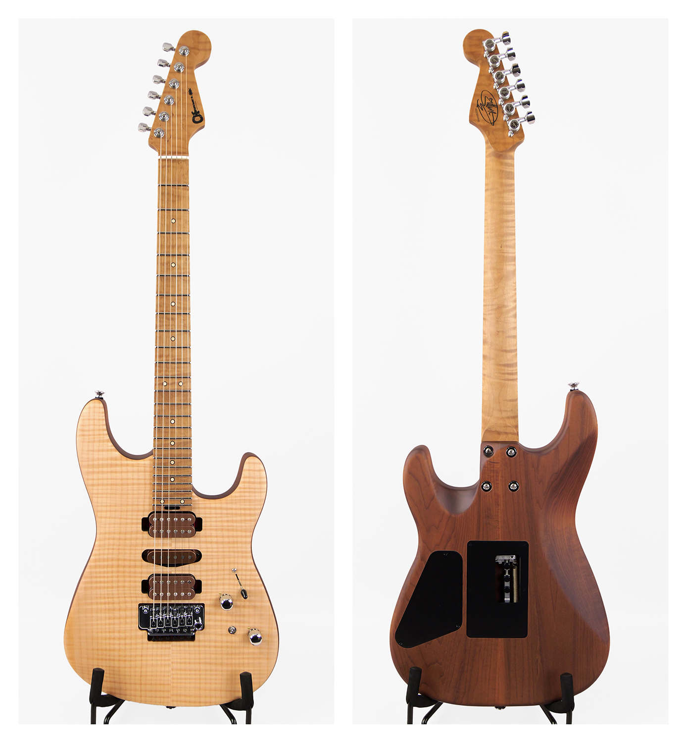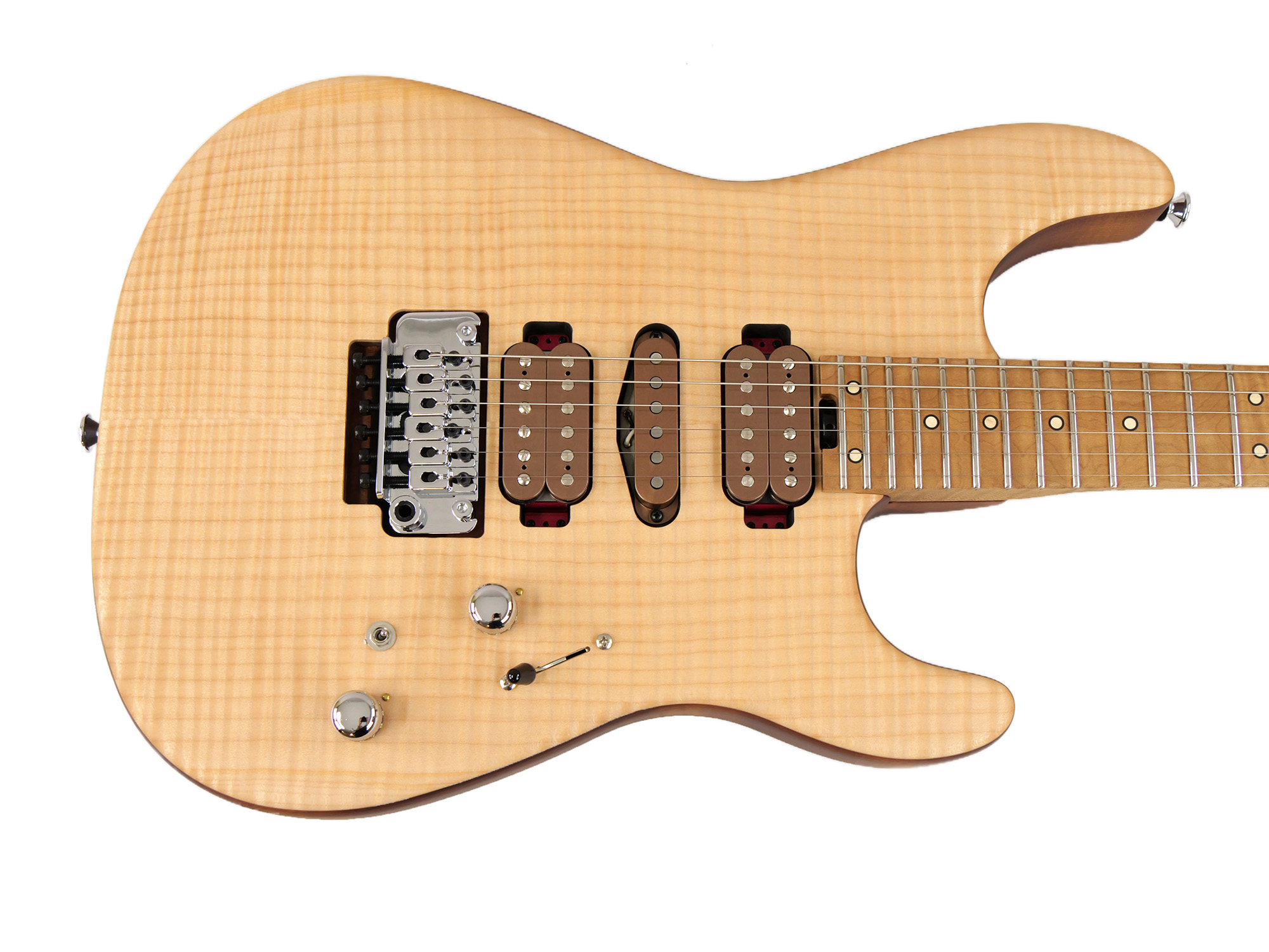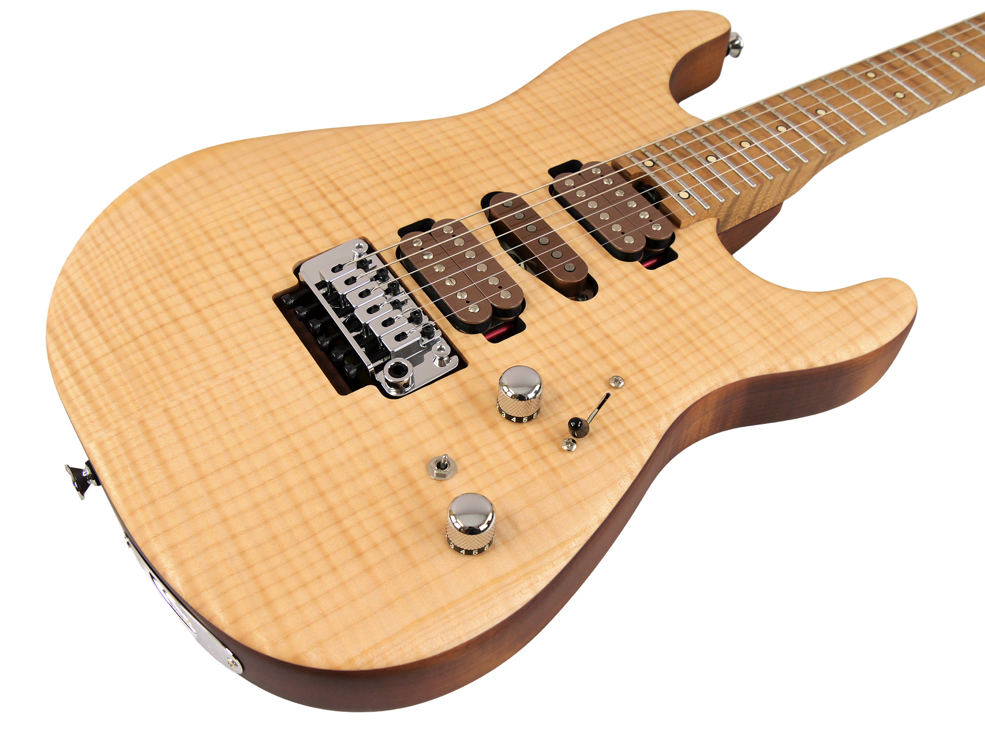 25.5インチスケールのギター、Guthrie Govan USA Signature HSH Flame Maple は、ハイポジションへも楽にアクセスできる特別なヒールカット(Sansネックプレート)加工を施され、薄いサテンウレタン仕上げの豪華なフレイムメイプルをまとった、キャラメルバスウッド製のSan Dimassボディを採用しています。