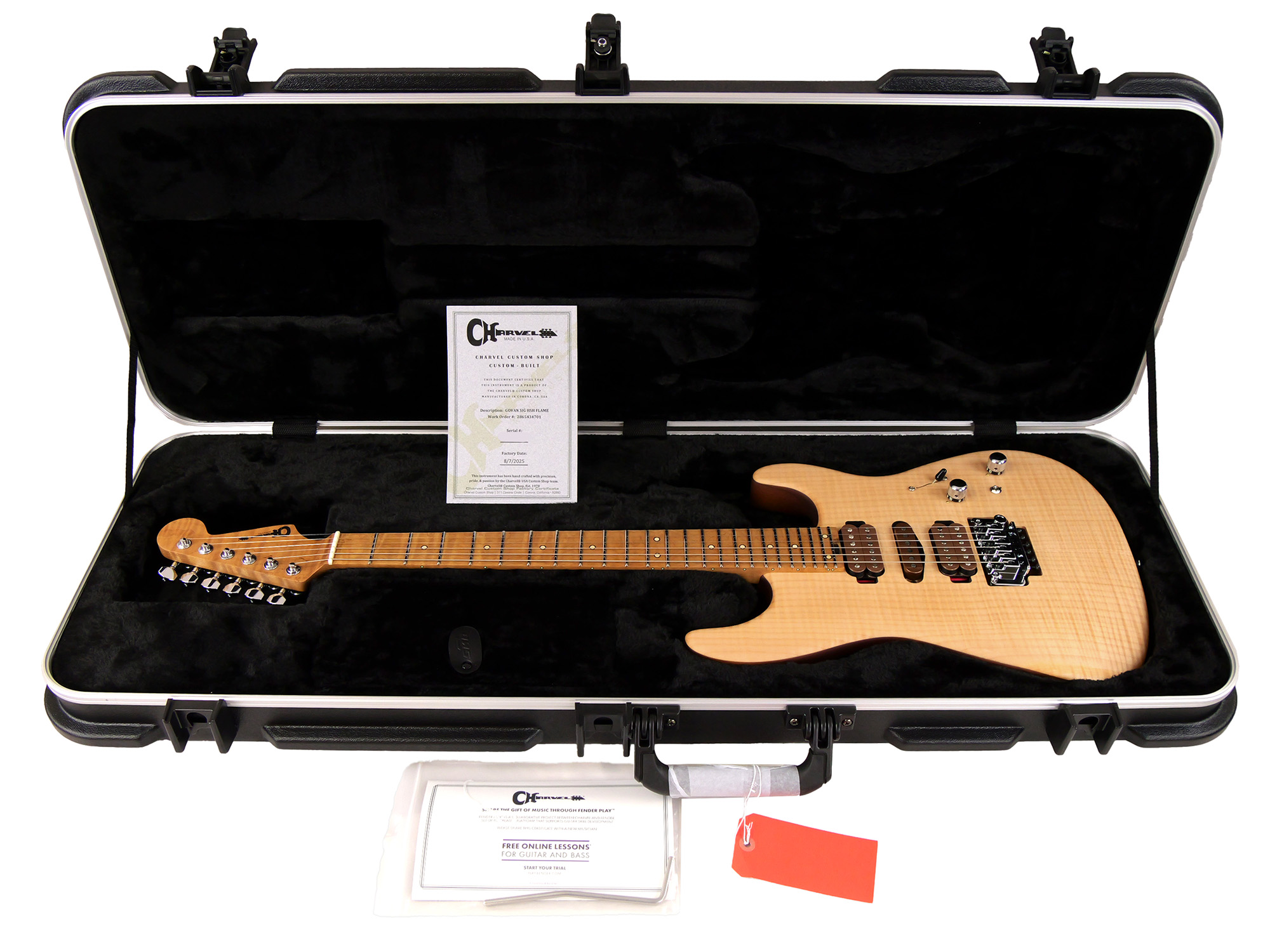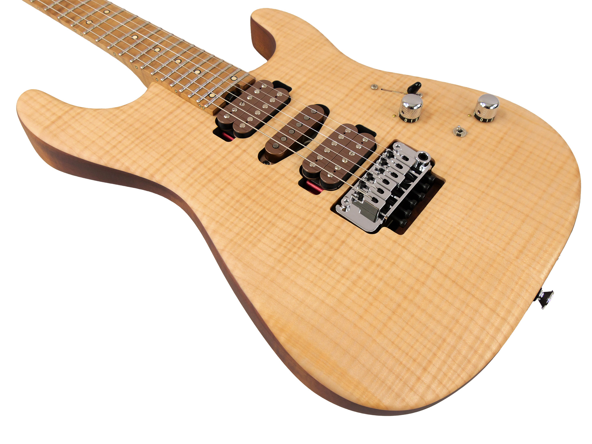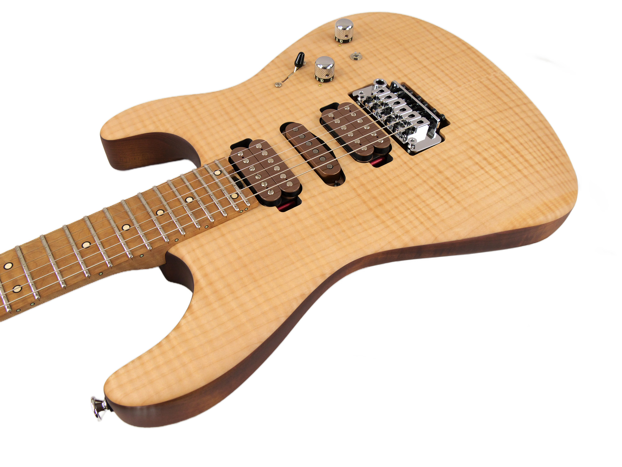 25.5インチスケールのギター、Guthrie Govan USA Signature HSH Flame Maple は、ハイポジションへも楽にアクセスできる特別なヒールカット(Sansネックプレート)加工を施され、薄いサテンウレタン仕上げの豪華なフレイムメイプルをまとった、キャラメルバスウッド製のSan Dimassボディを採用しています。