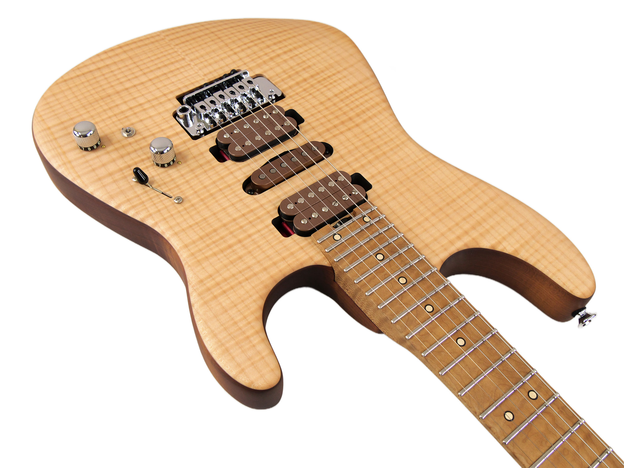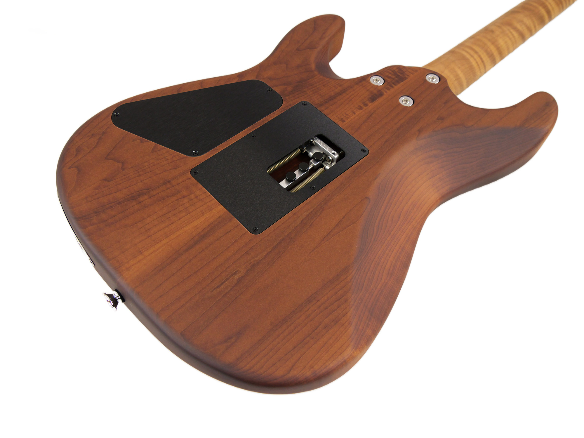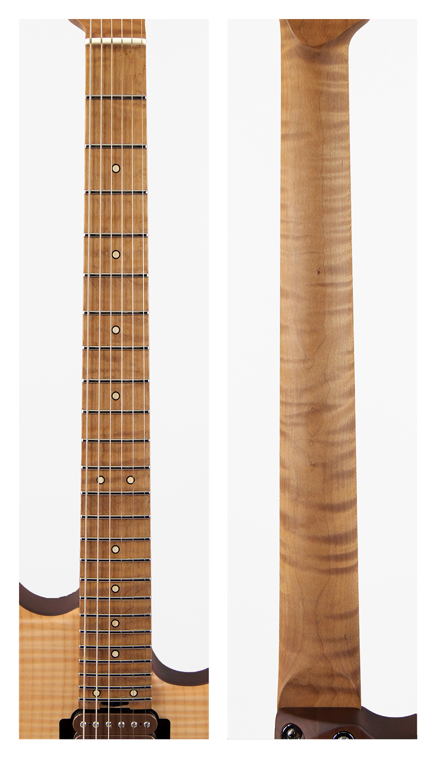 ボルトオン式フレイムメイプルネックは、グラファイト補強され、ネック背面は手作業によるウレタン仕上げに加え、便利なヒールマウント式トラスロッドアジャストメントを備えており、その「キャラメル」されたホットなサウンドは枯れた音でよく鳴るように十分に乾燥されています。