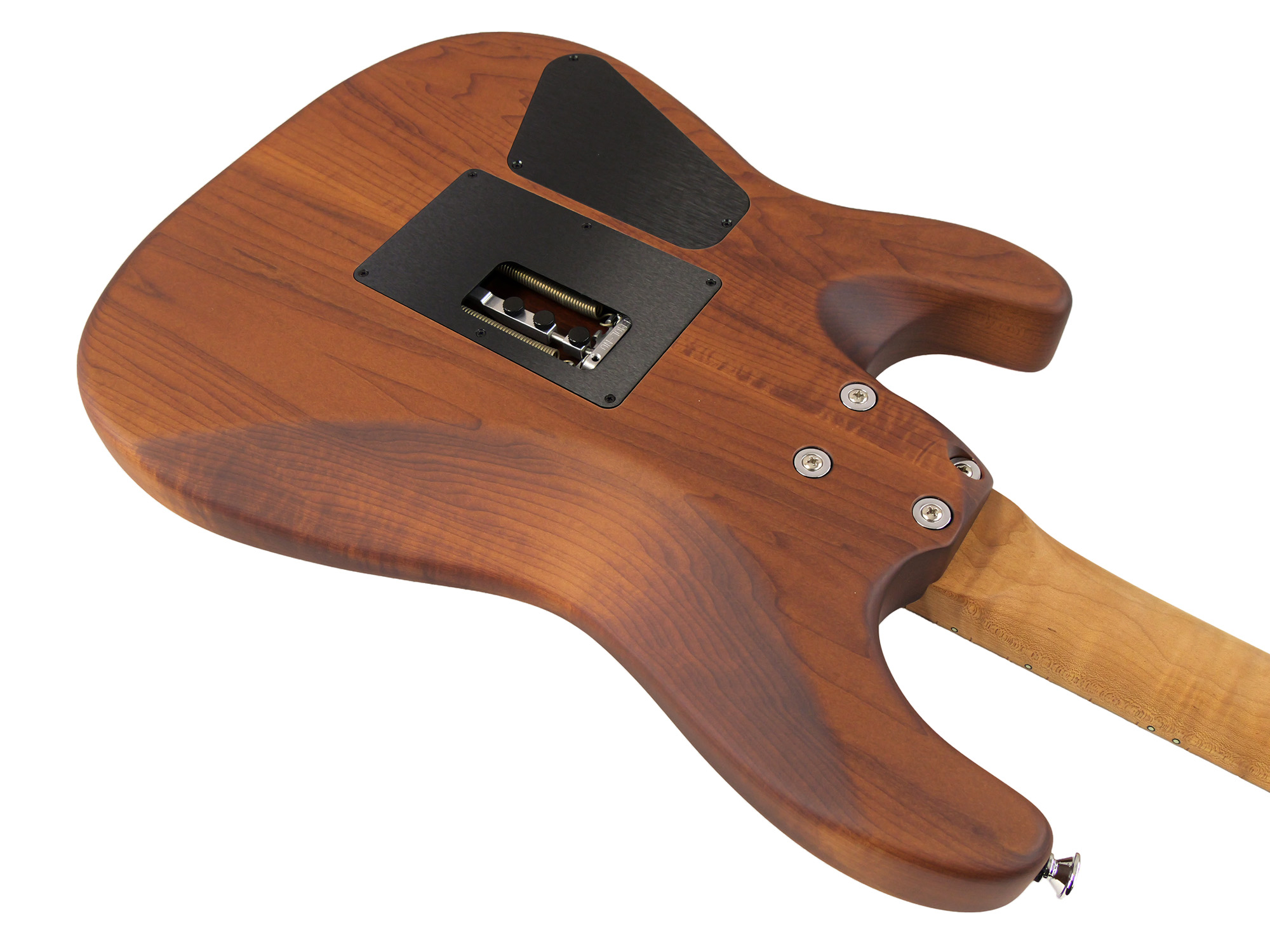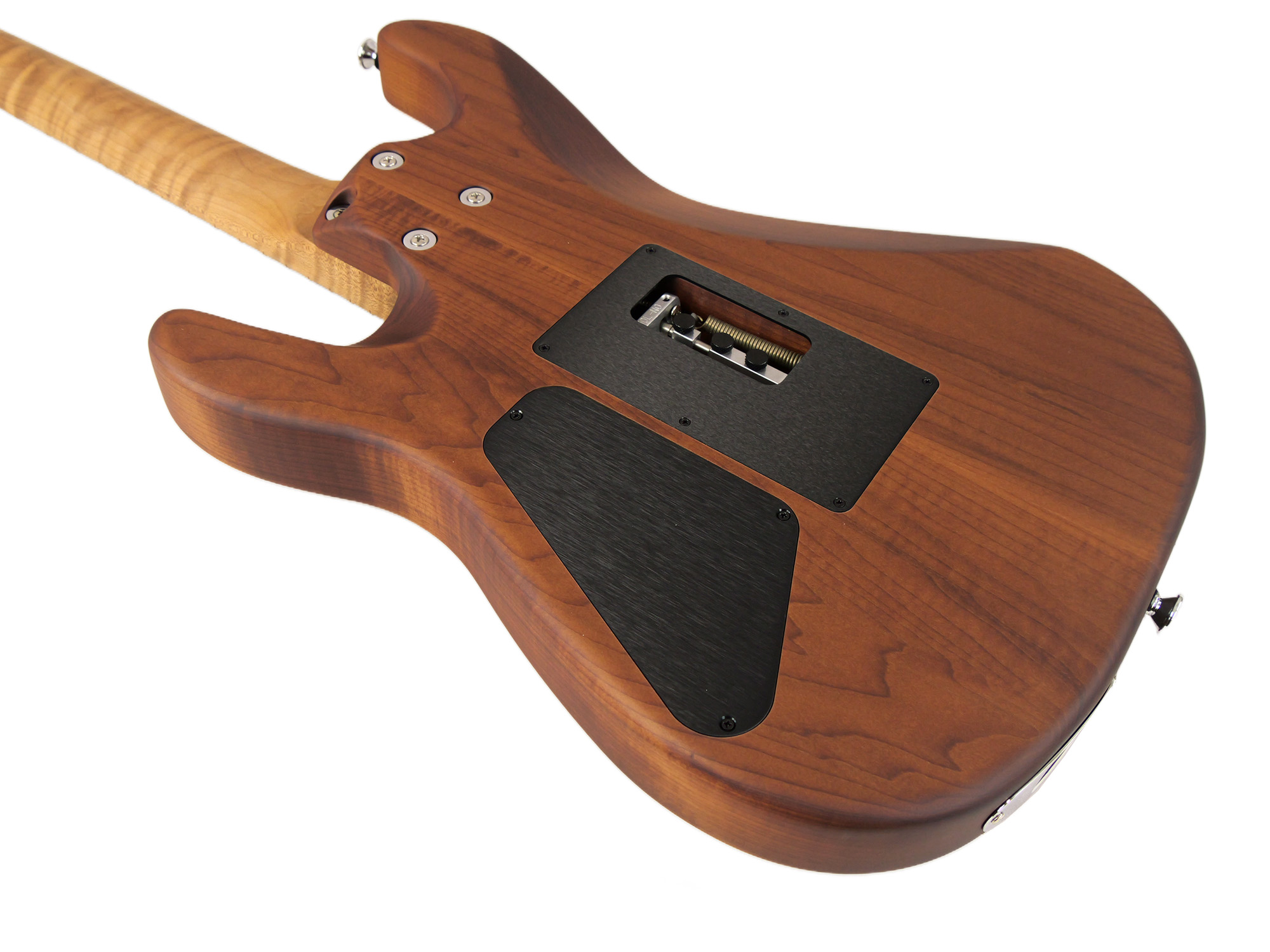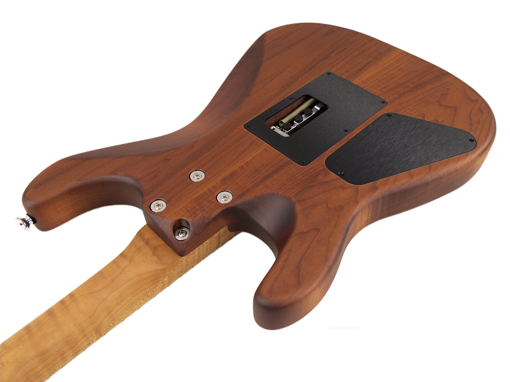 ボルトオン式フレイムメイプルネックは、グラファイト補強され、ネック背面は手作業によるウレタン仕上げに加え、便利なヒールマウント式トラスロッドアジャストメントを備えており、その「キャラメル」されたホットなサウンドは枯れた音でよく鳴るように十分に乾燥されています。