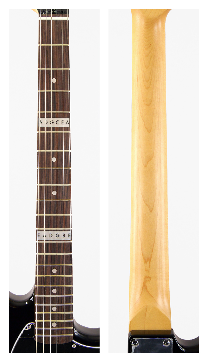 マッチングのブラックカラーにはブラックのピックガードを搭載。また、5 & 12フレットにはMotoがデザインしたポジションのノートをアルファベットで表記したユニークなインレイが採用されています。
