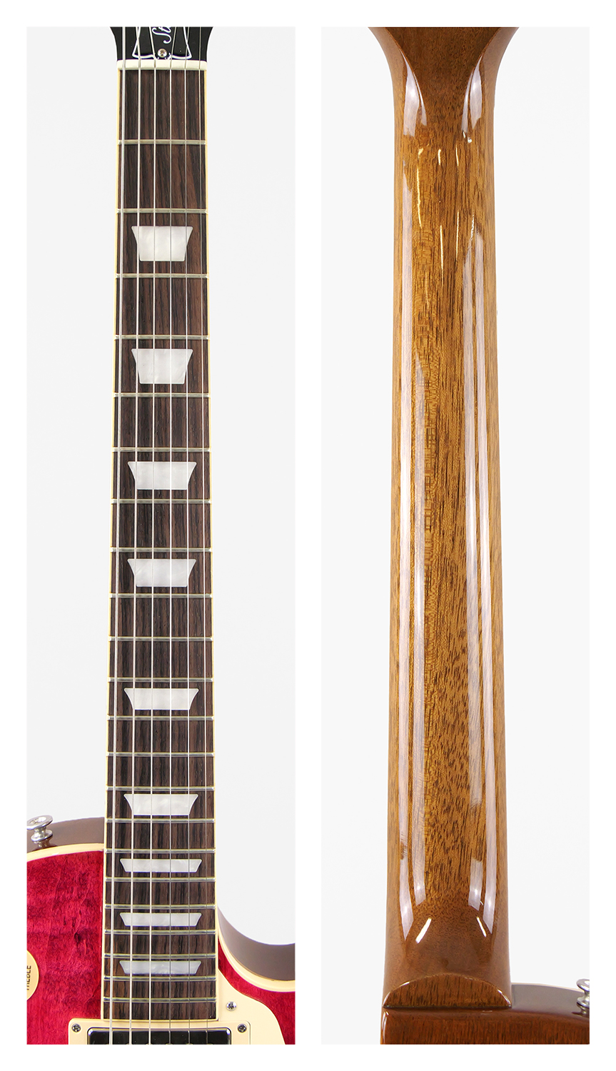 伝統的な工法にこだわり、チェンバー加工のないソリッド構造を採用。レスポールらしい豊かなサスティンと、深く粘りのある極上のサウンドを実現します。